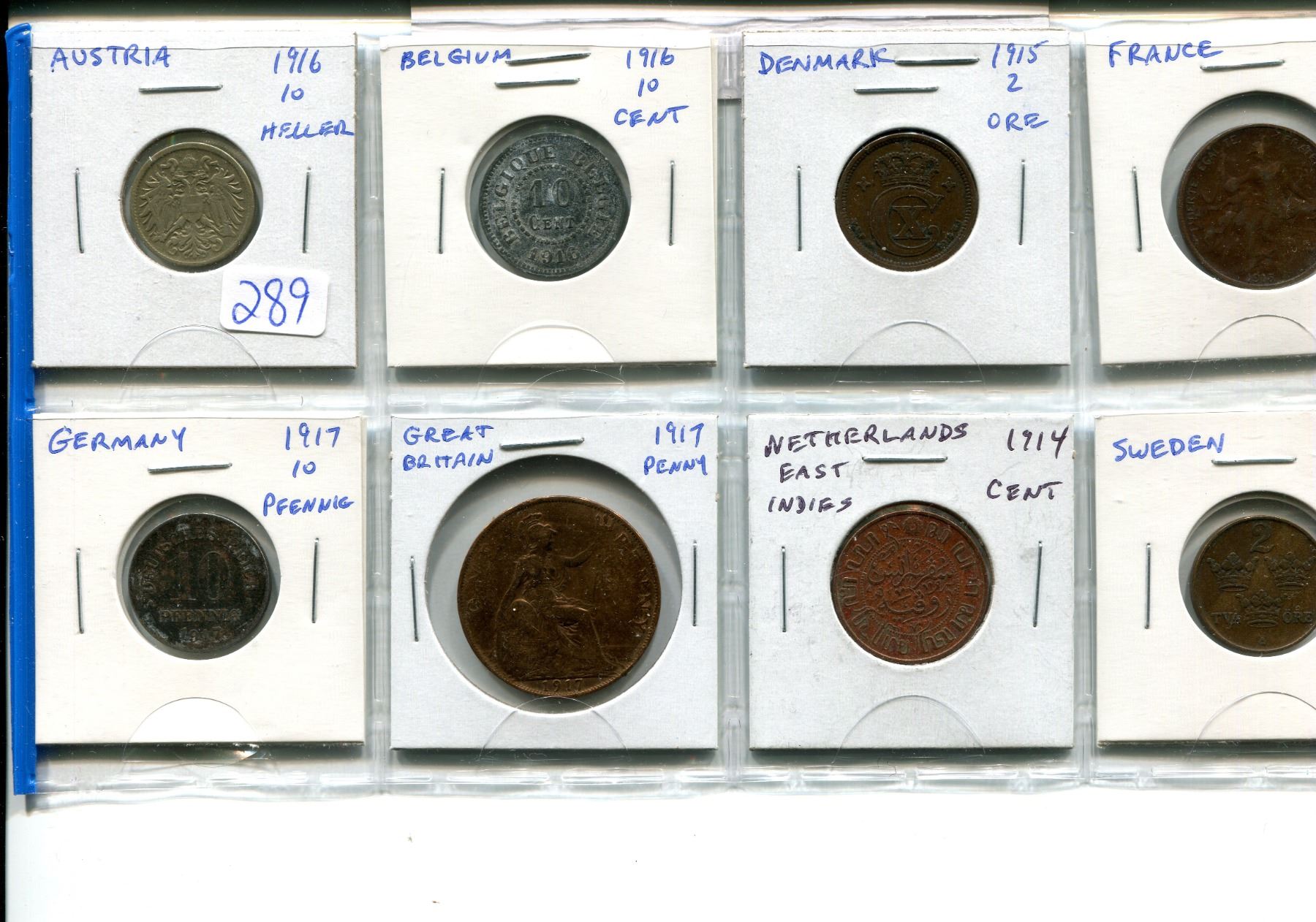 Lot of 8 World War I Coins 1914 -1917. Includes Austria, Belgium, Denmark, France, Germany, Great Britain, Netherlands East Indies, & Sweden.