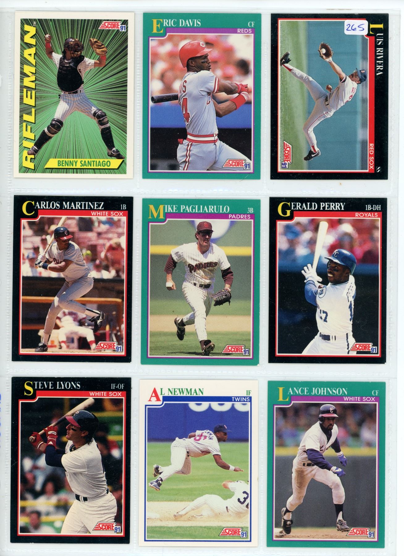 Lot of 9 Baseball Sports Cards featuring Benny Santiago, Eric Davis, Luis Rivera, Carlos Martinez, Mike Pagliarulo, Gerald Perry, Steve Lyons, Al Newman & Lance Johnson. All are 1991 Score. Mint.