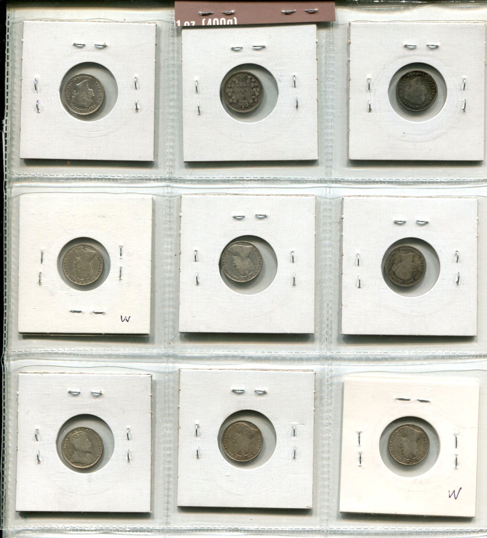 Lot of 9 Canadian Silver 5 Cents 1891 to 1910. From the reigns of Victoria & Edward VII. Includes 1891, 1893, 1896, 1899, 1902, 1904, 1906 Narrow Date, 1907 Narrow Date & 1910 Pointed Holly Leaves with Cross/Bow Tie. Coins grade VG-8 to F-12.