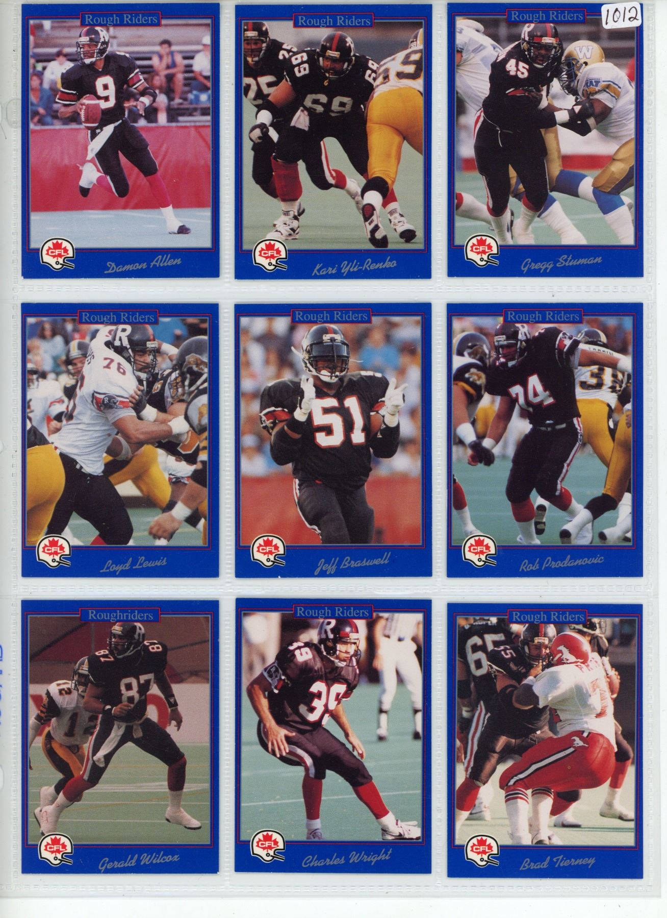 Lot of 9 Ottawa Rough Riders CFL Football Cards. Includes Damon Allen, Kari Yli-Renko, Gregg Stuman, Loyd Lewis, Jeff Braswell, Rob Prodanovic, Gerald Wilcox, Charles Wright & Brad Tierney. 1991 Jogo. Mint.