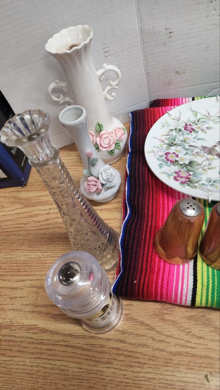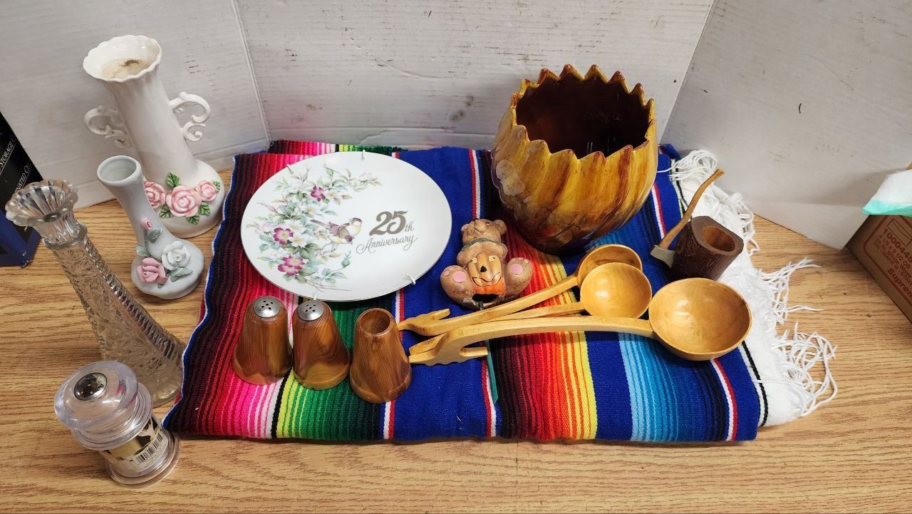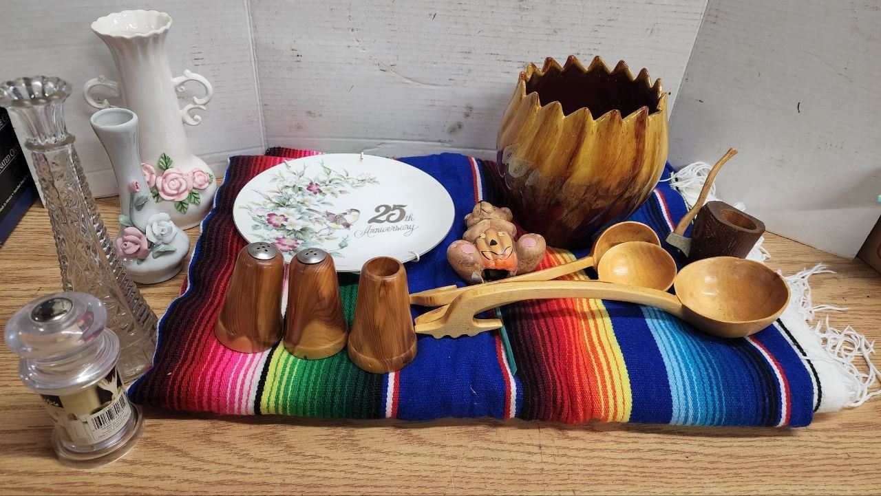 Lot of Assorted Housewares, Vases, Decorative Plate, Wooden Spoons, etc