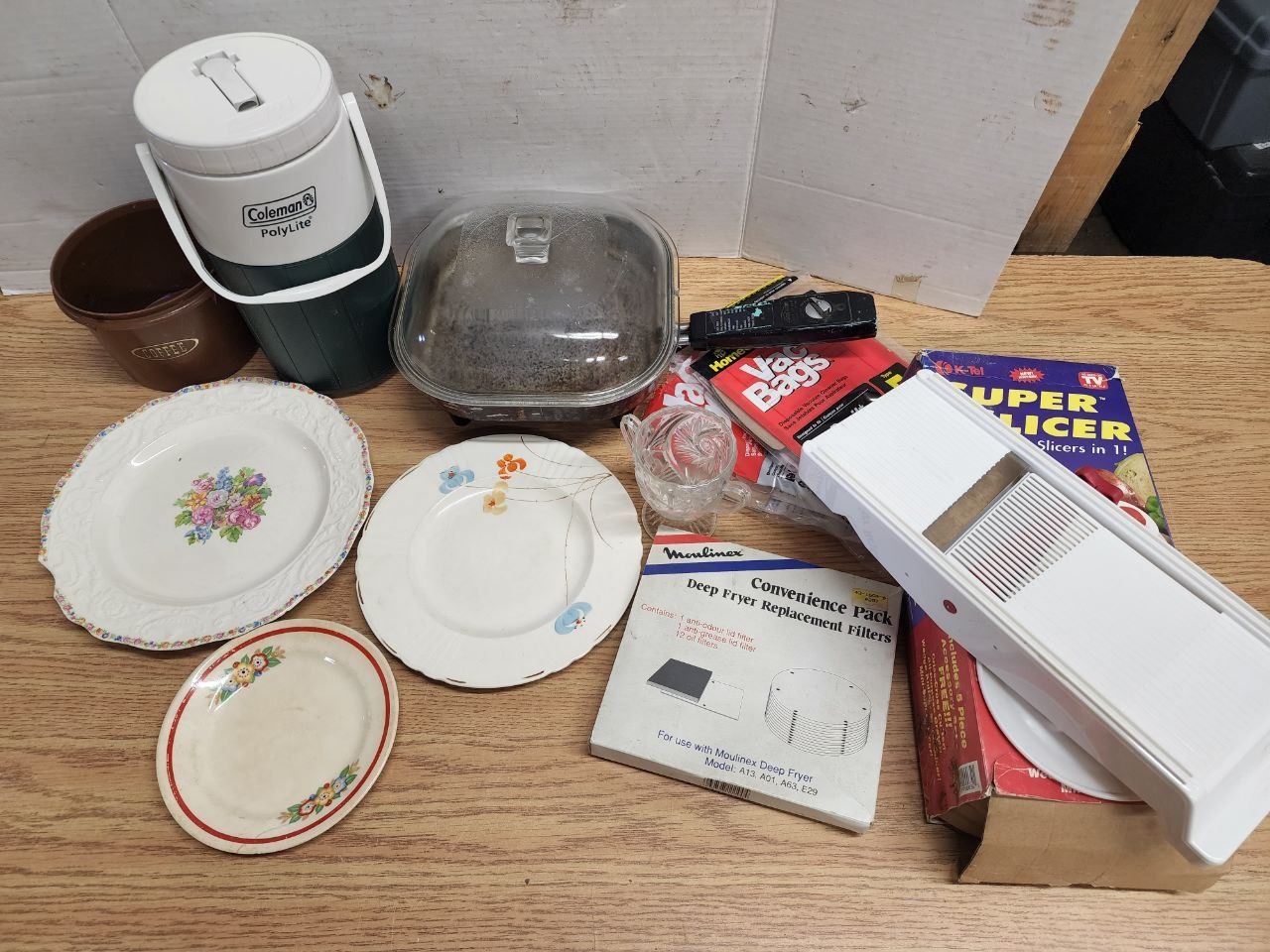 Lot of Assorted Kitchen Items, Super Slicer, Plates, Frying Pan, etc