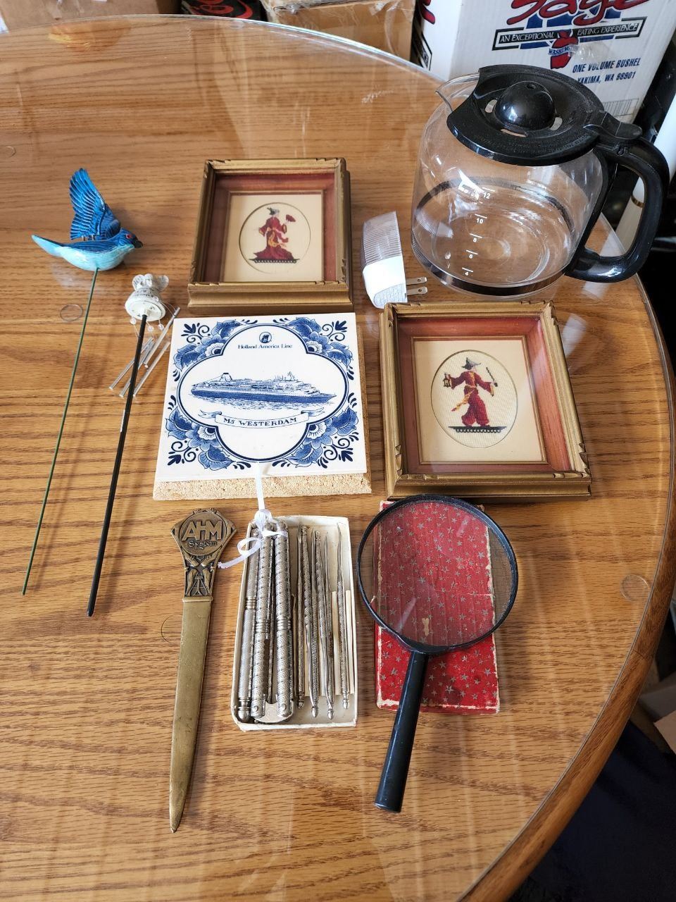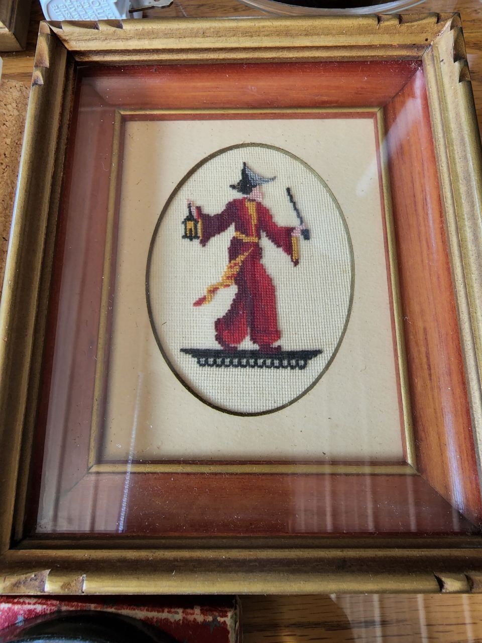 Lot of Assorted Pictures and Household Items, Embroidered Pictures, Ceramic Plaque, Nut Crackers, et