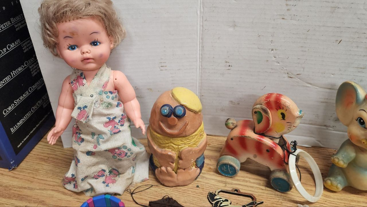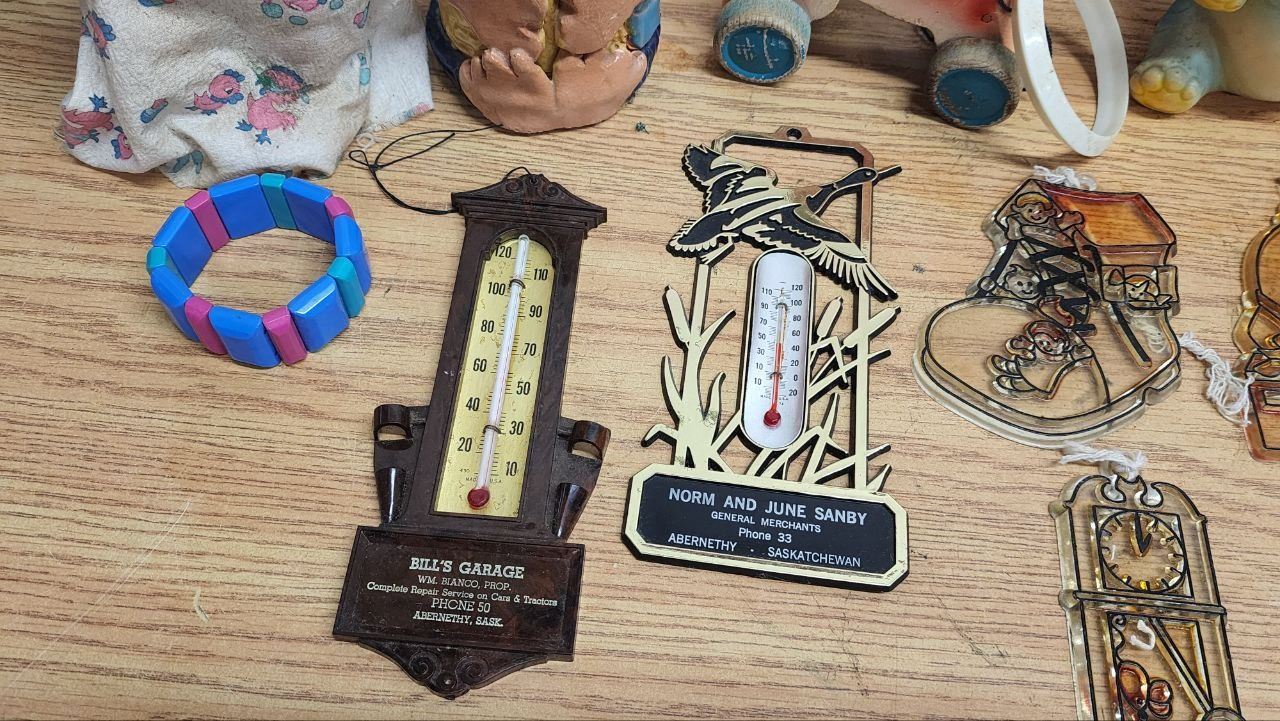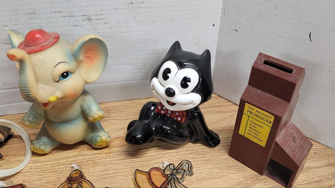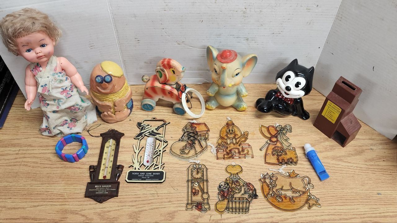 Lot of Assorted Vintage Toys, Piggy Banks and Thermometers