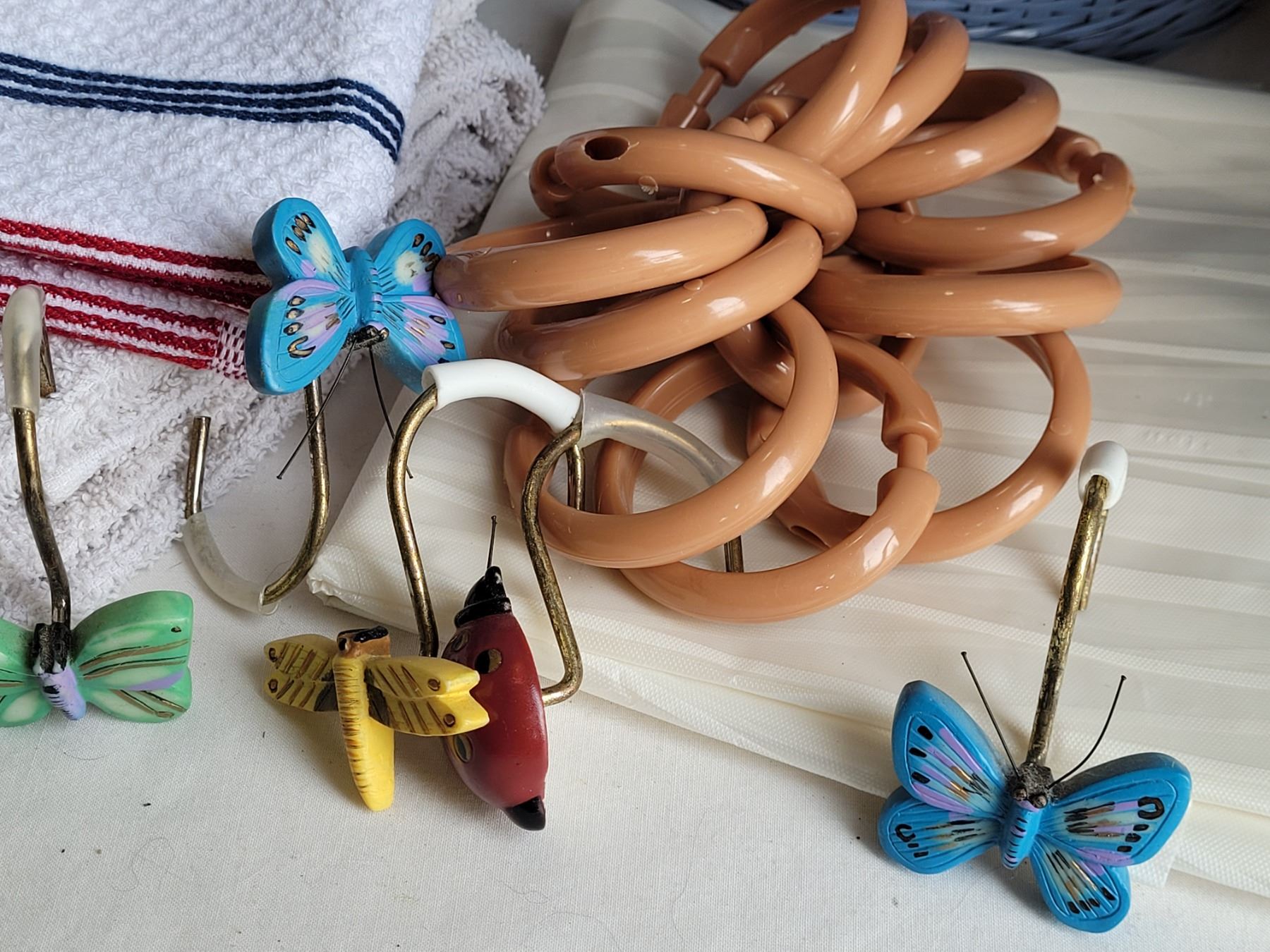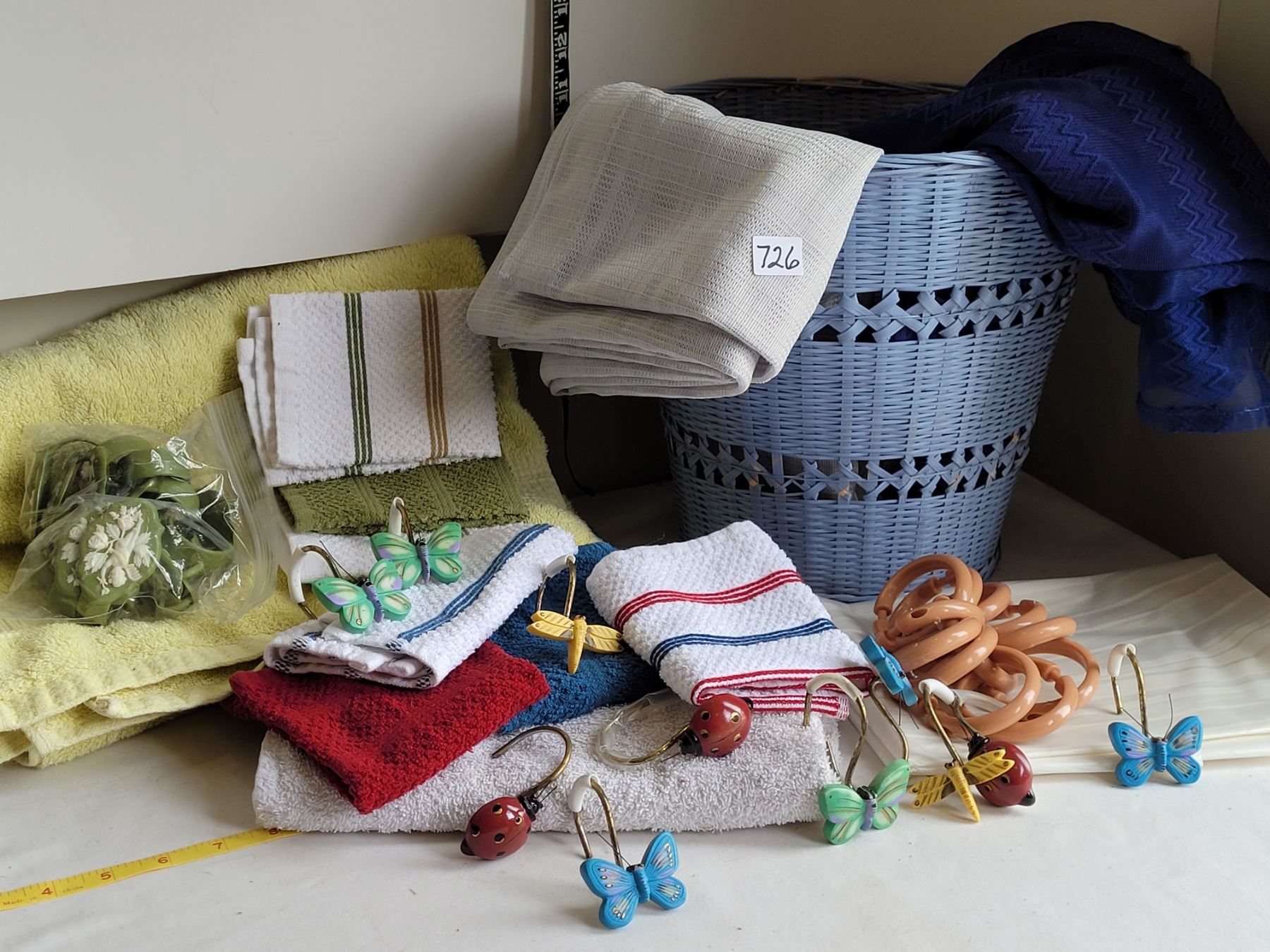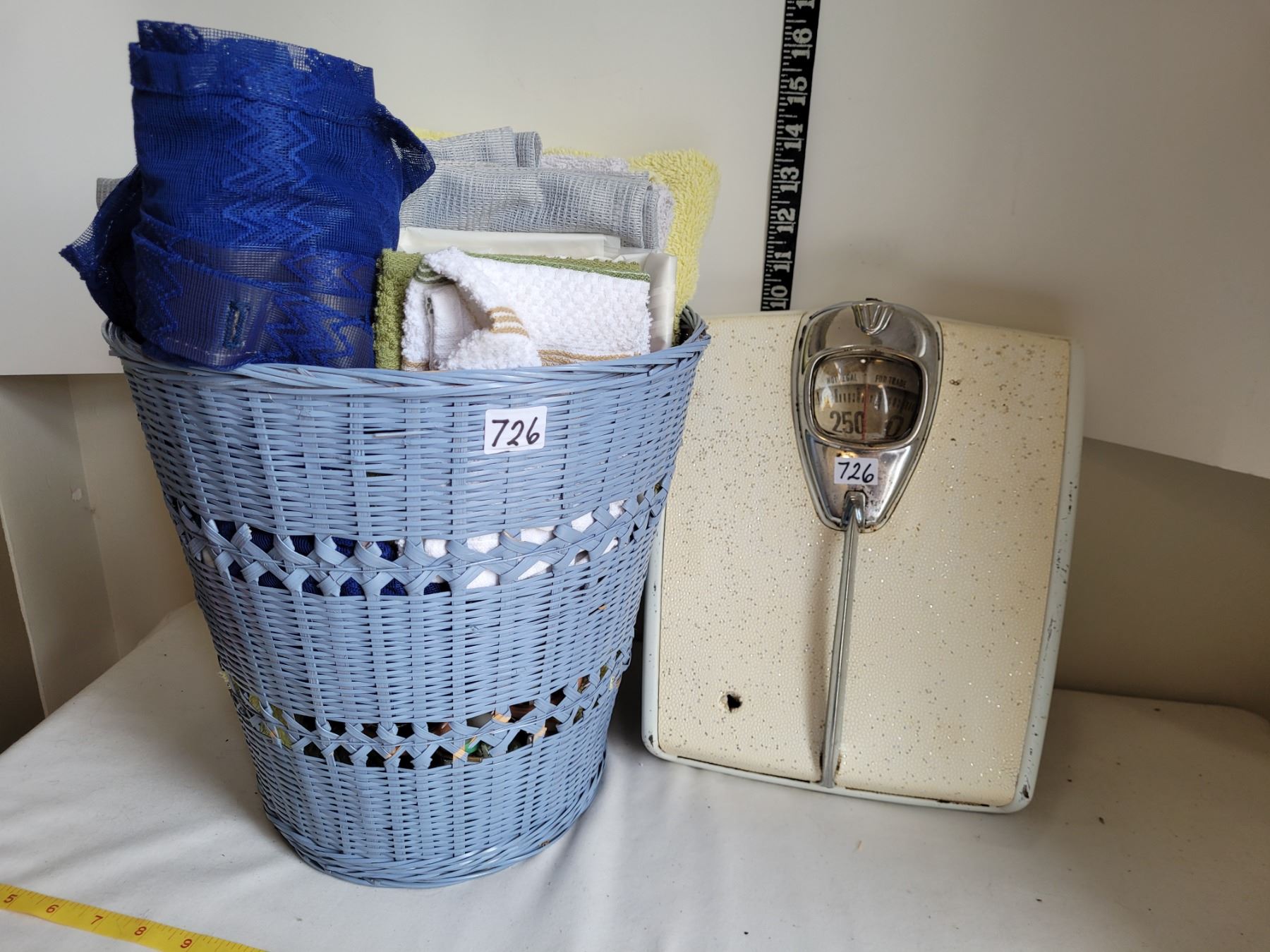 Lot of Bath accessories. Teco Master Scale, vinyl & cloth shower curtains. Vintage & novelty hooks, wicker waste basket & towels.