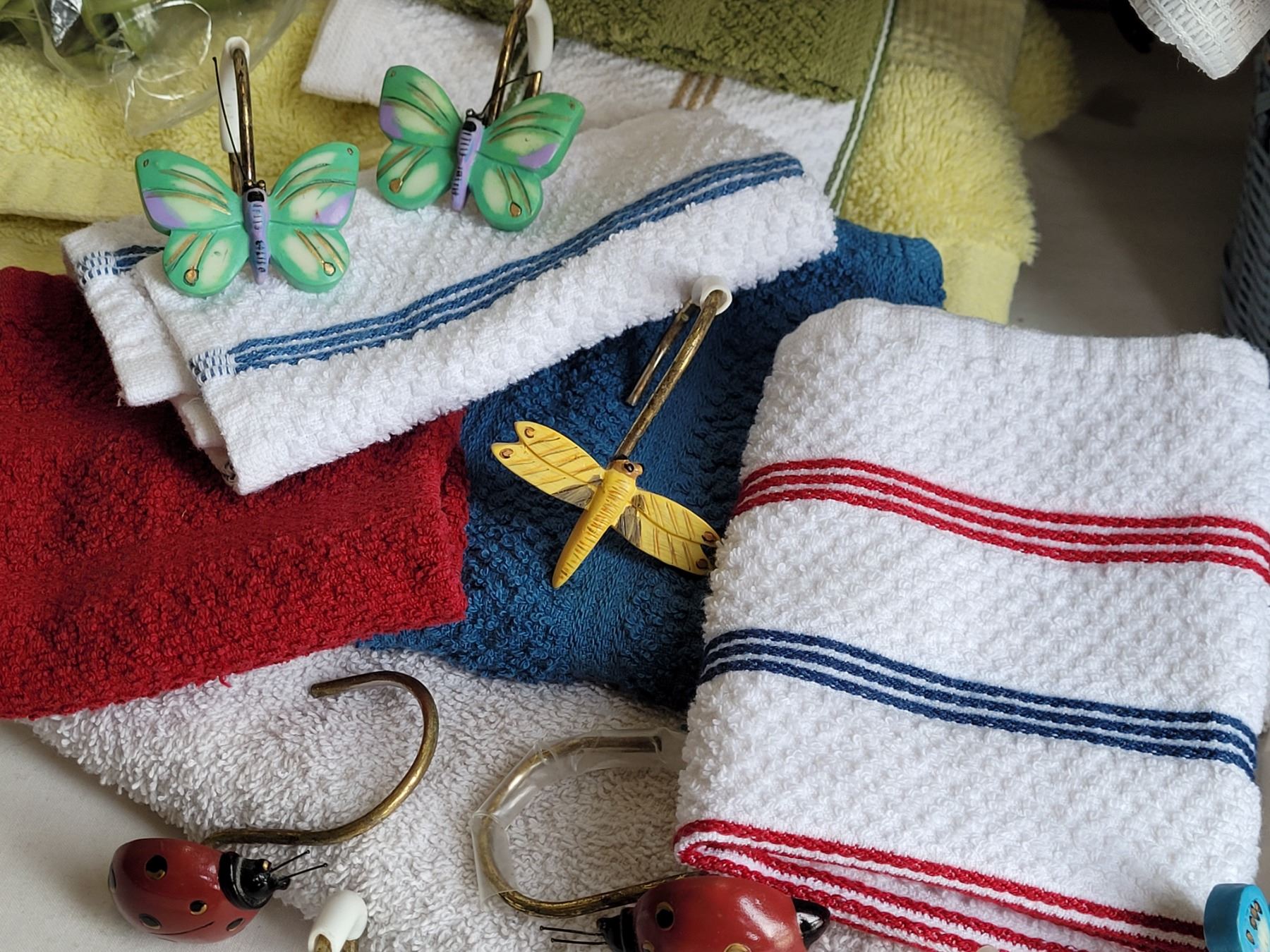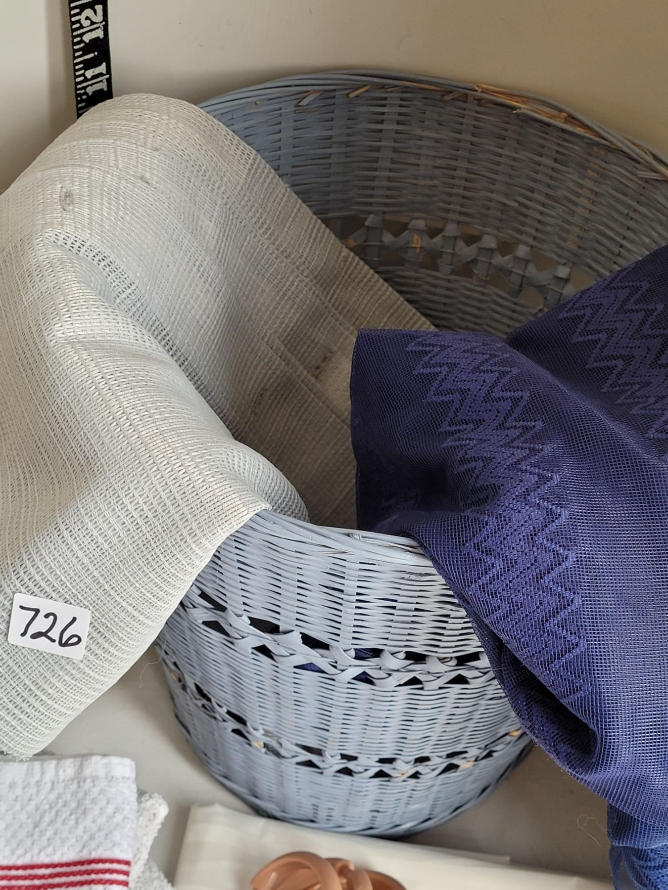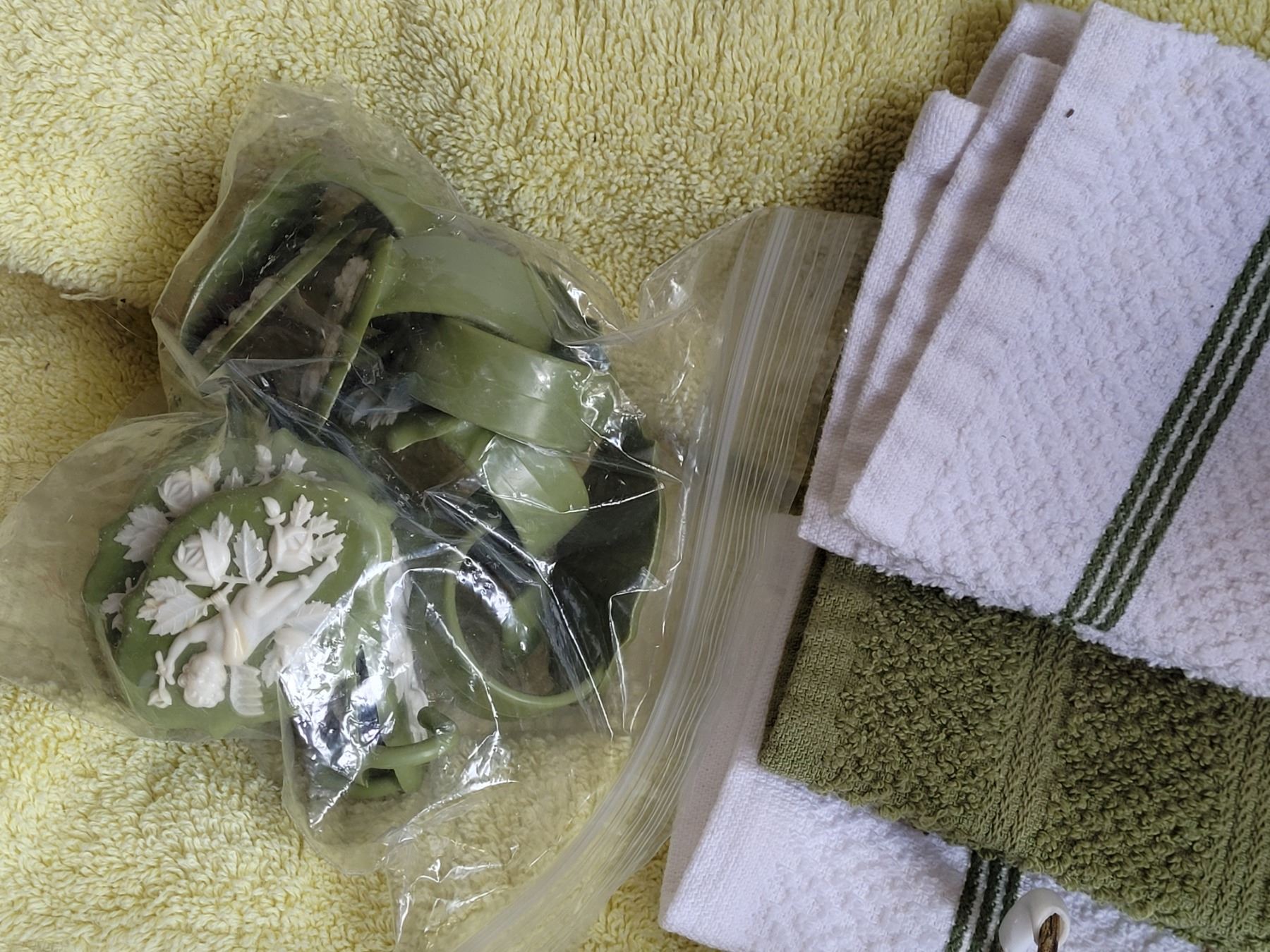 Lot of Bath accessories. Teco Master Scale, vinyl & cloth shower curtains. Vintage & novelty hooks, wicker waste basket & towels.