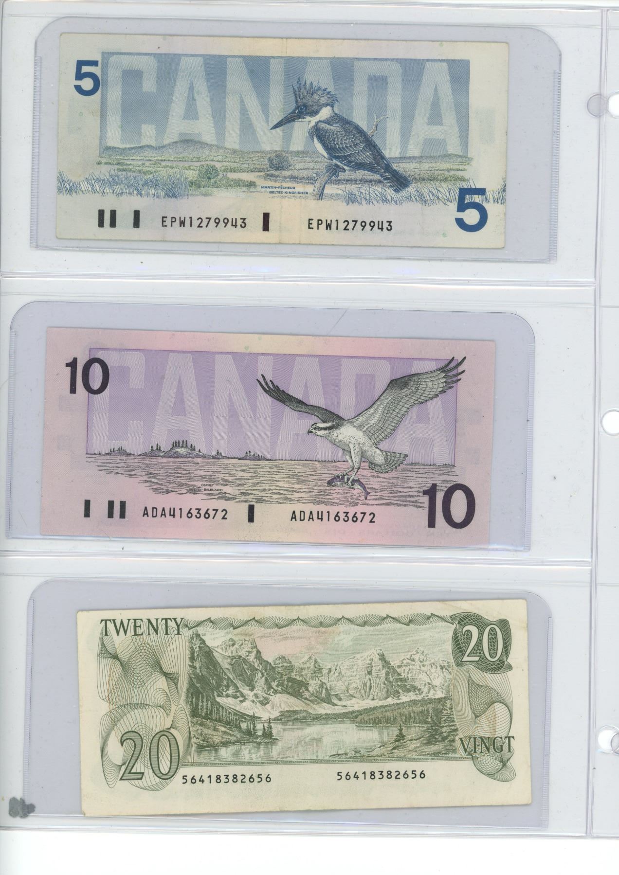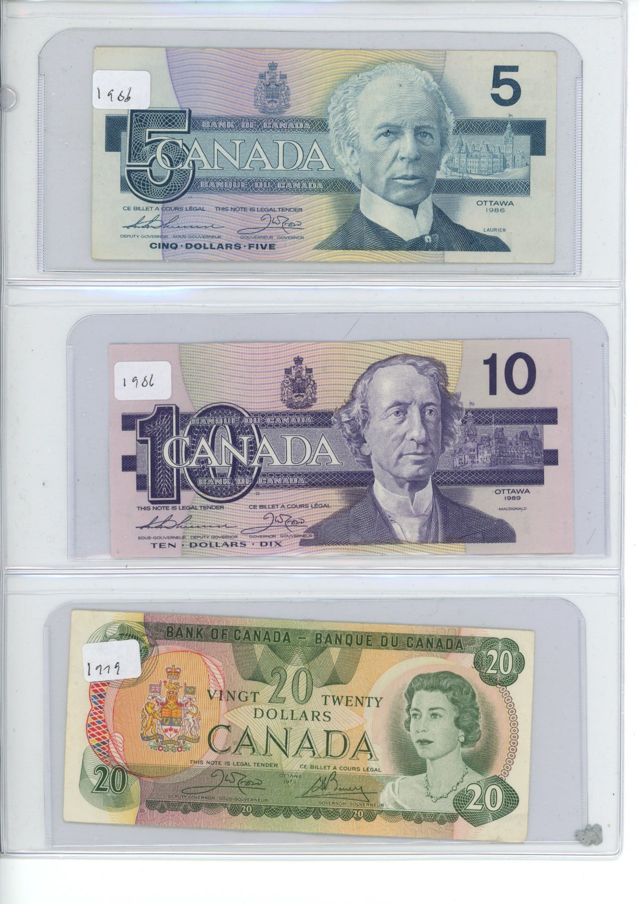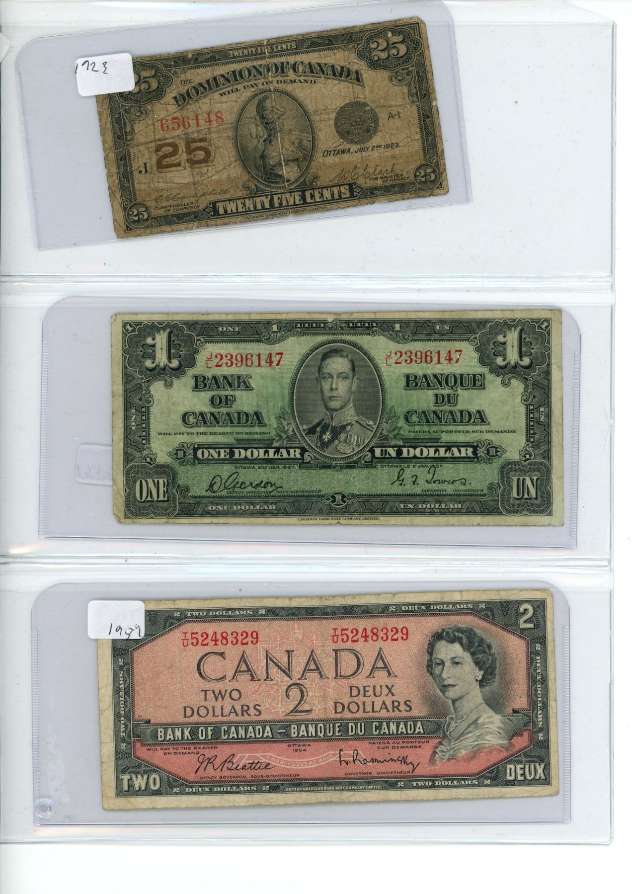 Lot of Canadian Bills - 1923 25 cent shinplaster, 1937 1 dollar bill, 1954 2 dollar bill, 1986 5 dollar bill, 1989 10 dollar bill and 1979 20 dollar bill