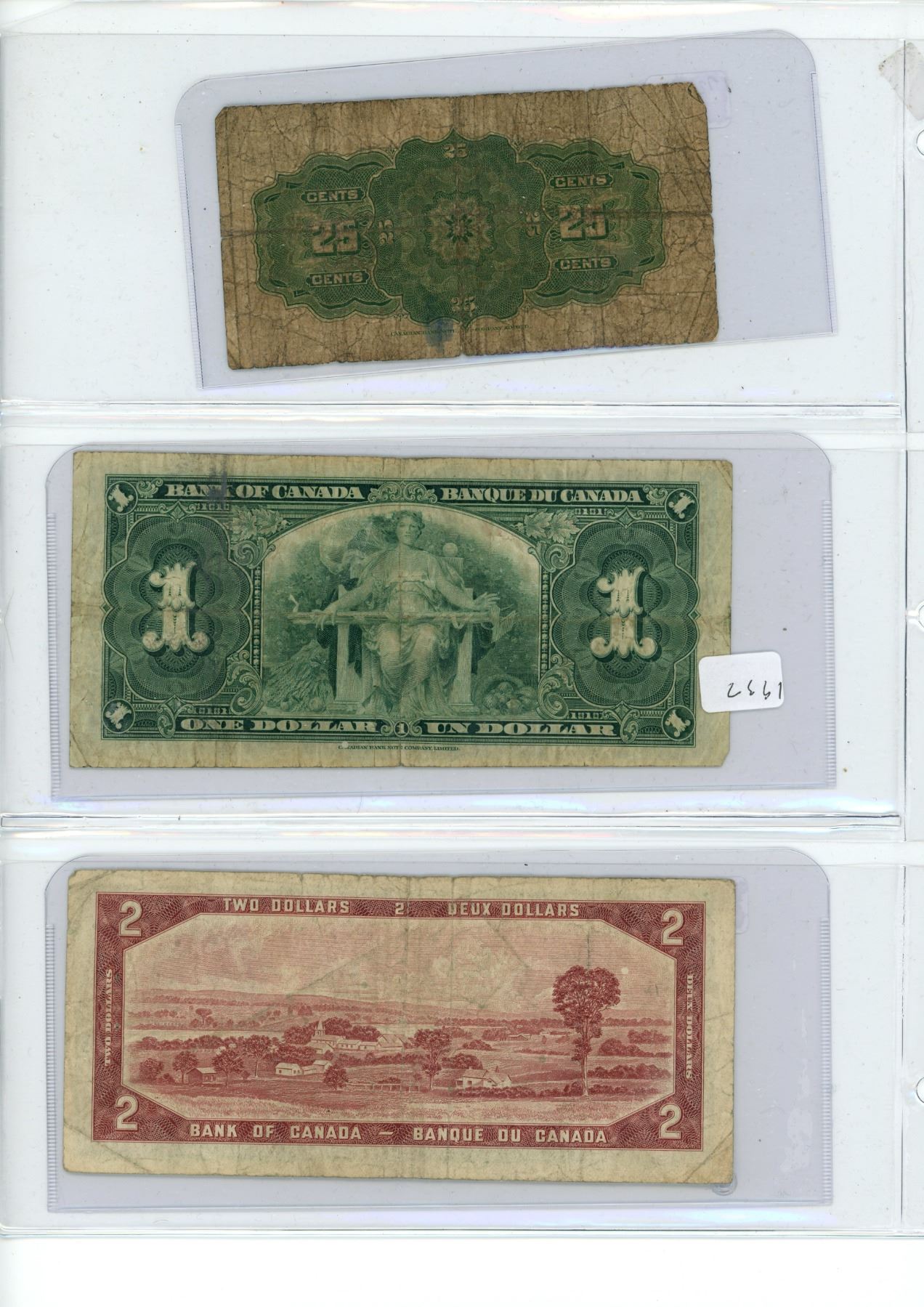 Lot of Canadian Bills - 1923 25 cent shinplaster, 1937 1 dollar bill, 1954 2 dollar bill, 1986 5 dol