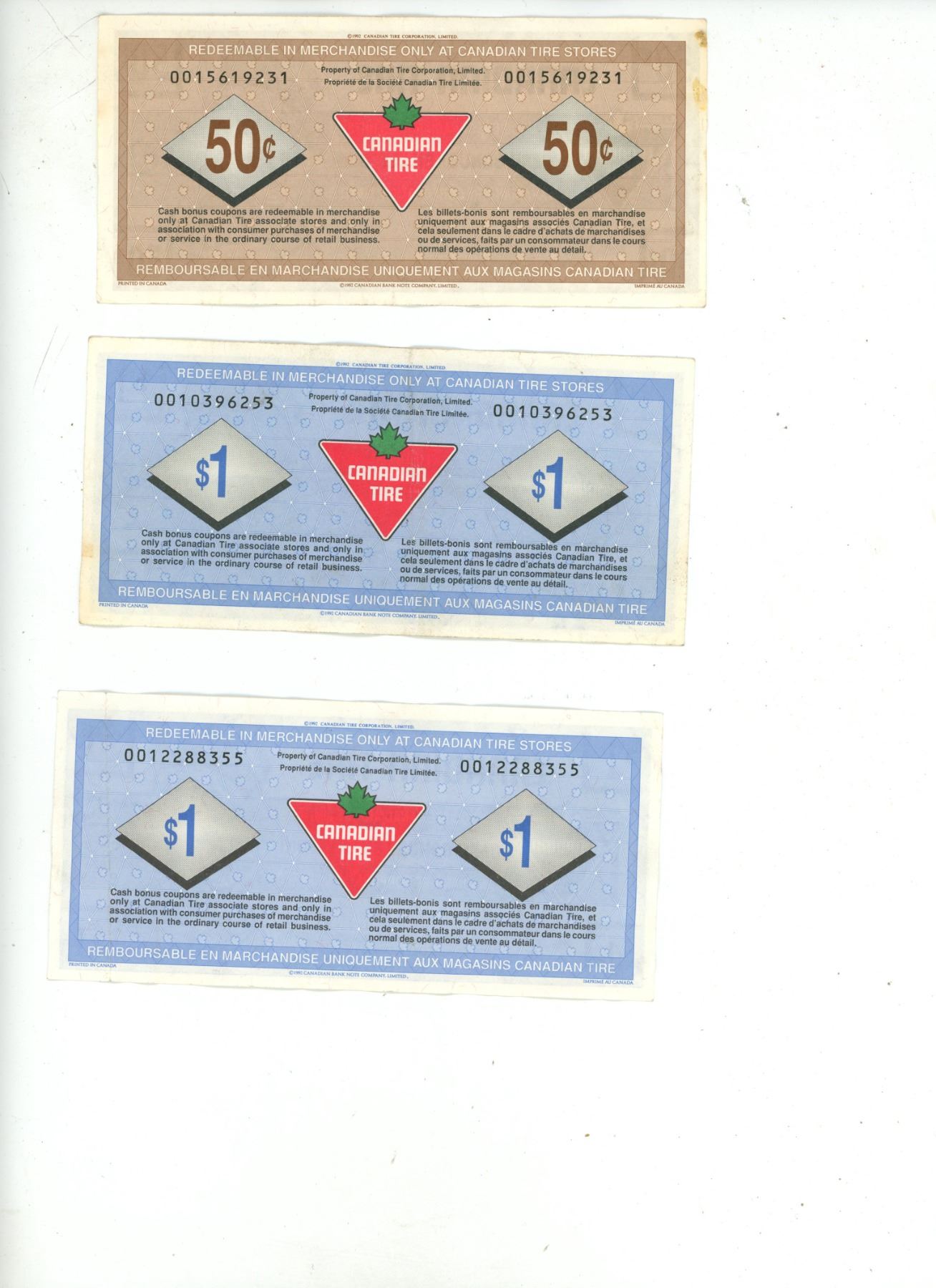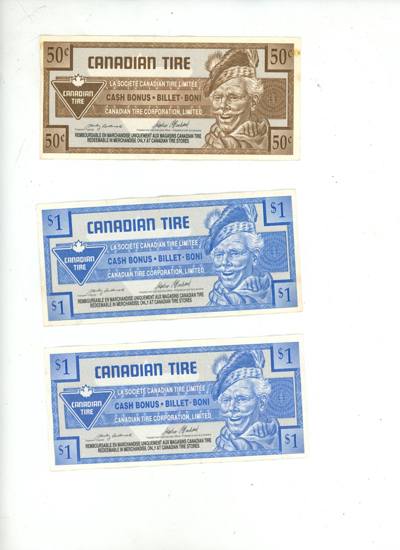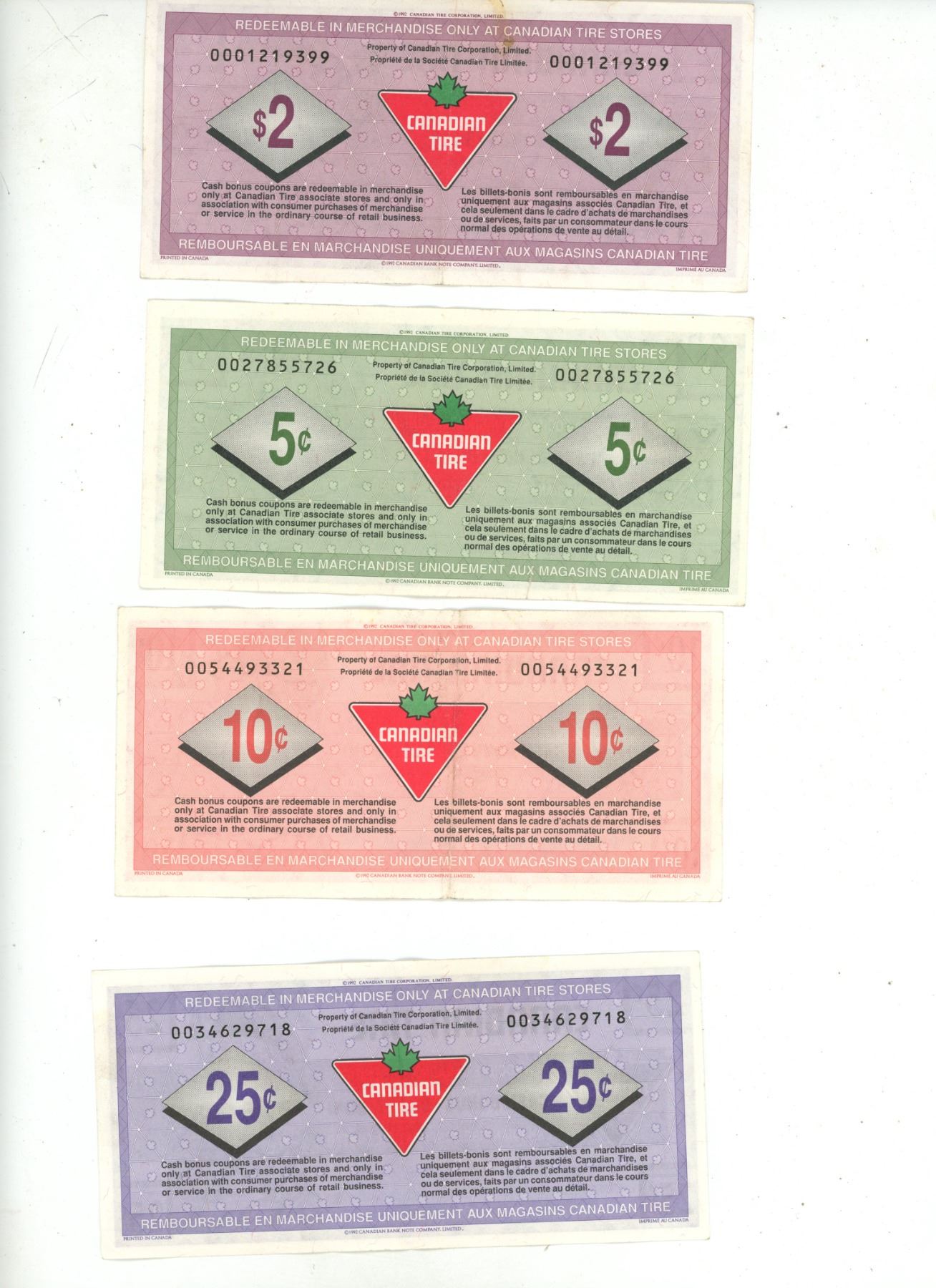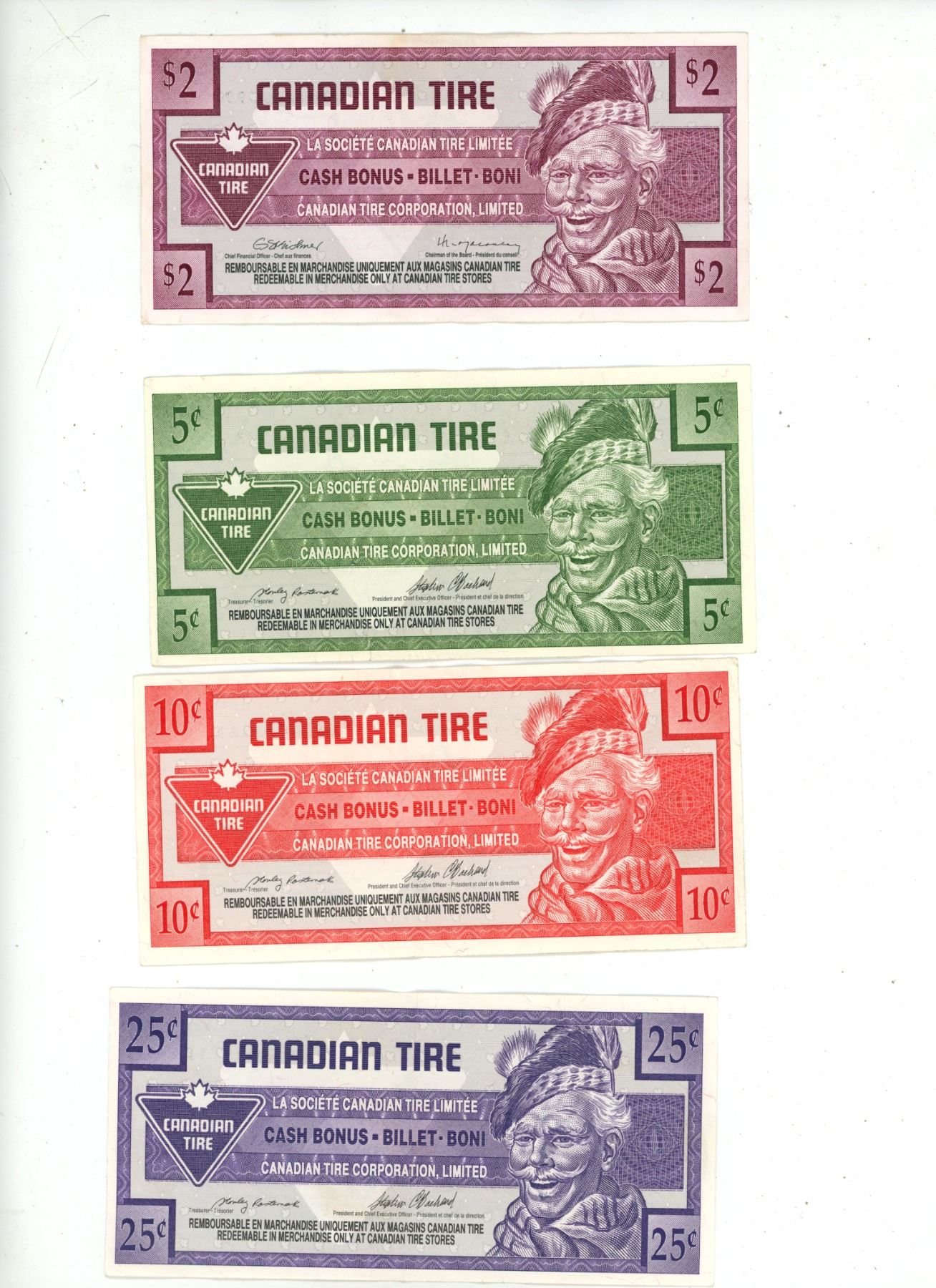 Lot of Canadian Tire Money. (2, 5, 10, 25, 50 Cents and (2) 1 Dollar)