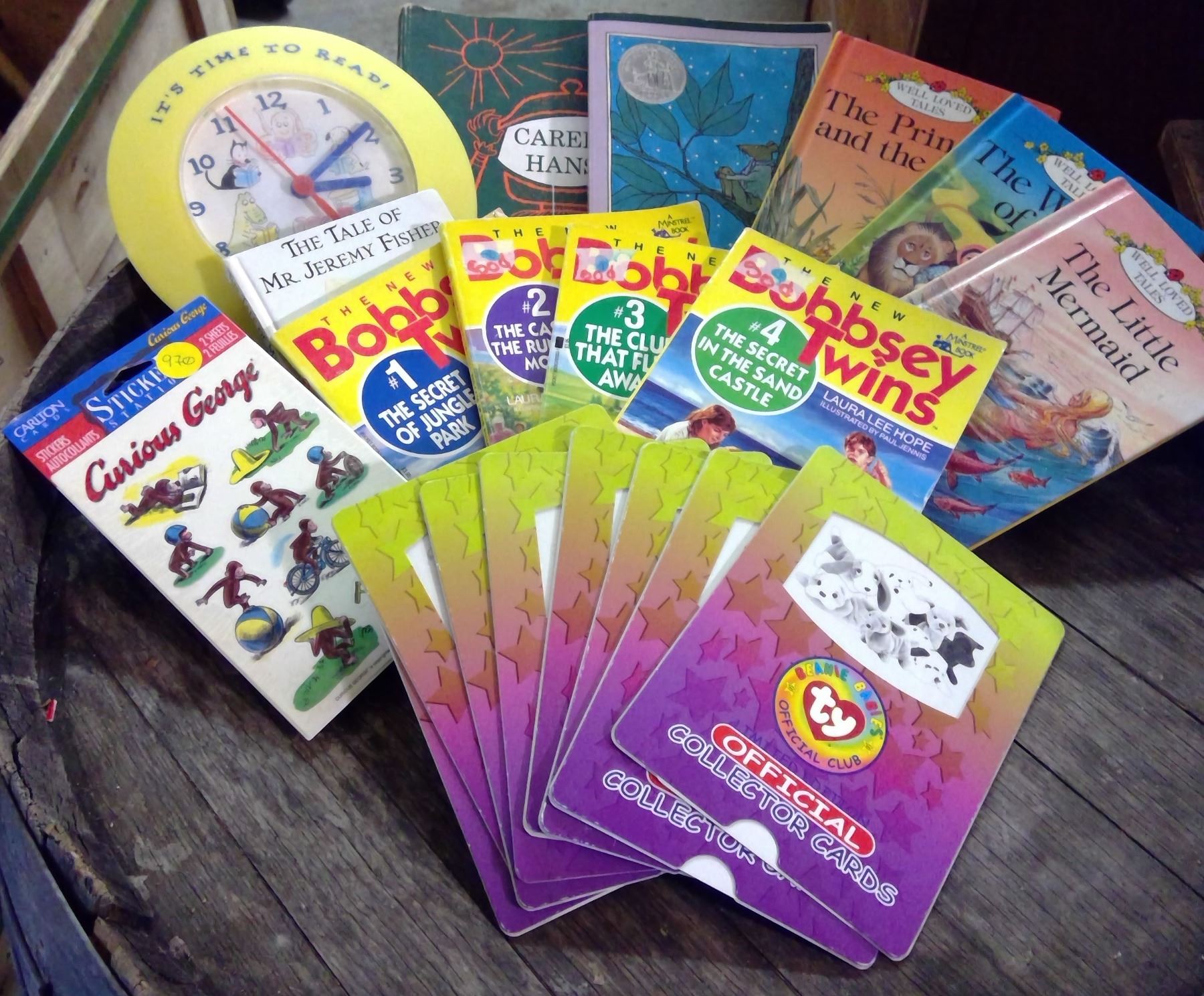 Lot of Children's Books, Beanie Baby Collector Cards, Curious George Stickers + Clock