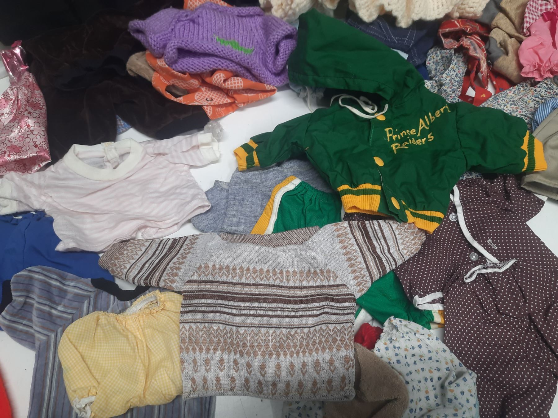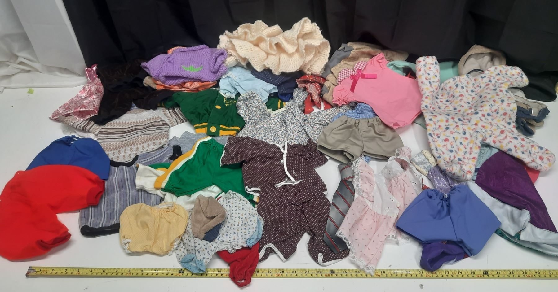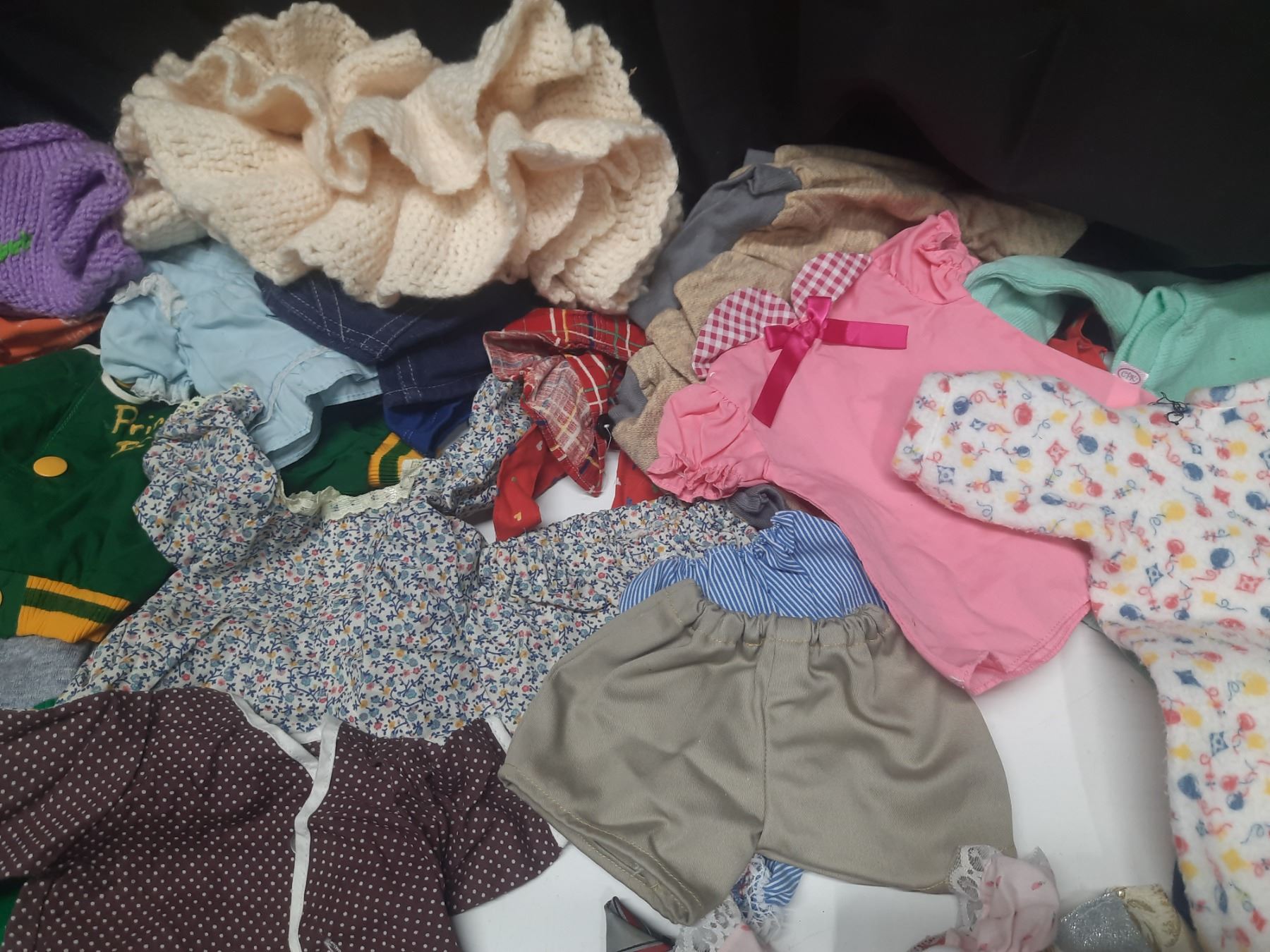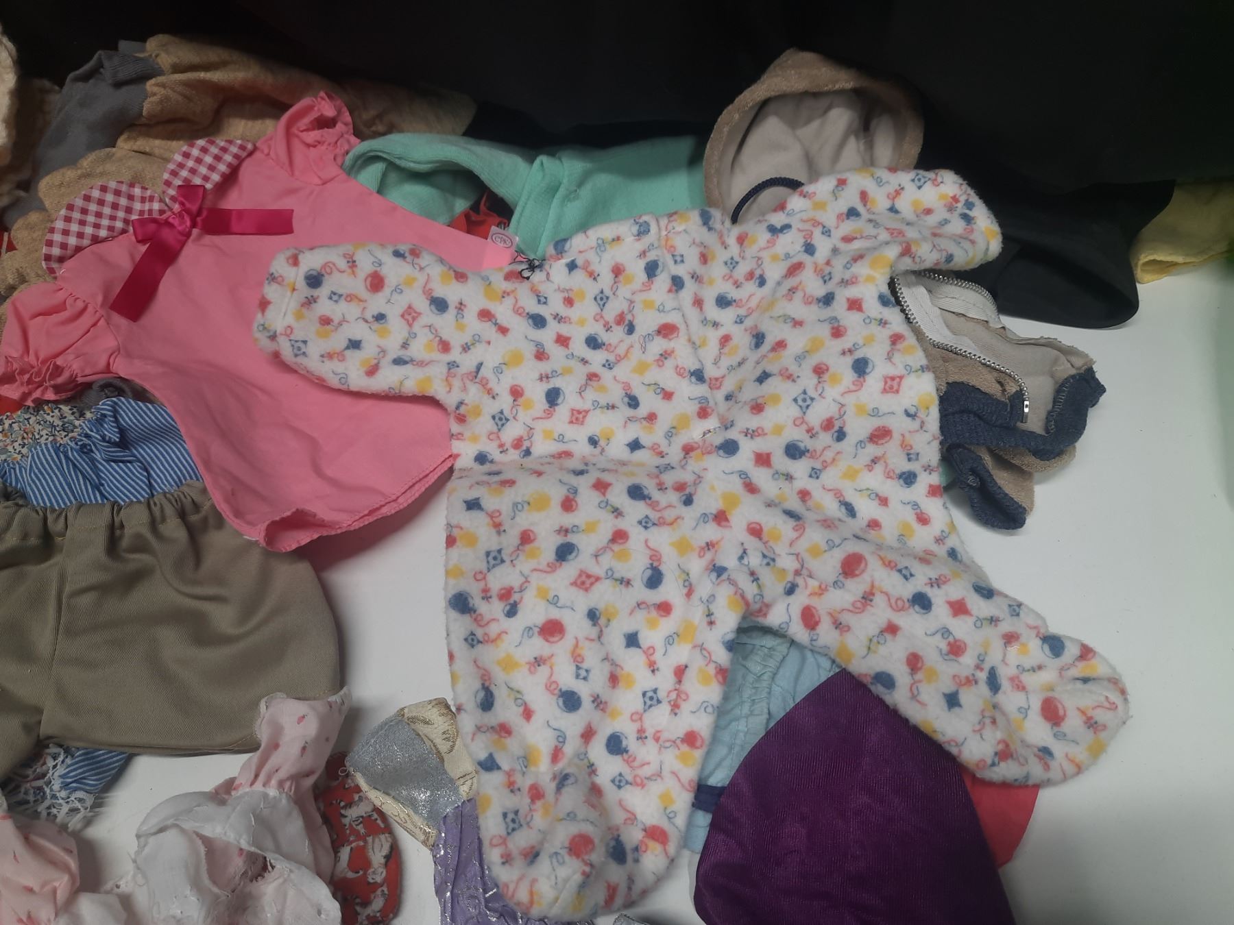 Lot of Doll Clothes of Different Sizes.