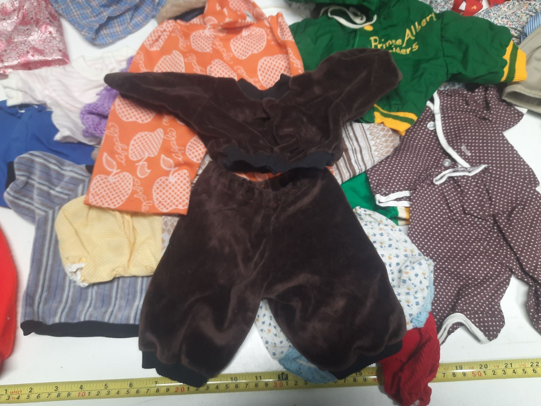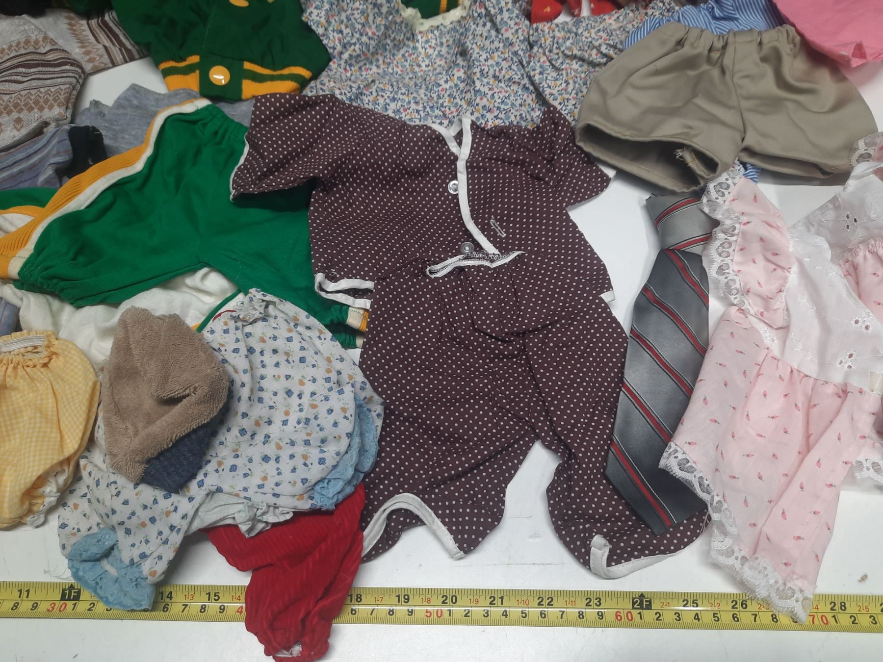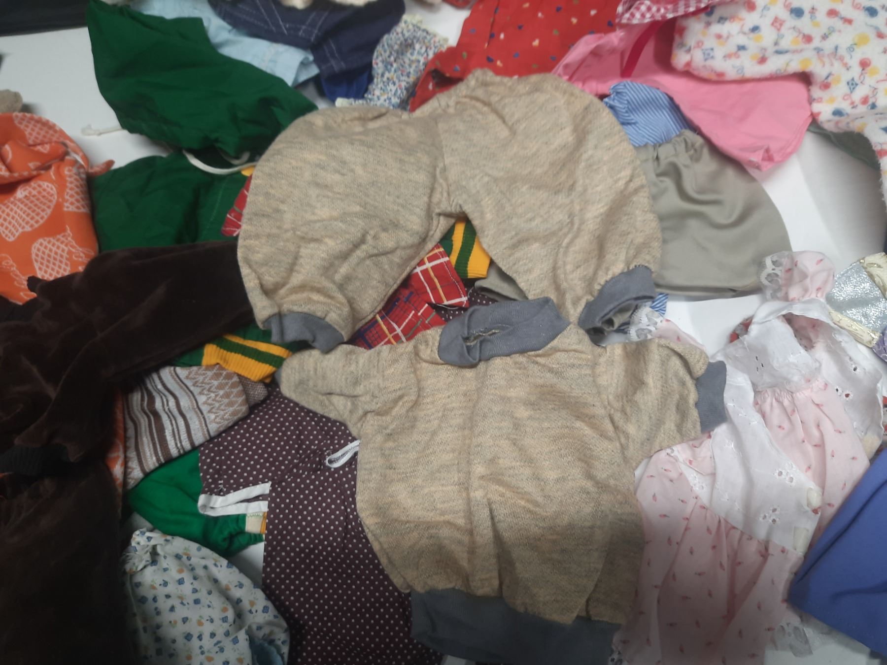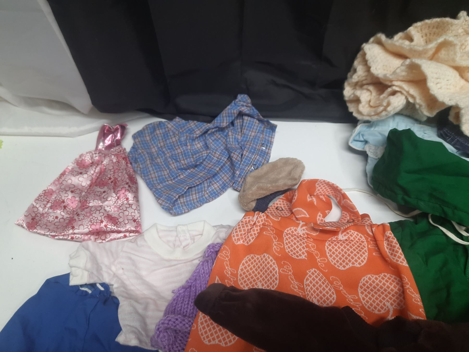 Lot of Doll Clothes of Different Sizes.