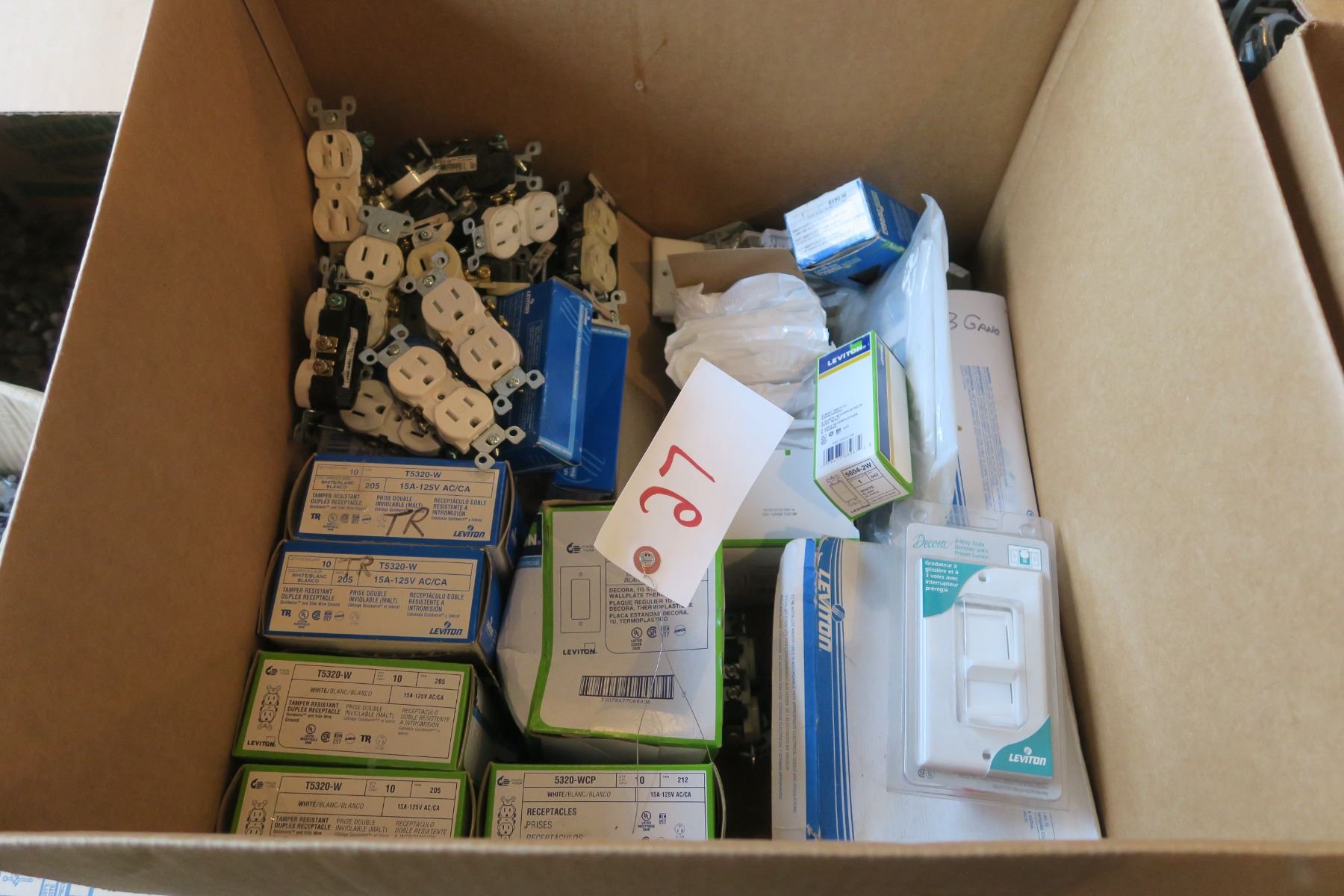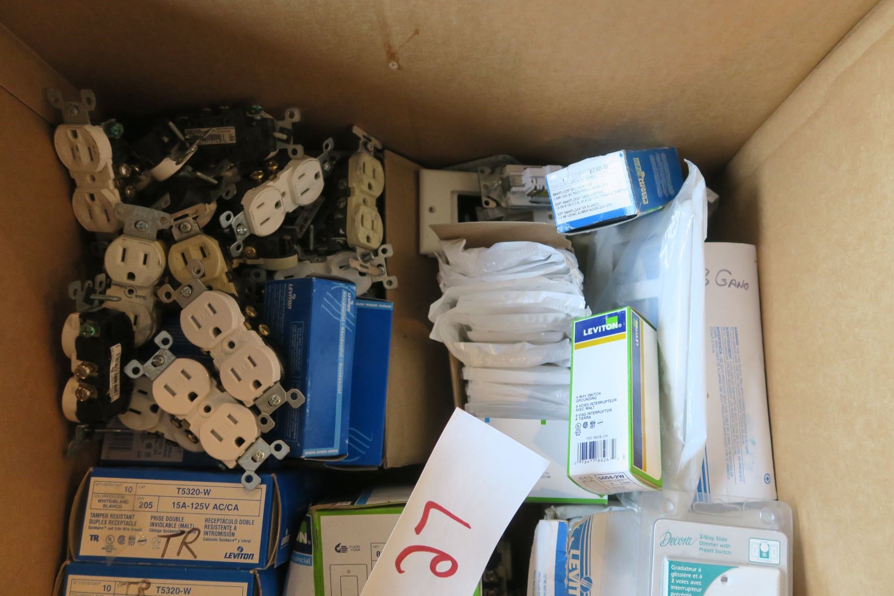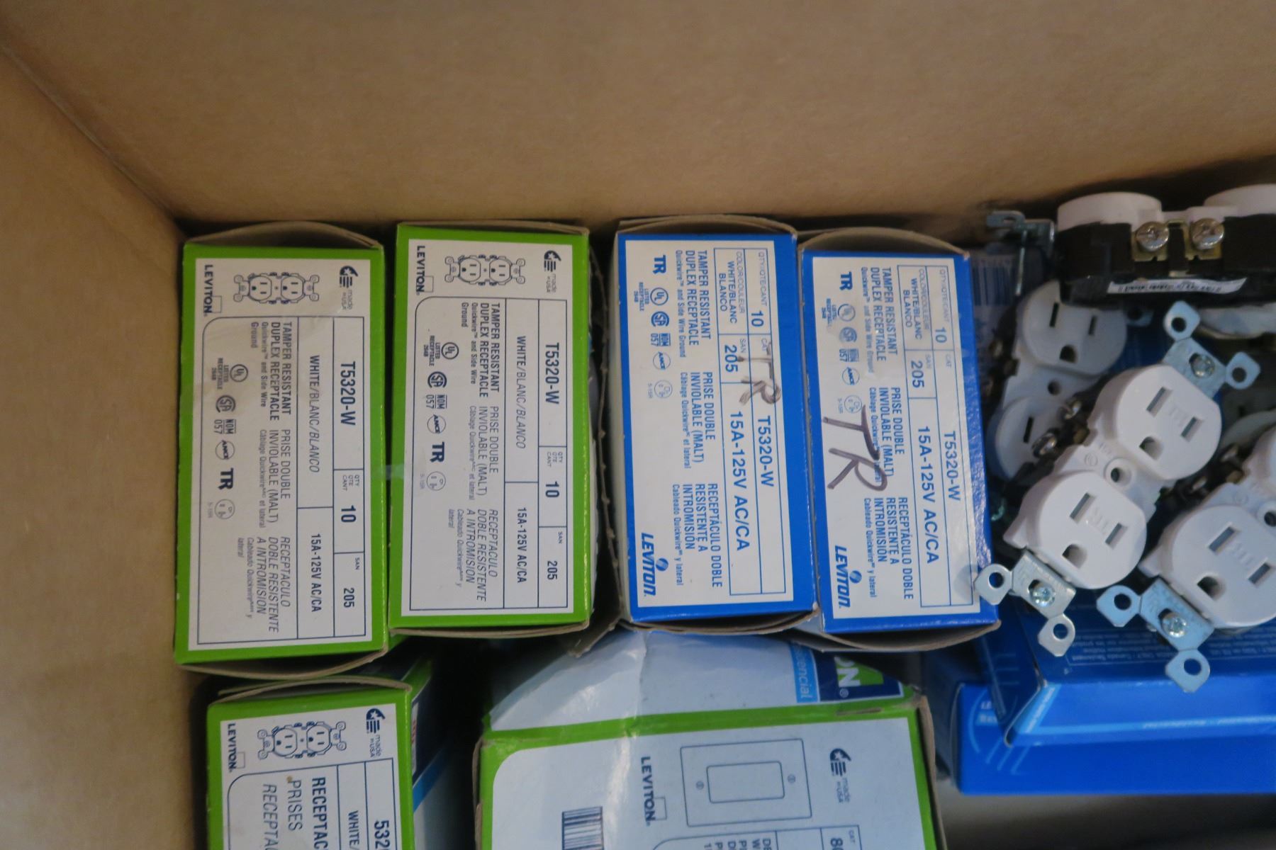 7x 20 Amp TR GFCI, 6x 20amp Tr Décor Receptables, 50x White TR Receptables, 10x Regular 15amp duplex, 2x 3gang Décor Plates, 27x 2gang Décor trim plates, 44x Single gang Décor Trim Plate, 1x 4gang White Décor Plate