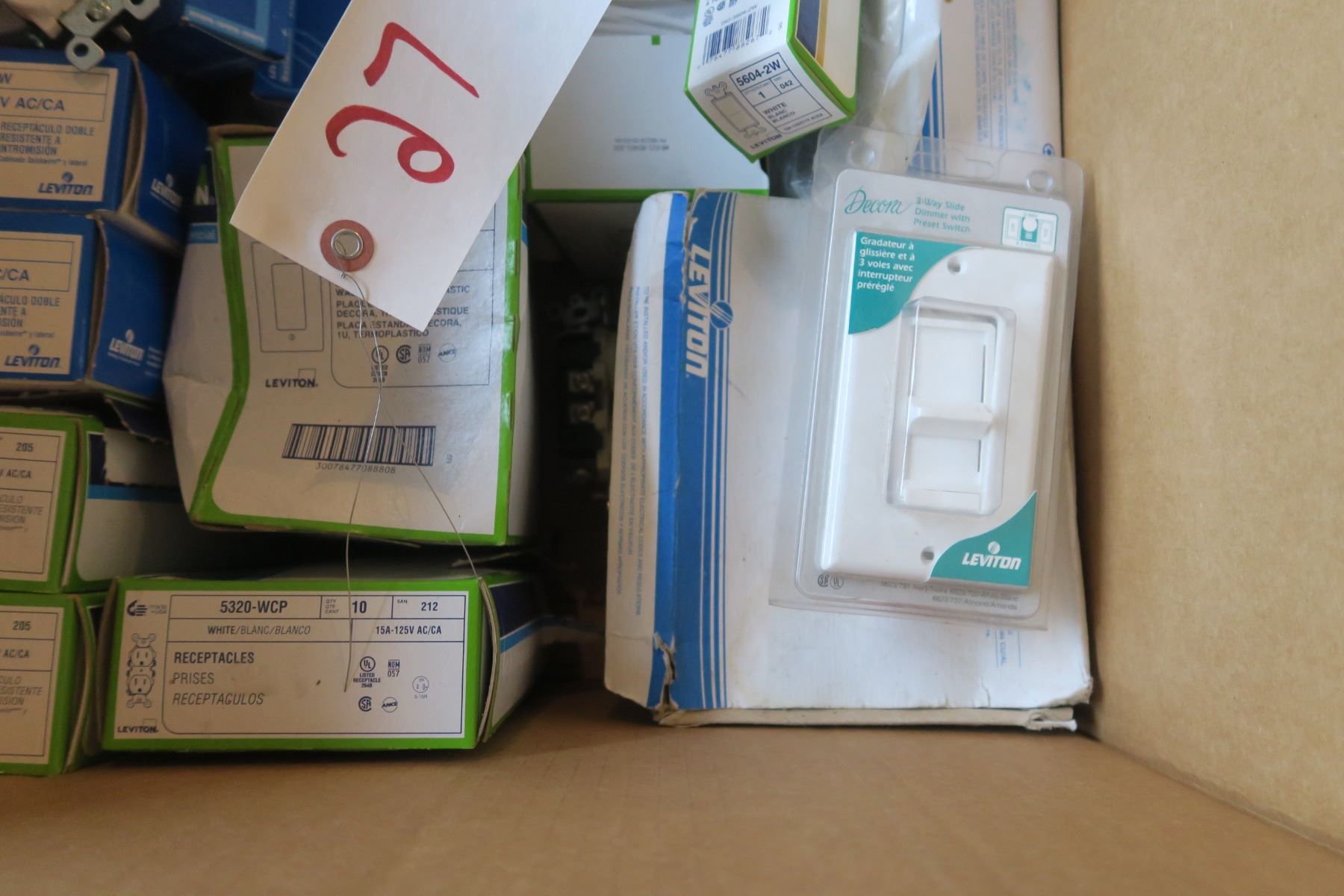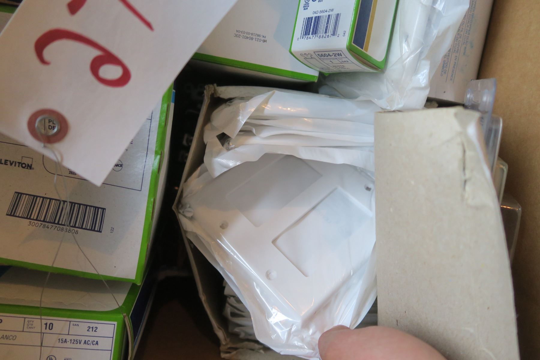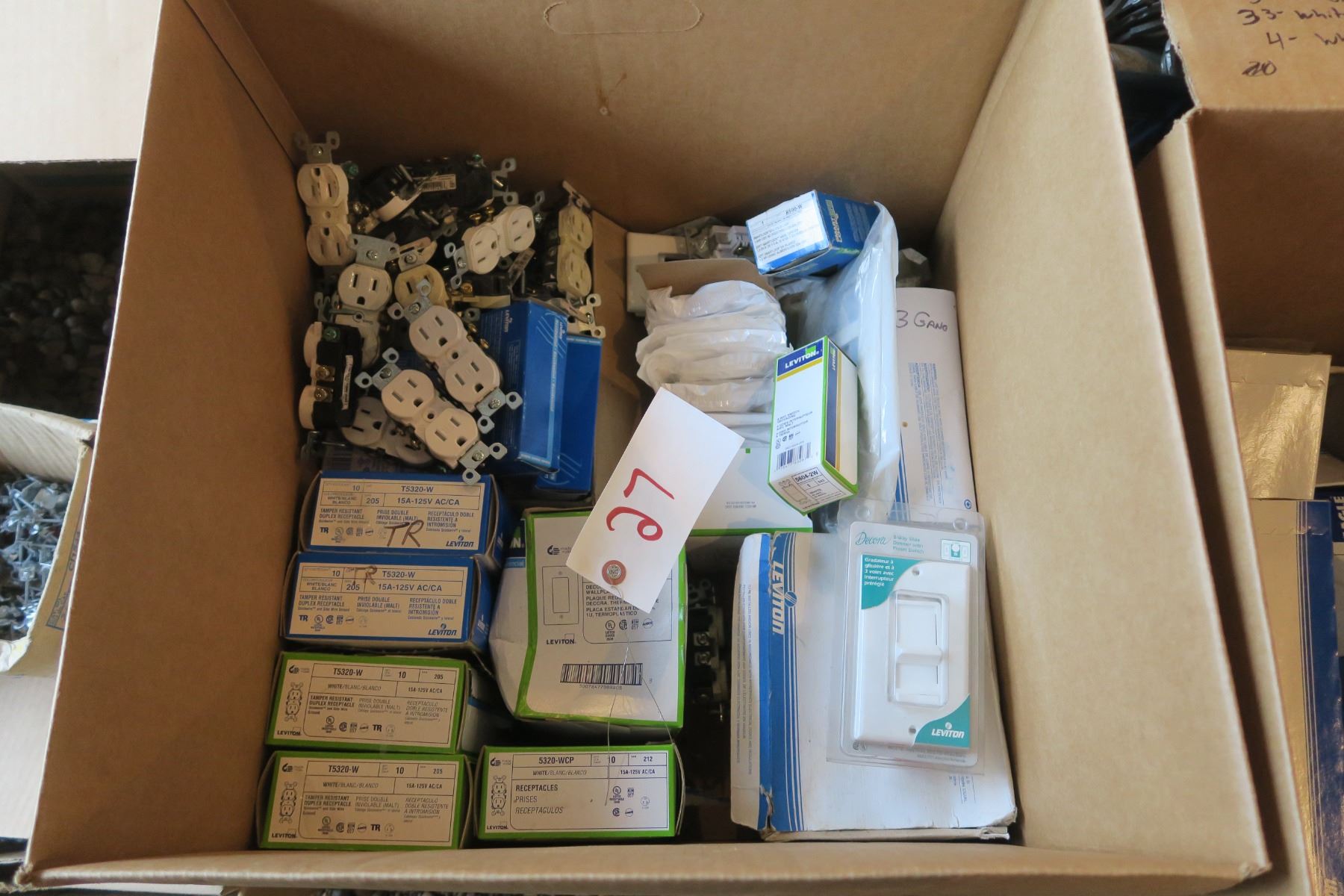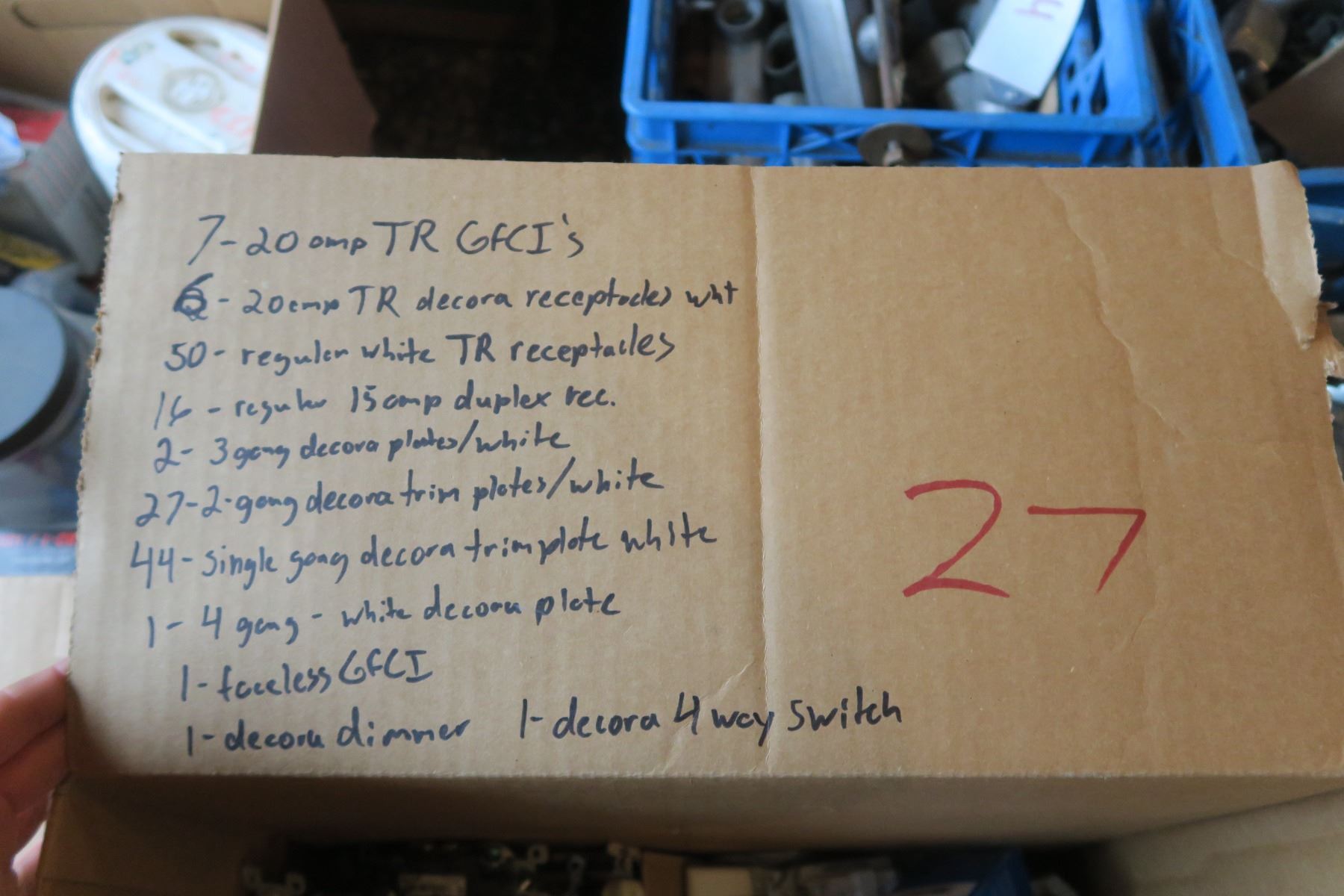 7x 20 Amp TR GFCI, 6x 20amp Tr Décor Receptables, 50x White TR Receptables, 10x Regular 15amp duplex, 2x 3gang Décor Plates, 27x 2gang Décor trim plates, 44x Single gang Décor Trim Plate, 1x 4gang White Décor Plate