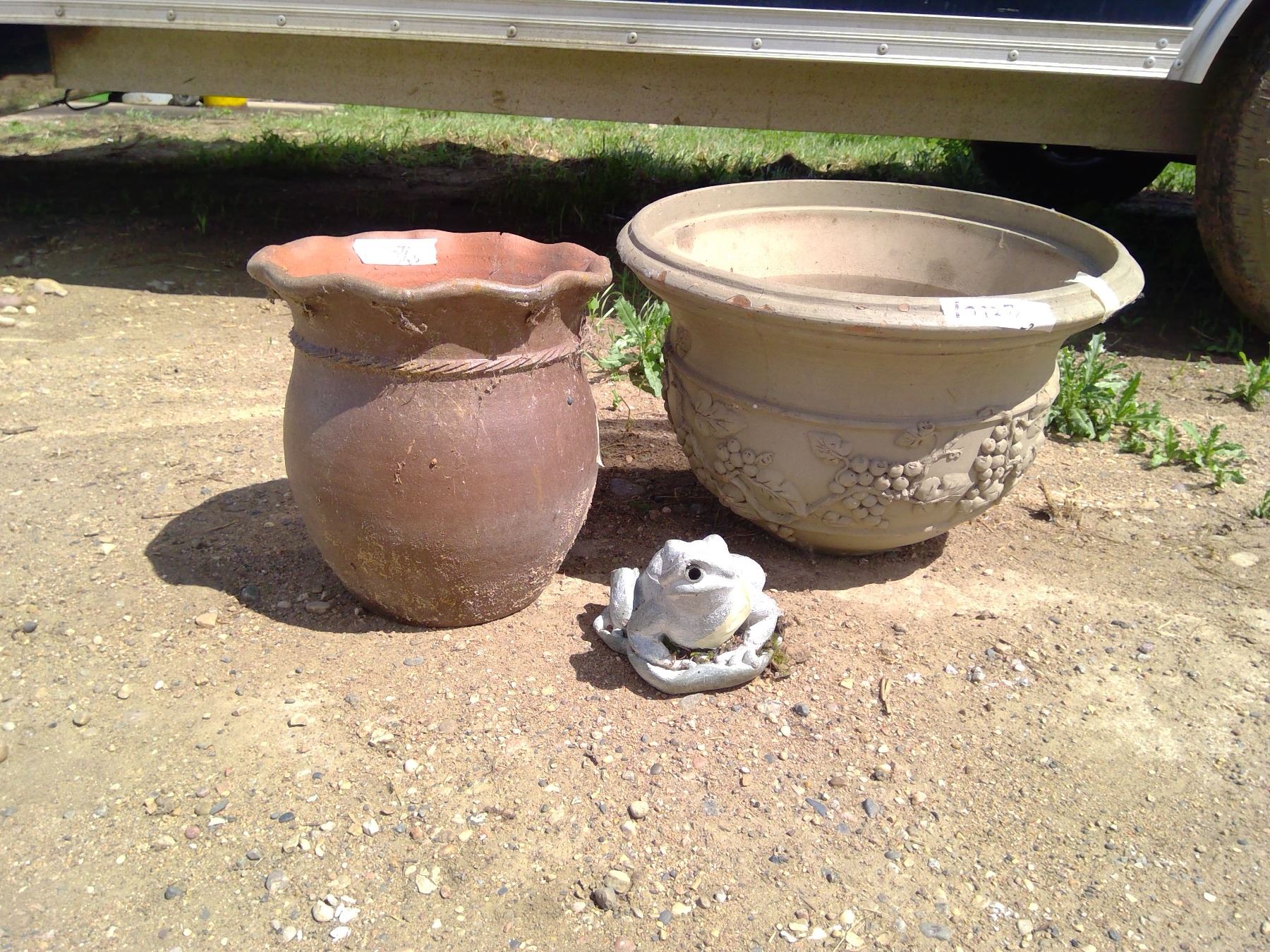 Lot of Garden Décor - Orange Plaster Planter (12"h, 12" dia), Grape Vine Planter (12"h, 18"dia), and Plaster Frog (damaged)