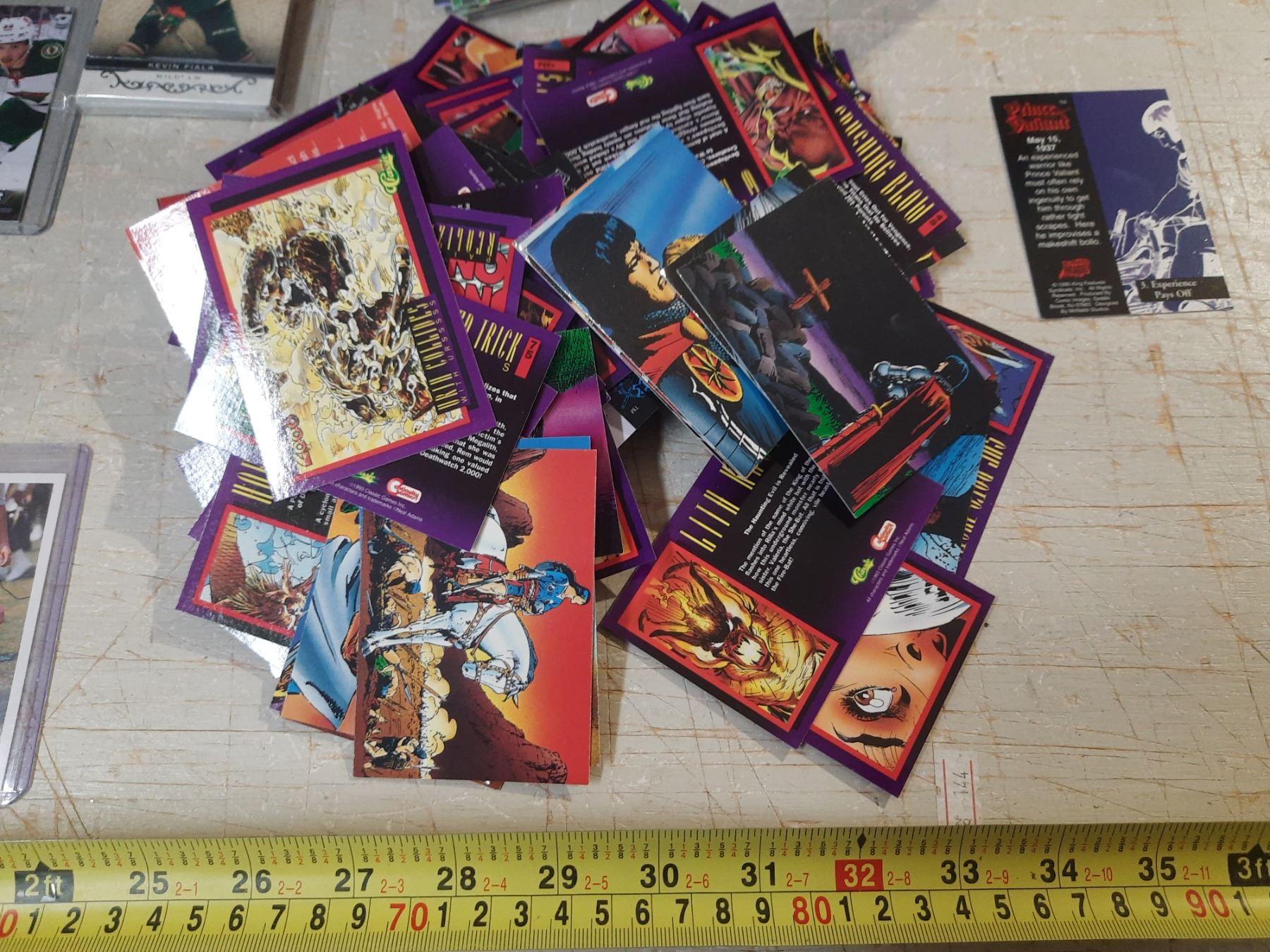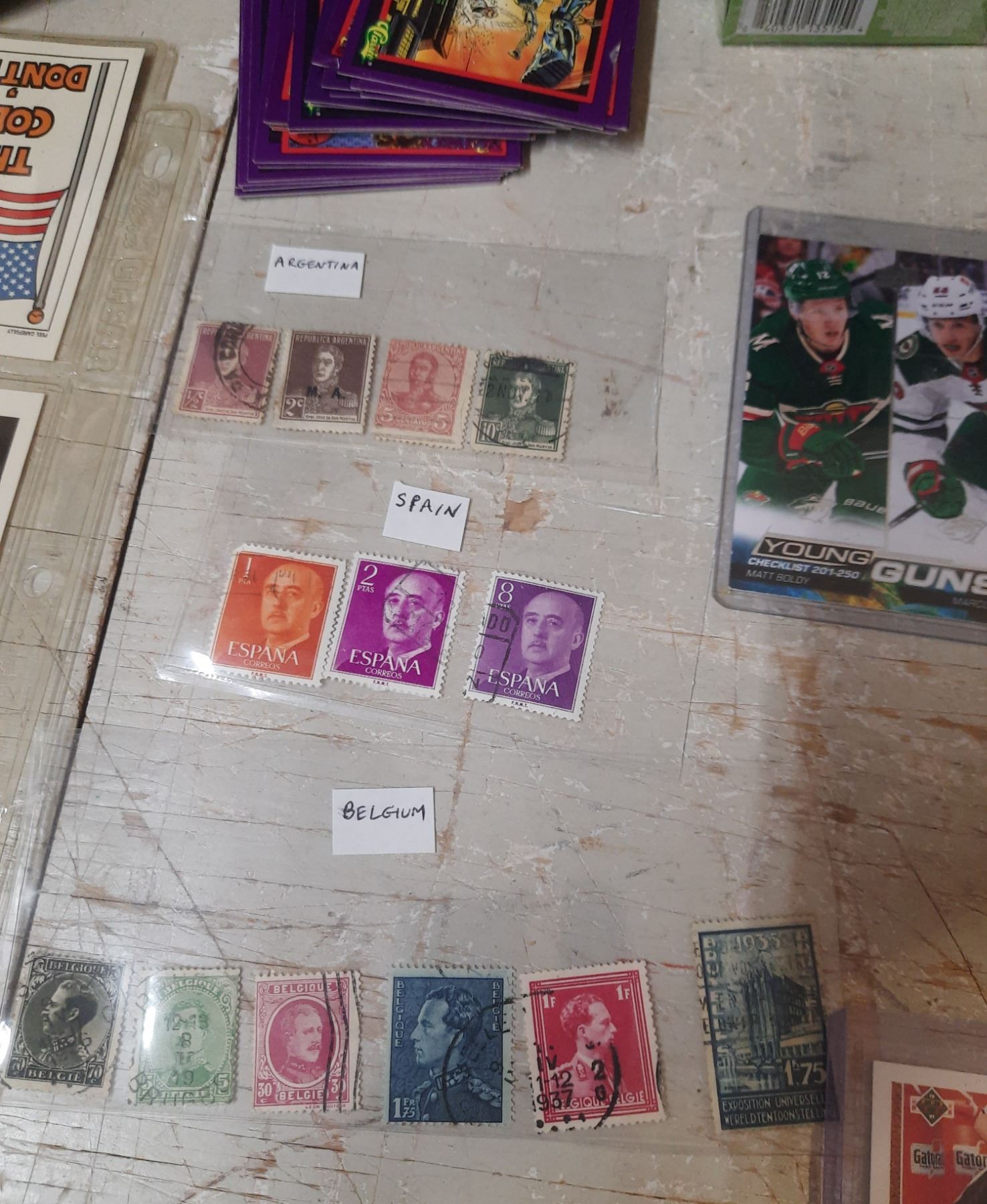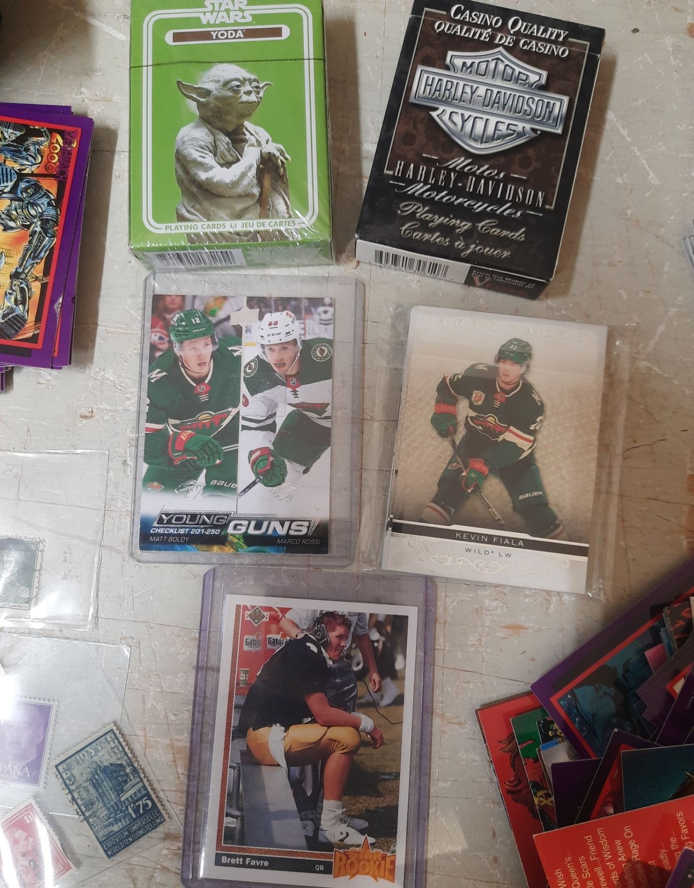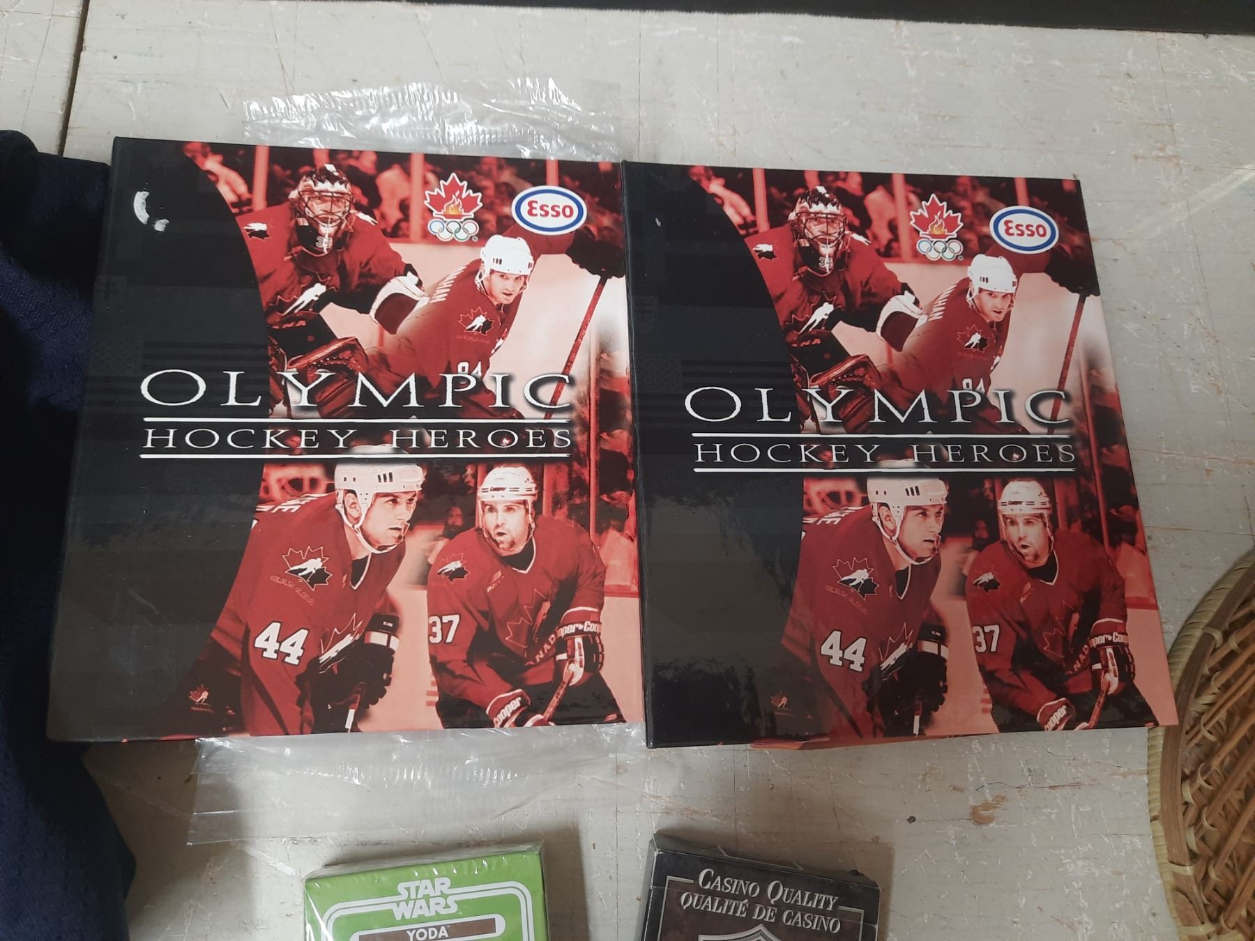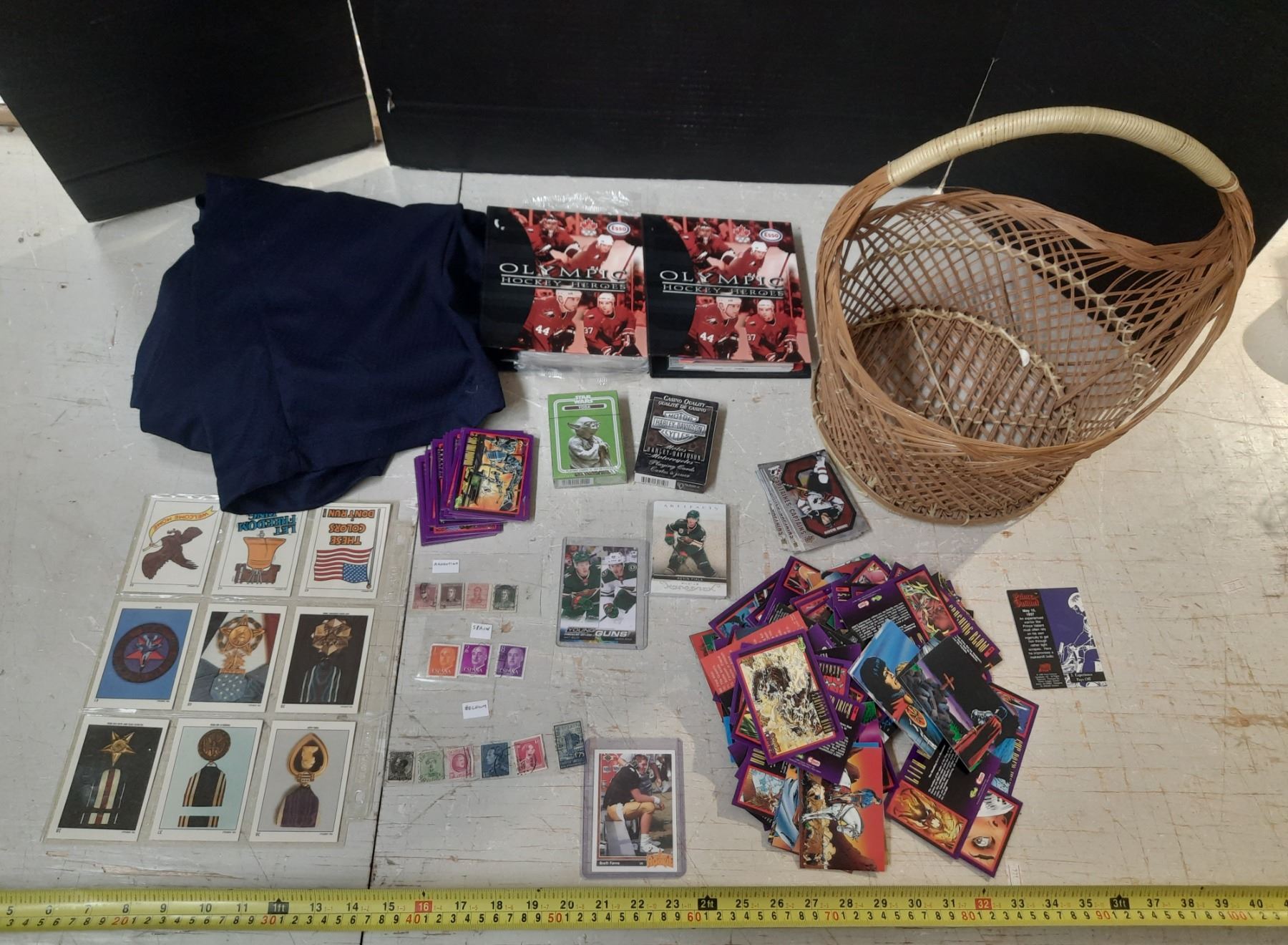 Lot of Hockey Cards, (2) Olympic Hockey Heros Binder, Harley Davidson Cards, Spain-Argentina-Belgium Stamps, XXL Sask. Zone Camp T-shirt (New) and Basket, etc.