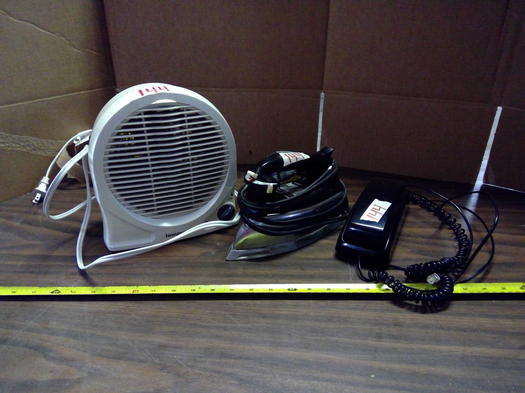 Lot of Home Appliances - Honeywell Heater, Iron, and Phone
