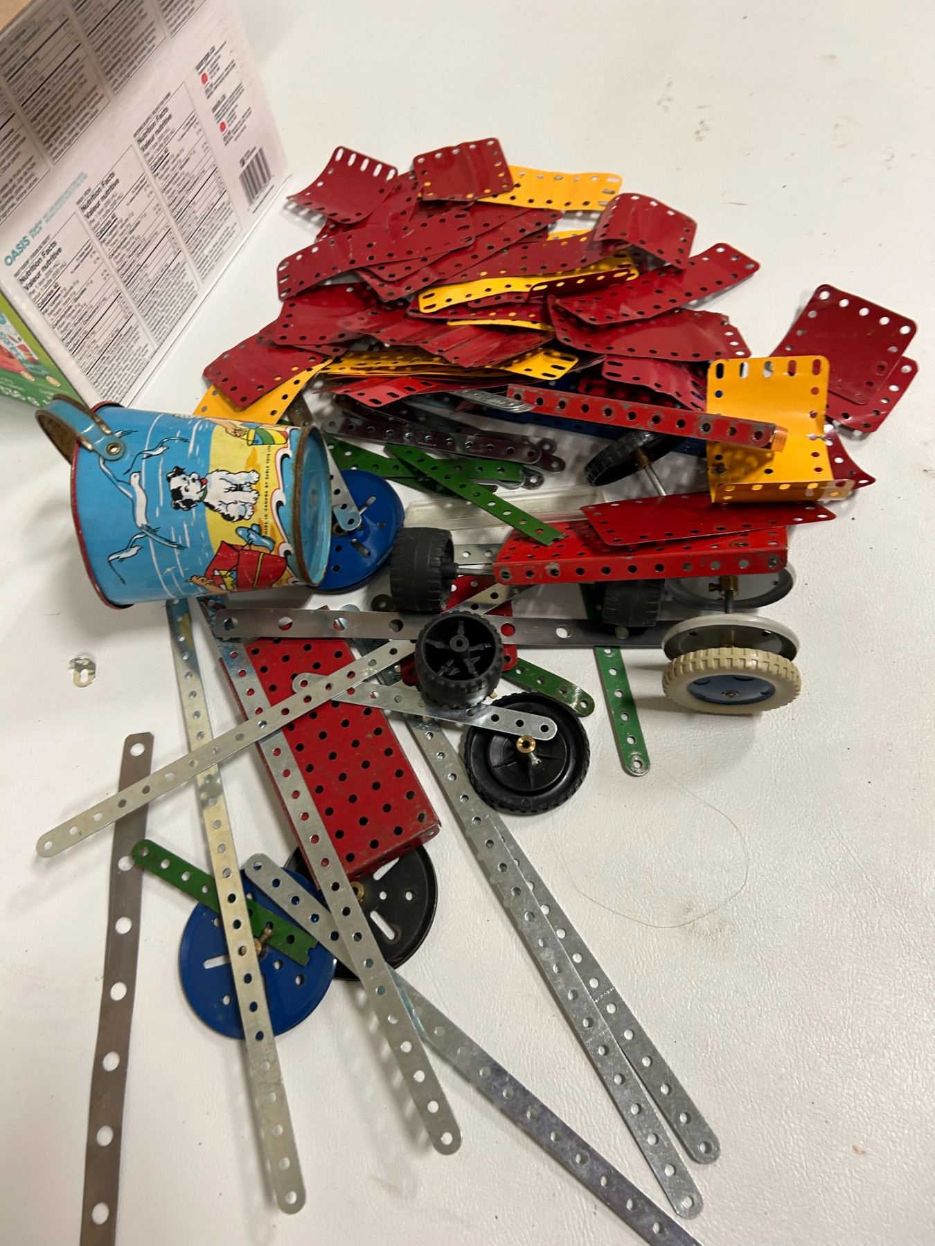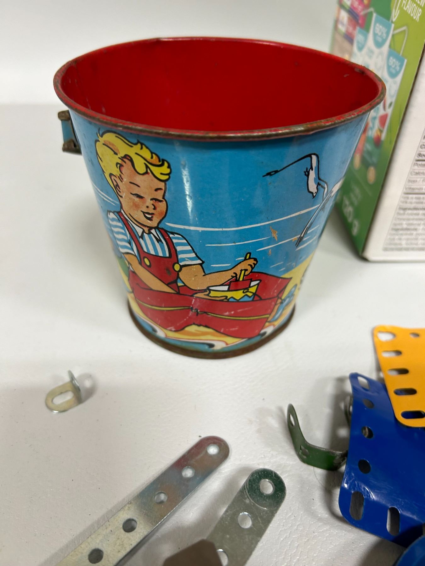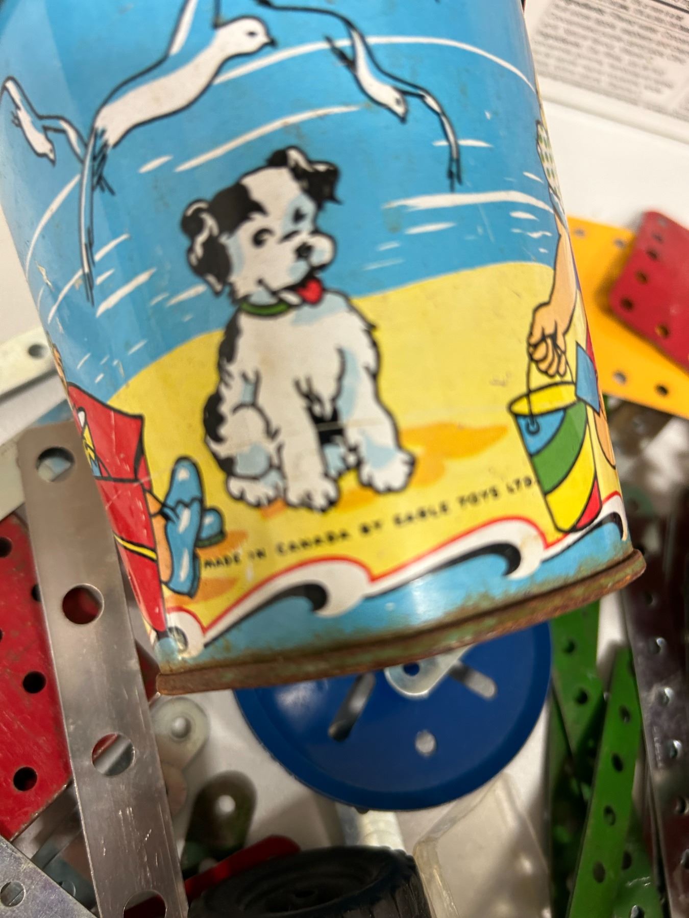 Lot of Mecanno parts and tin sandpail Eagle toys Ltd