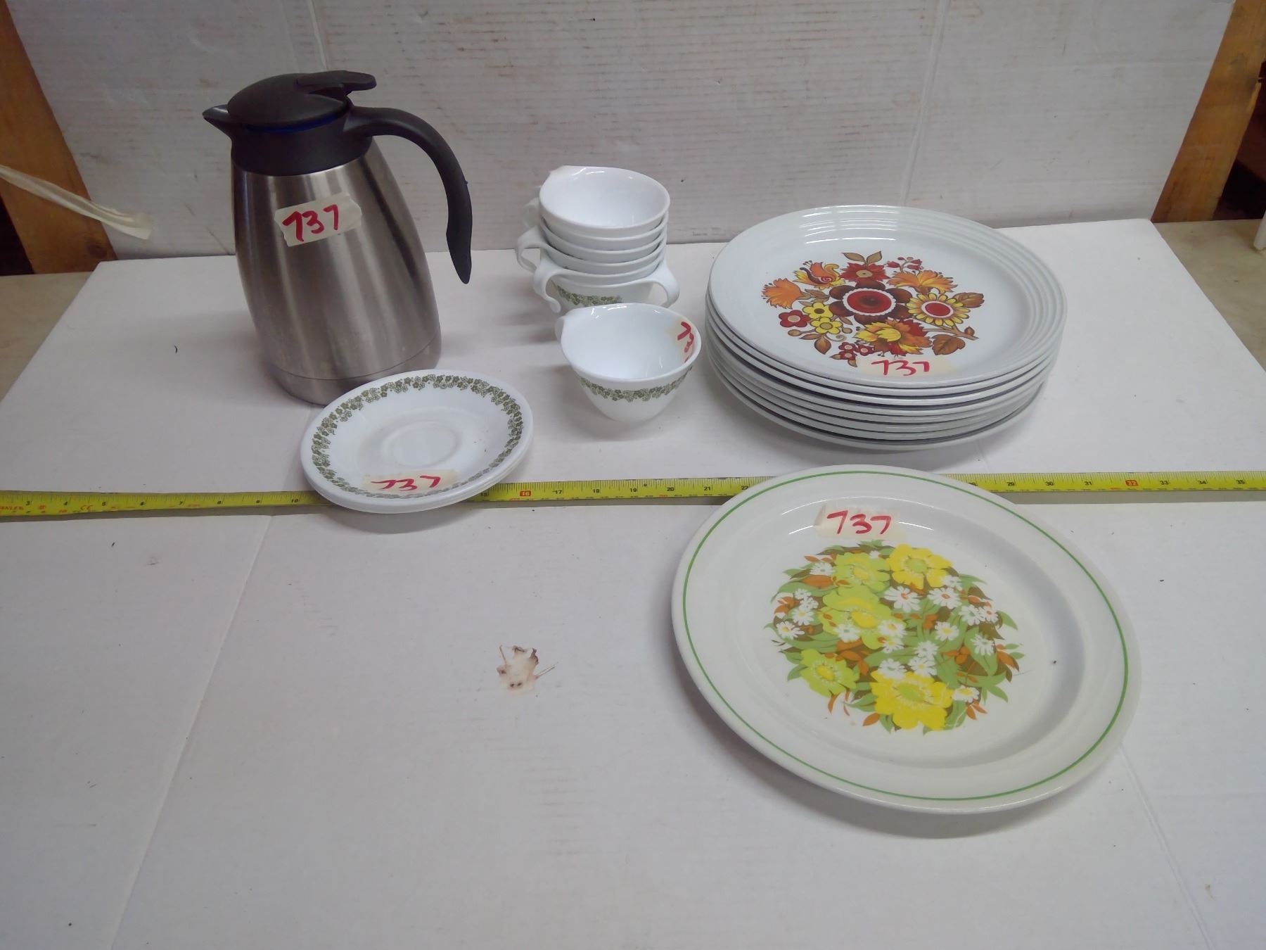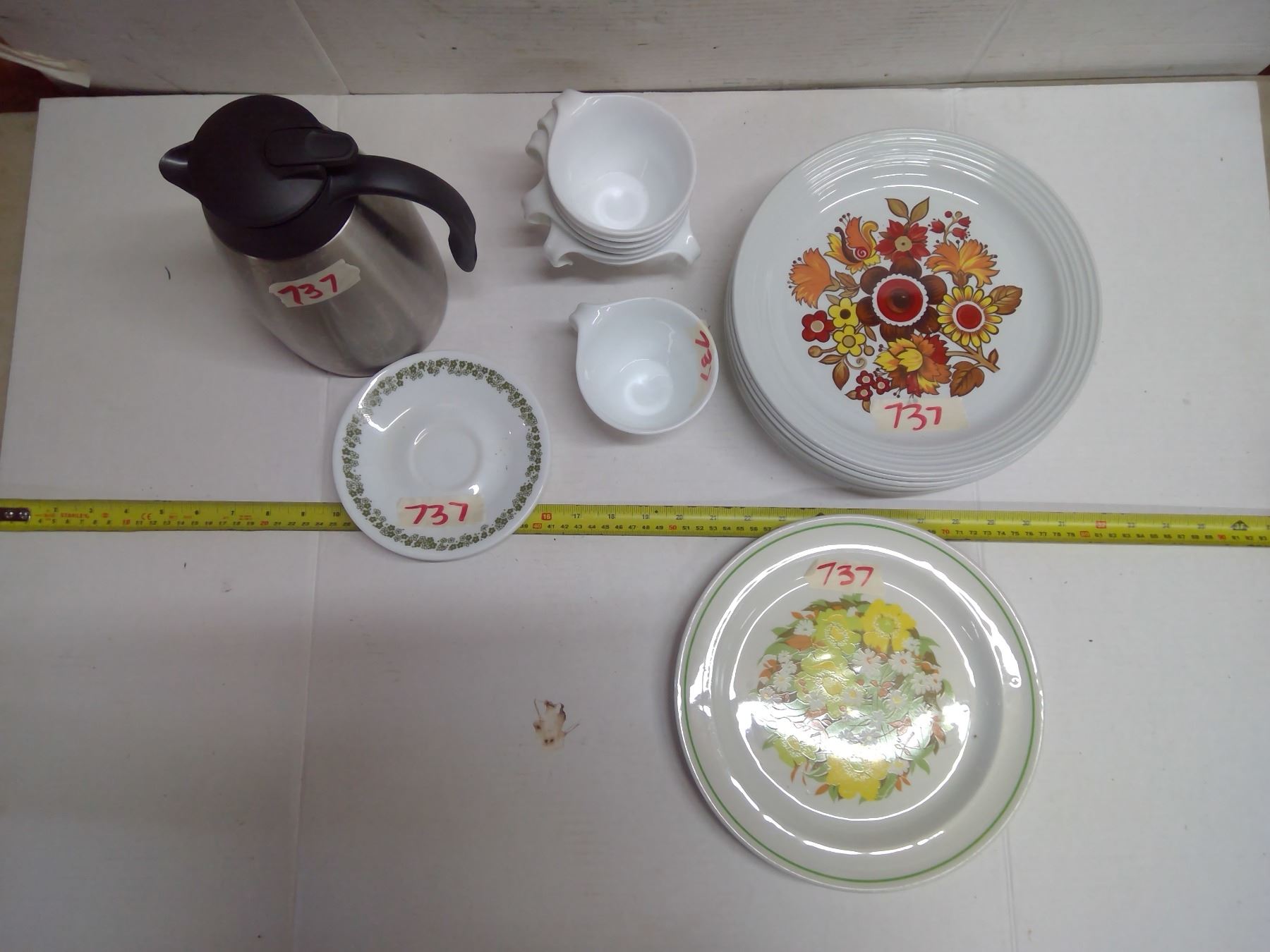 Lot of Misc. Kitchenware - Floral Plates, Corelle Dishes, and Thermos