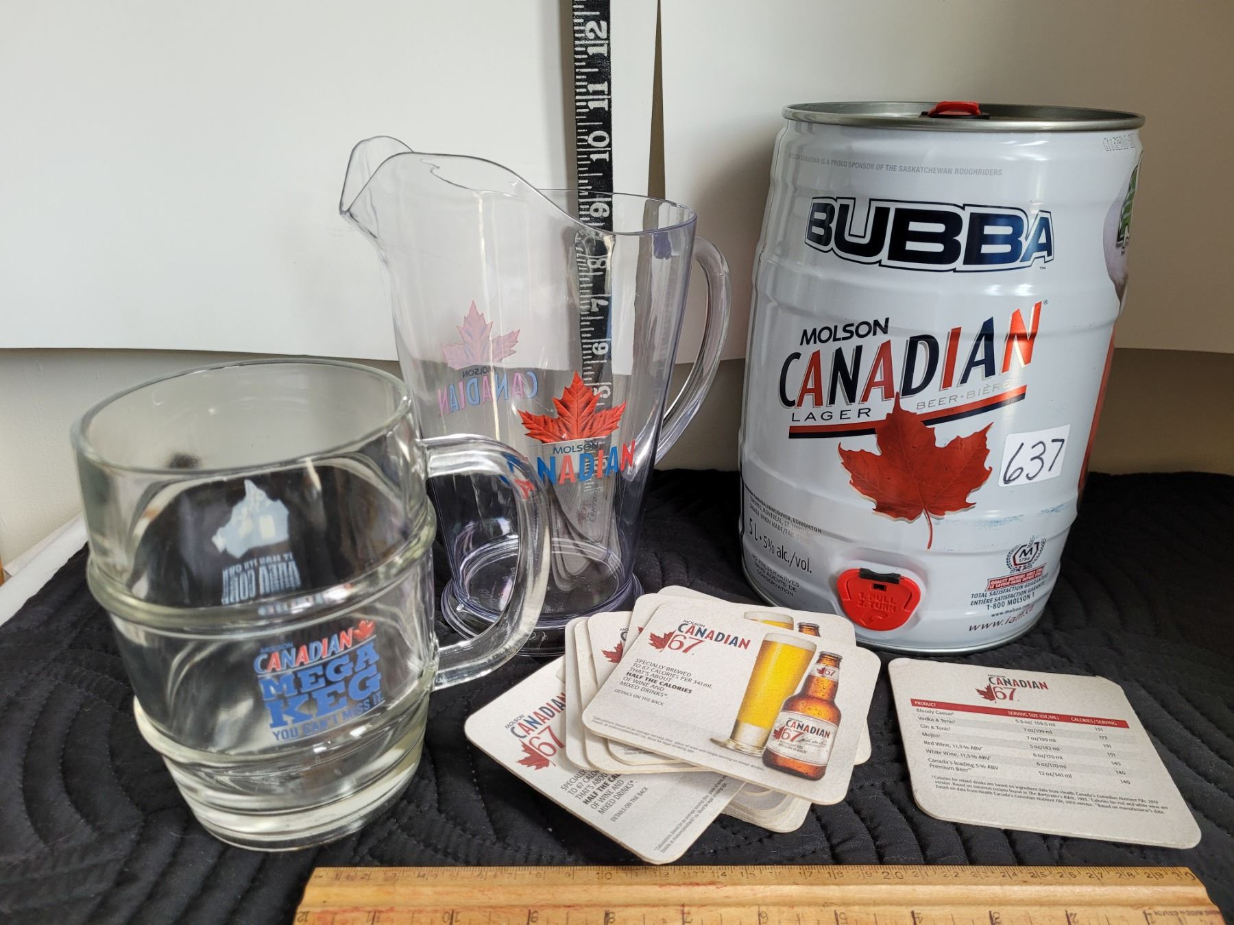 Bubba Keg, beer pitcher, barrel mug and coasters.