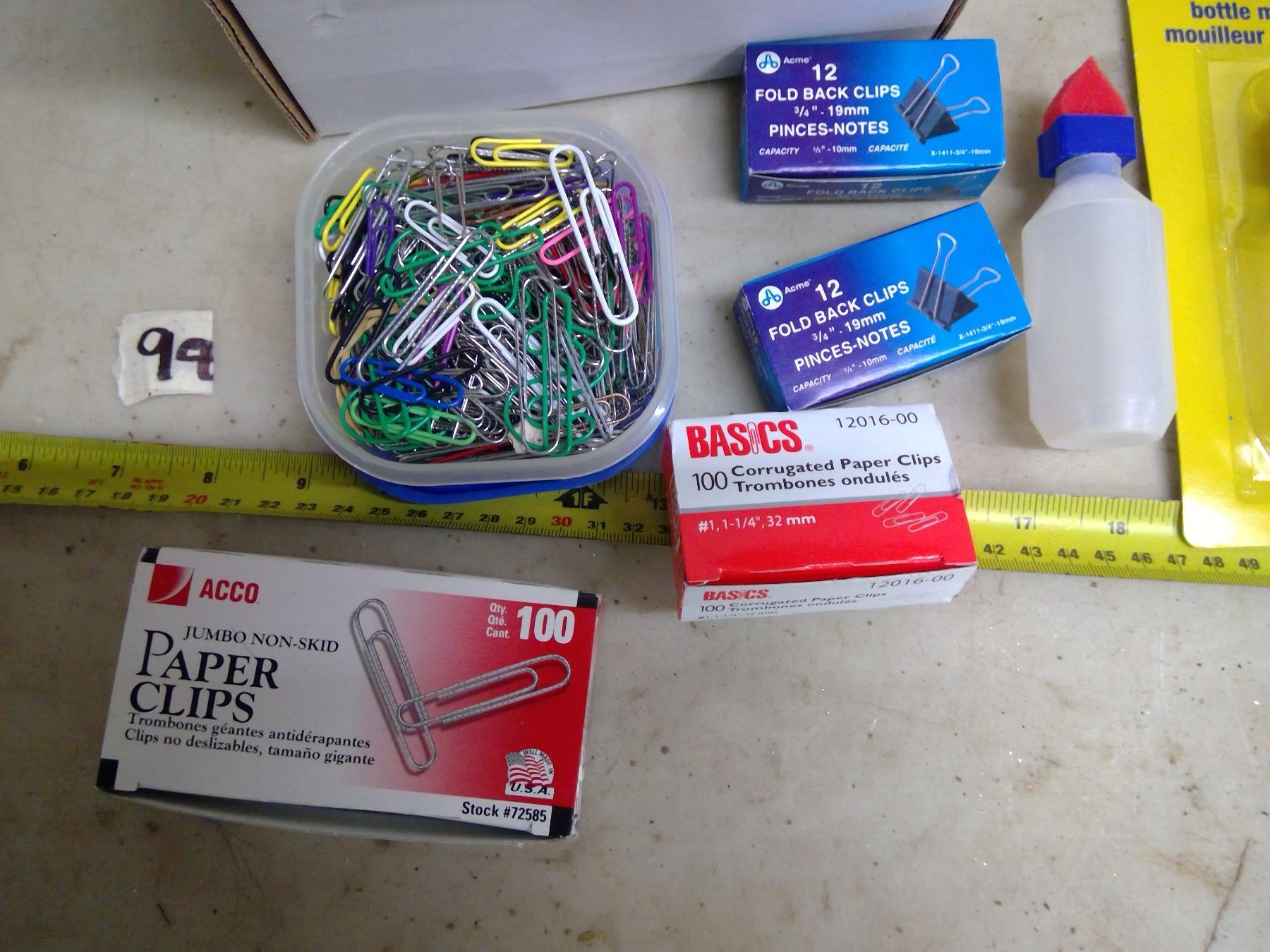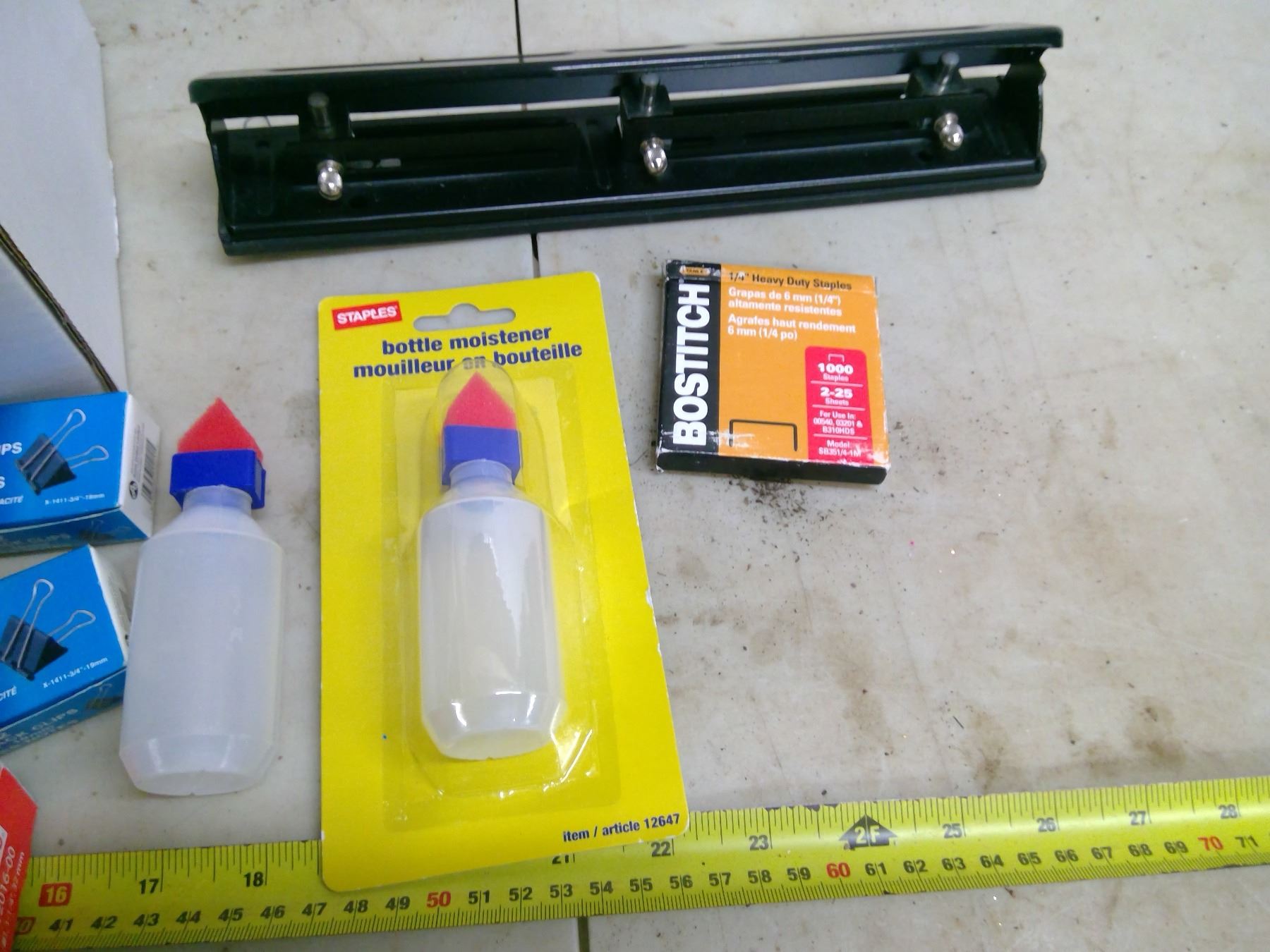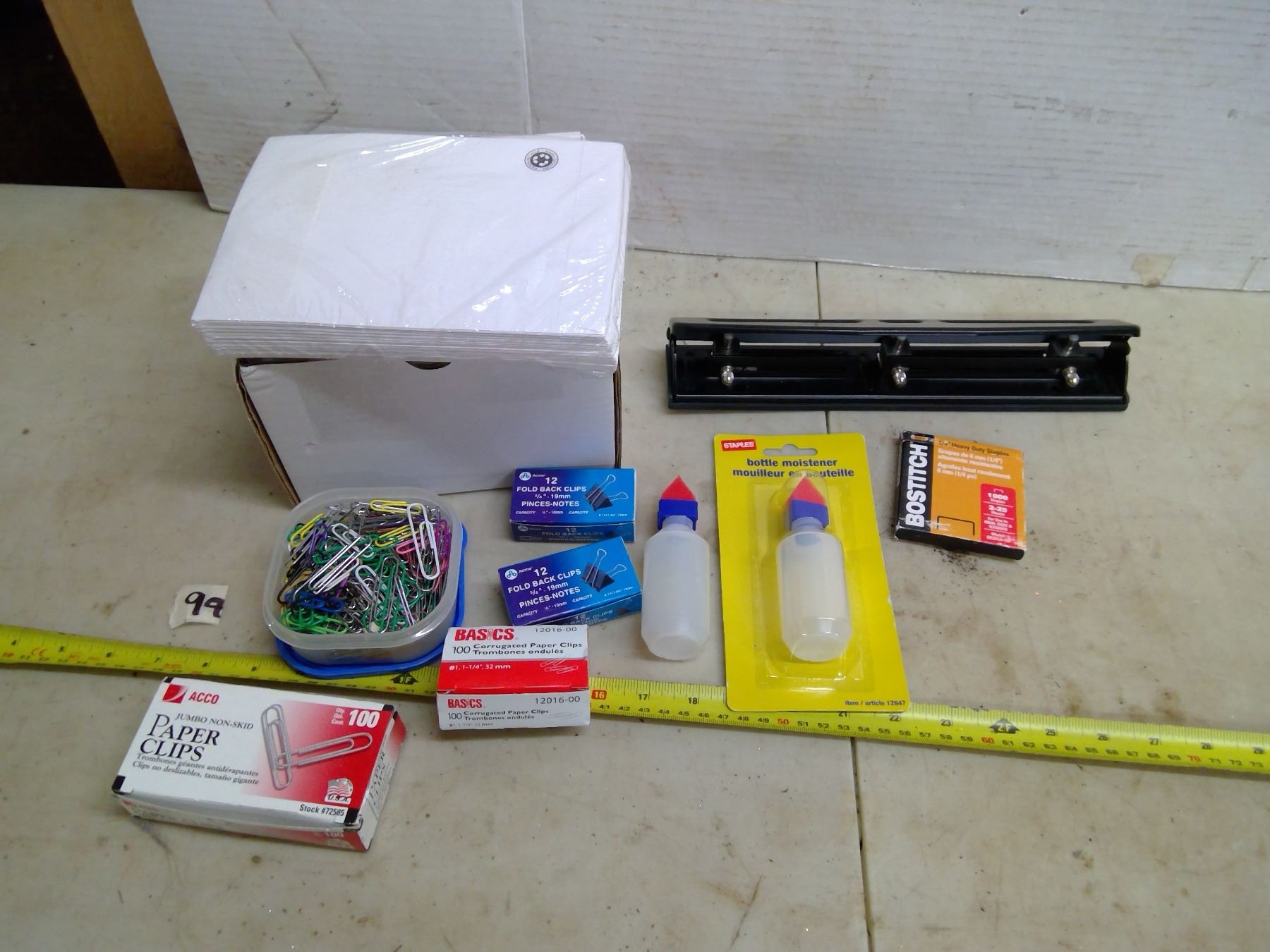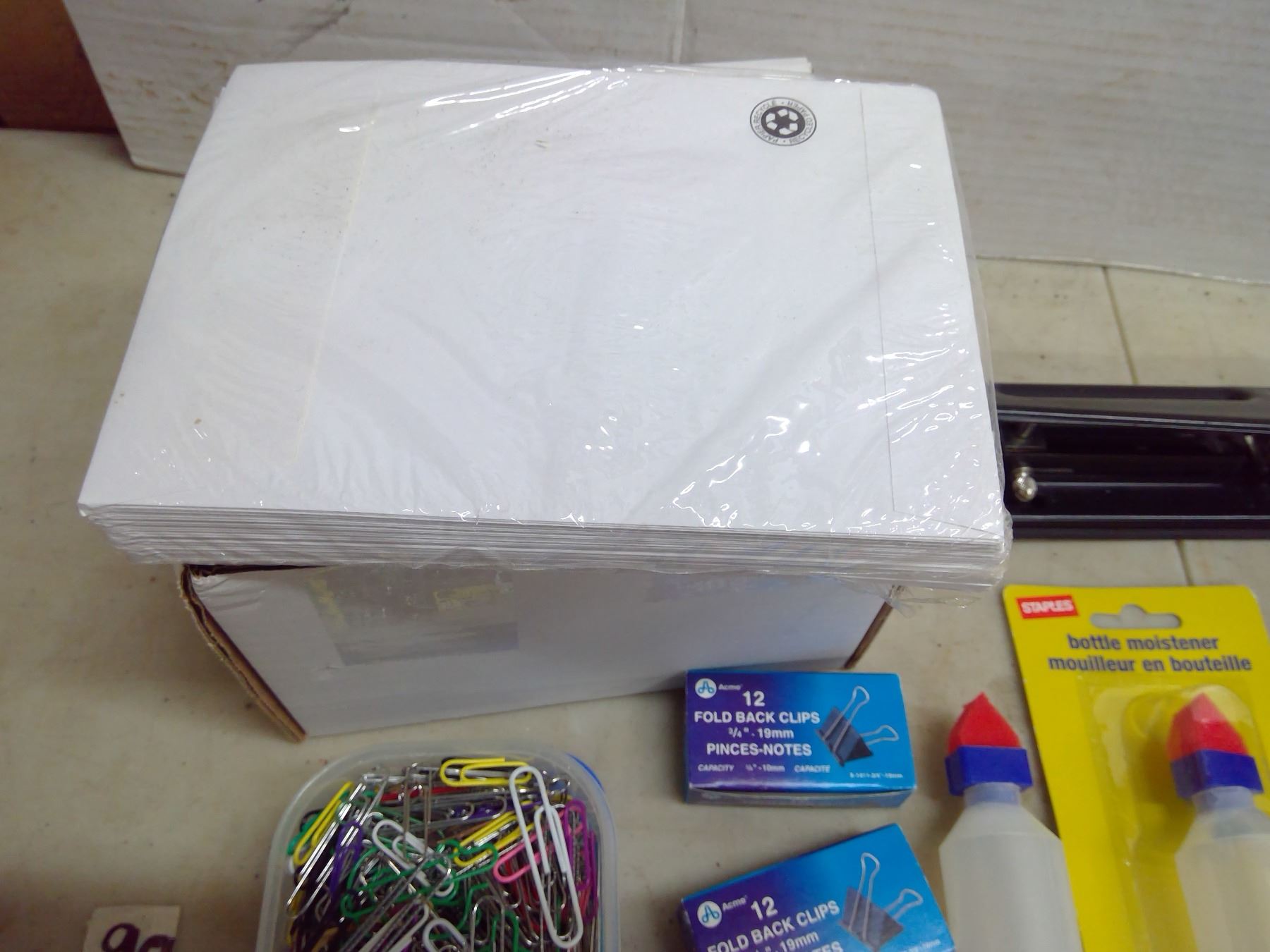 Lot of Office Supplies - Paper Clips, Hole Puncher, 5x7 Envelopes, Staples, Bottle Moisteners, Clear