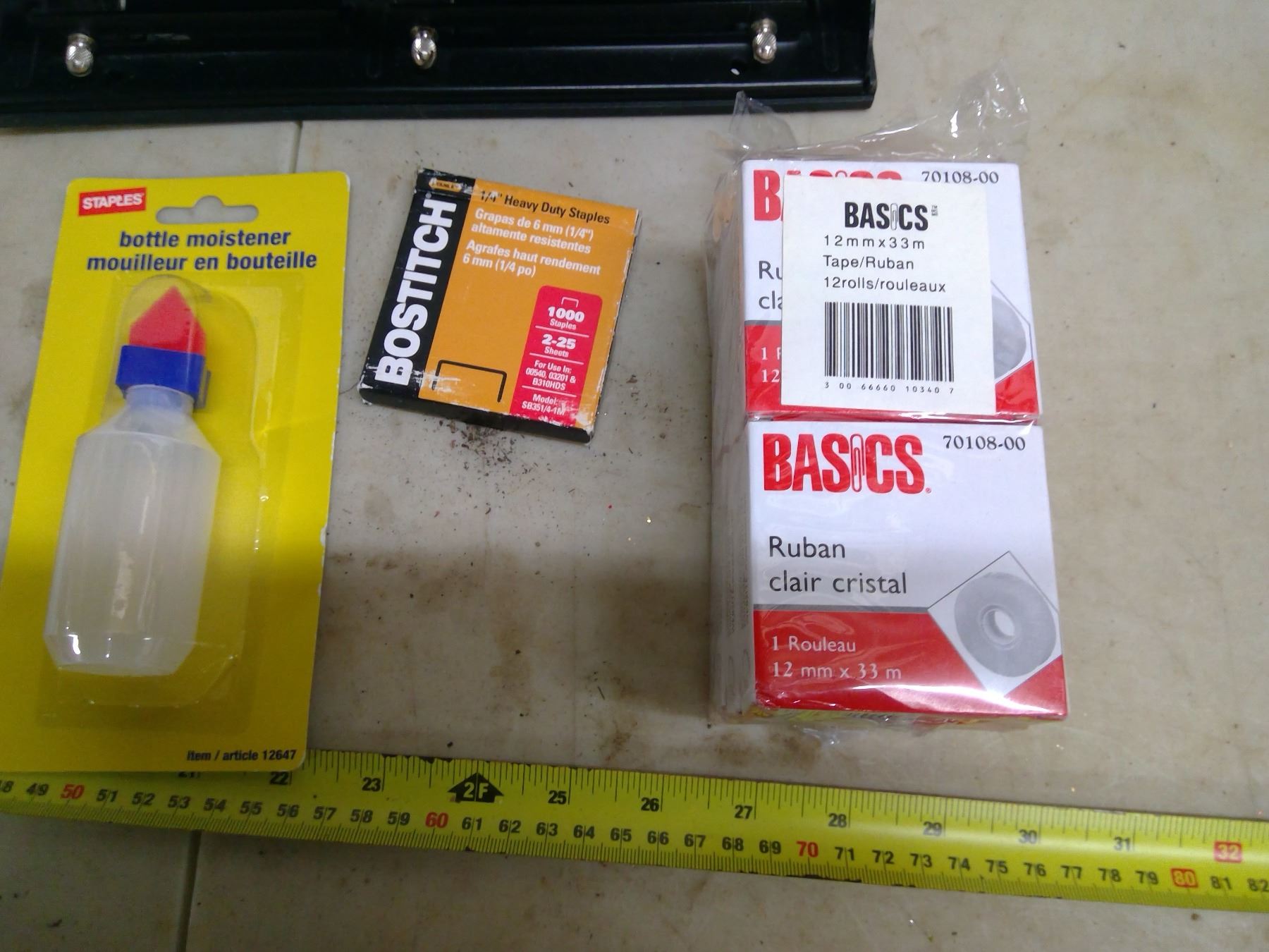 Lot of Office Supplies - Paper Clips, Hole Puncher, 5x7 Envelopes, Staples, Bottle Moisteners, Clear Tape