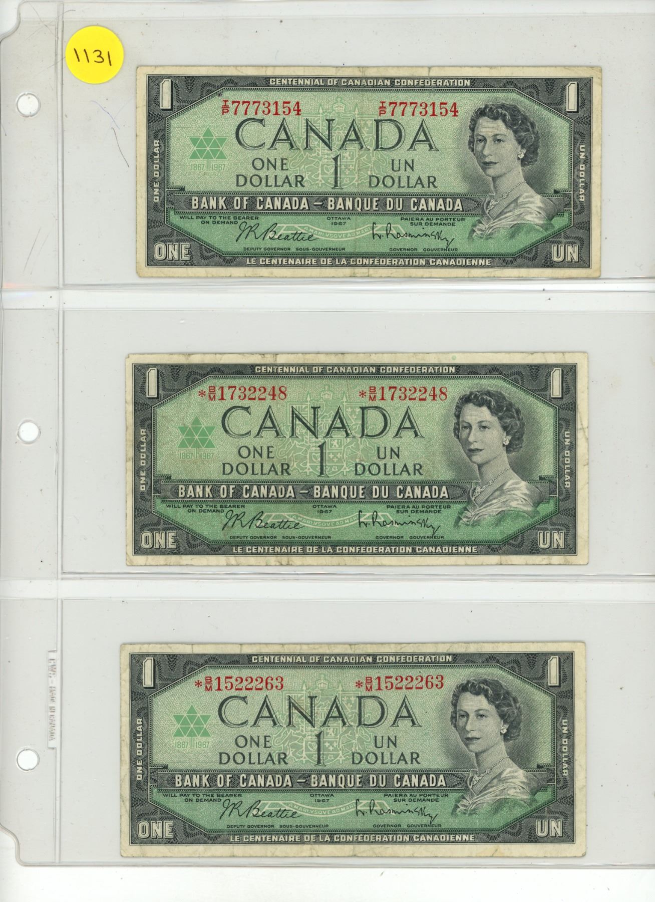 Lot of Three 1967 Canada $1 Bills, Beattie/Rasminsky (#*I/P 7773154, Replacement *B/M 1732248 & Replacement *B/M 1522263)