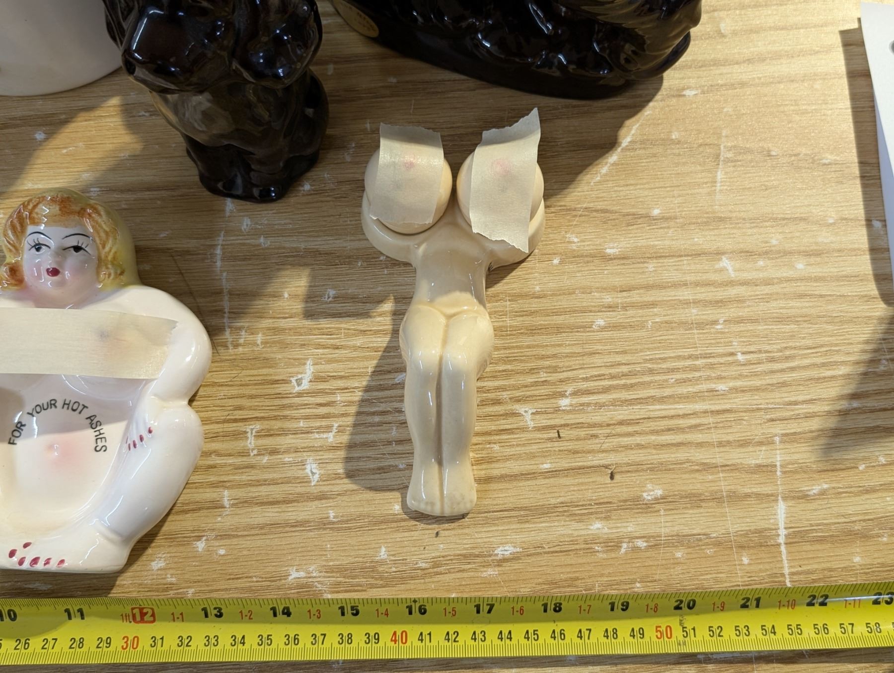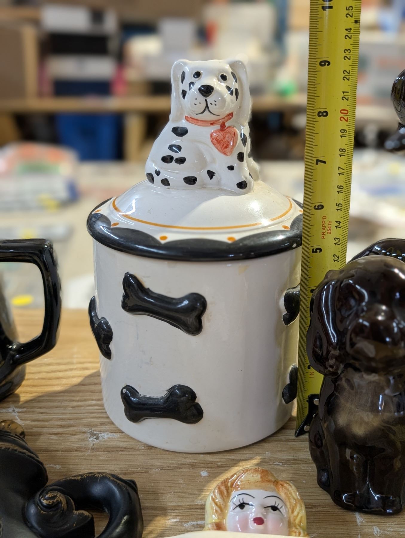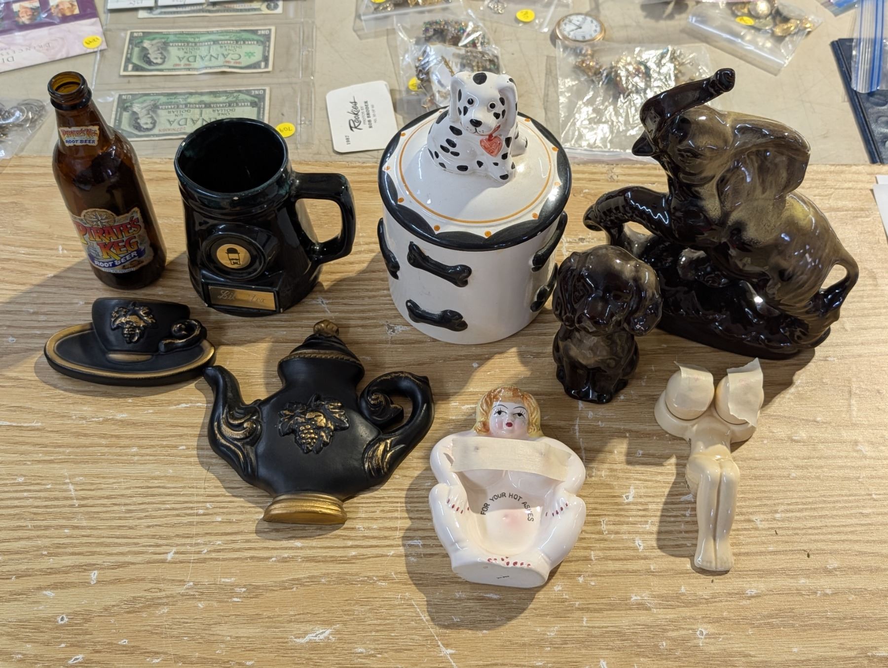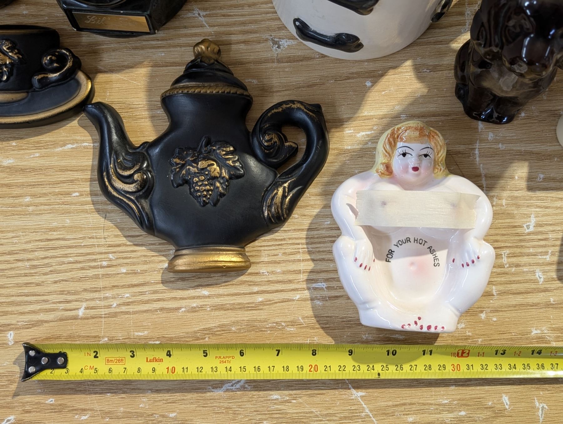 Lot of Vintage Decor (Dog Treat Jar, Nude Lady Ash Tray, Tea Pot and Tea Pot Wall Decor, etc.)