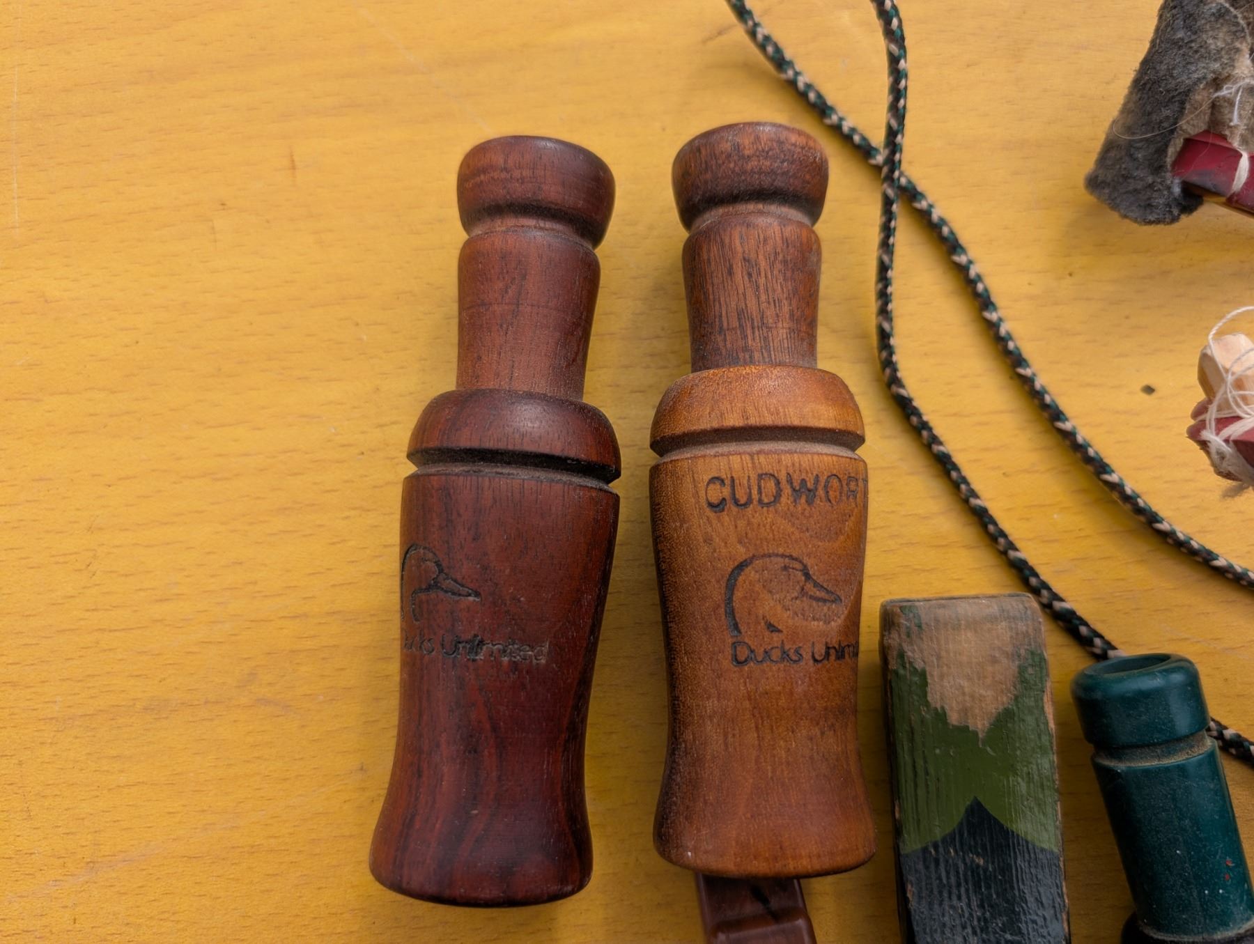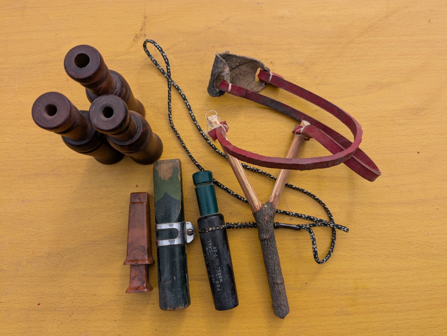 Lot of Vintage Duck Callers and Vintage Wooden Sling Shot