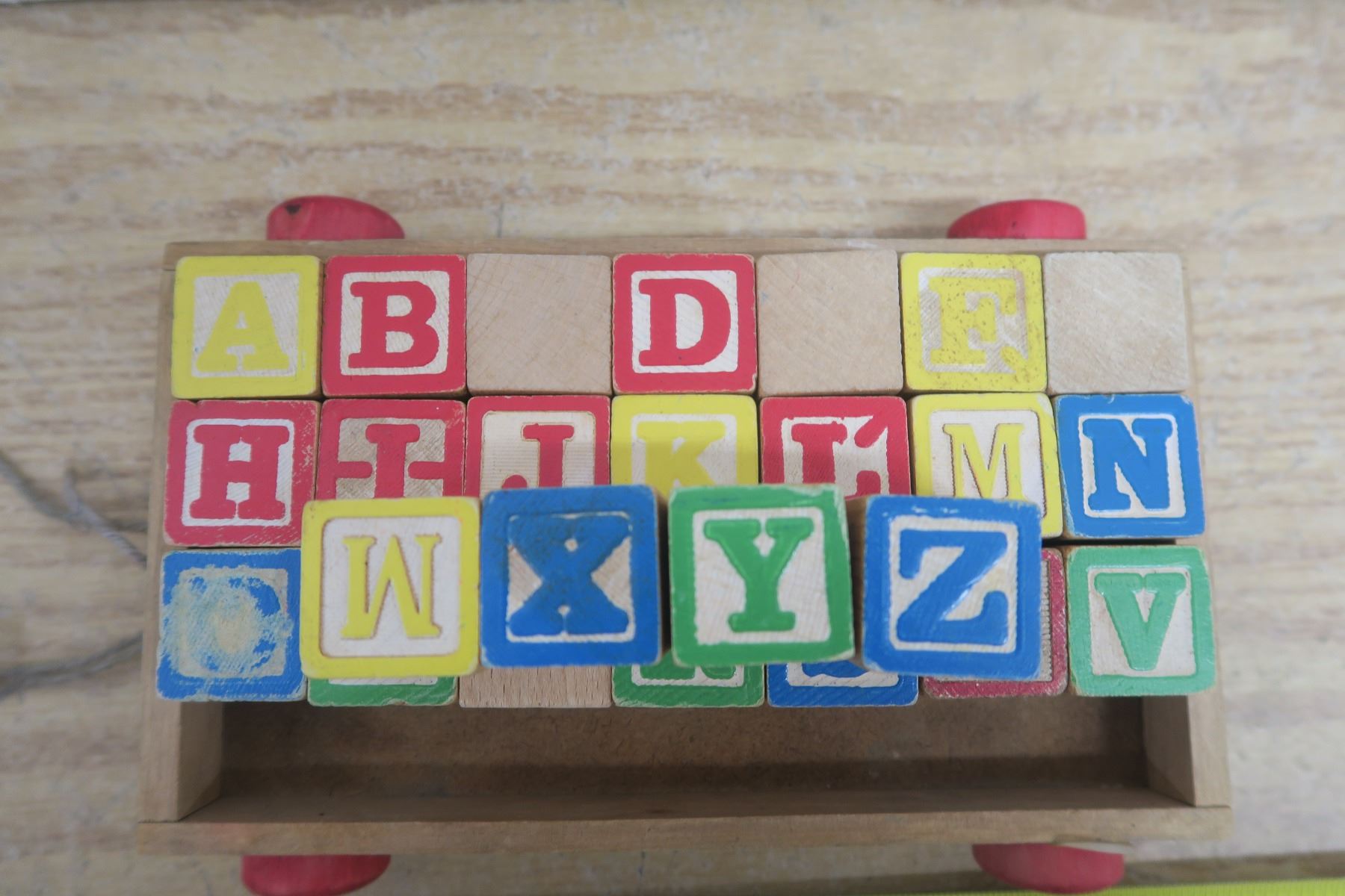 Lot of Wood Blocks in a Wagon Lot of Round, Square and Rectangular Blocks
