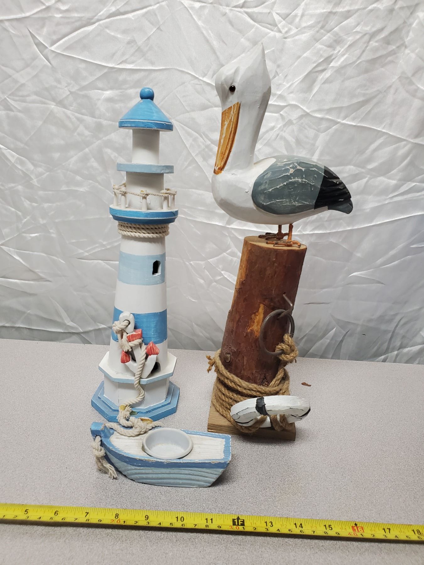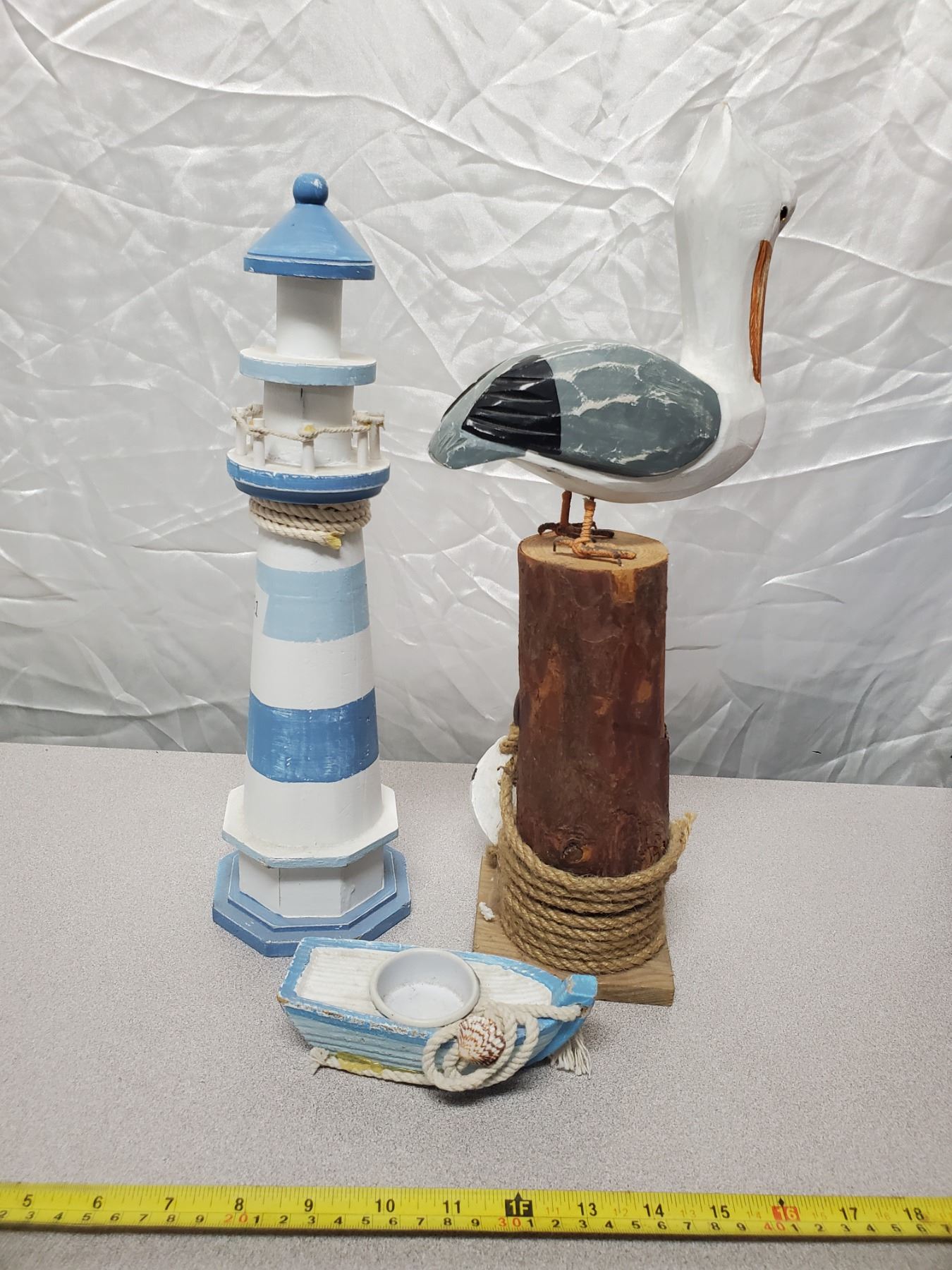 Lot of Wooden Lake Decorations - Pelican, Lighthouse & Boat