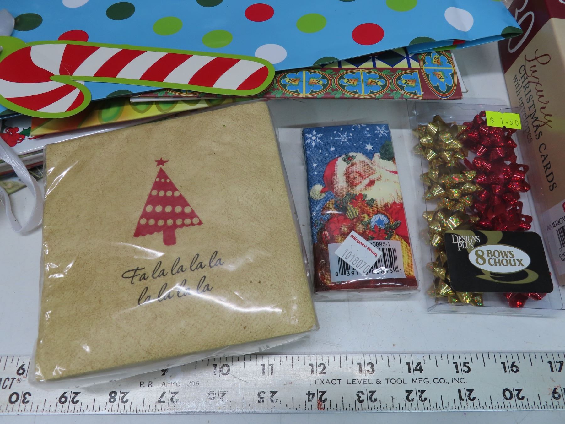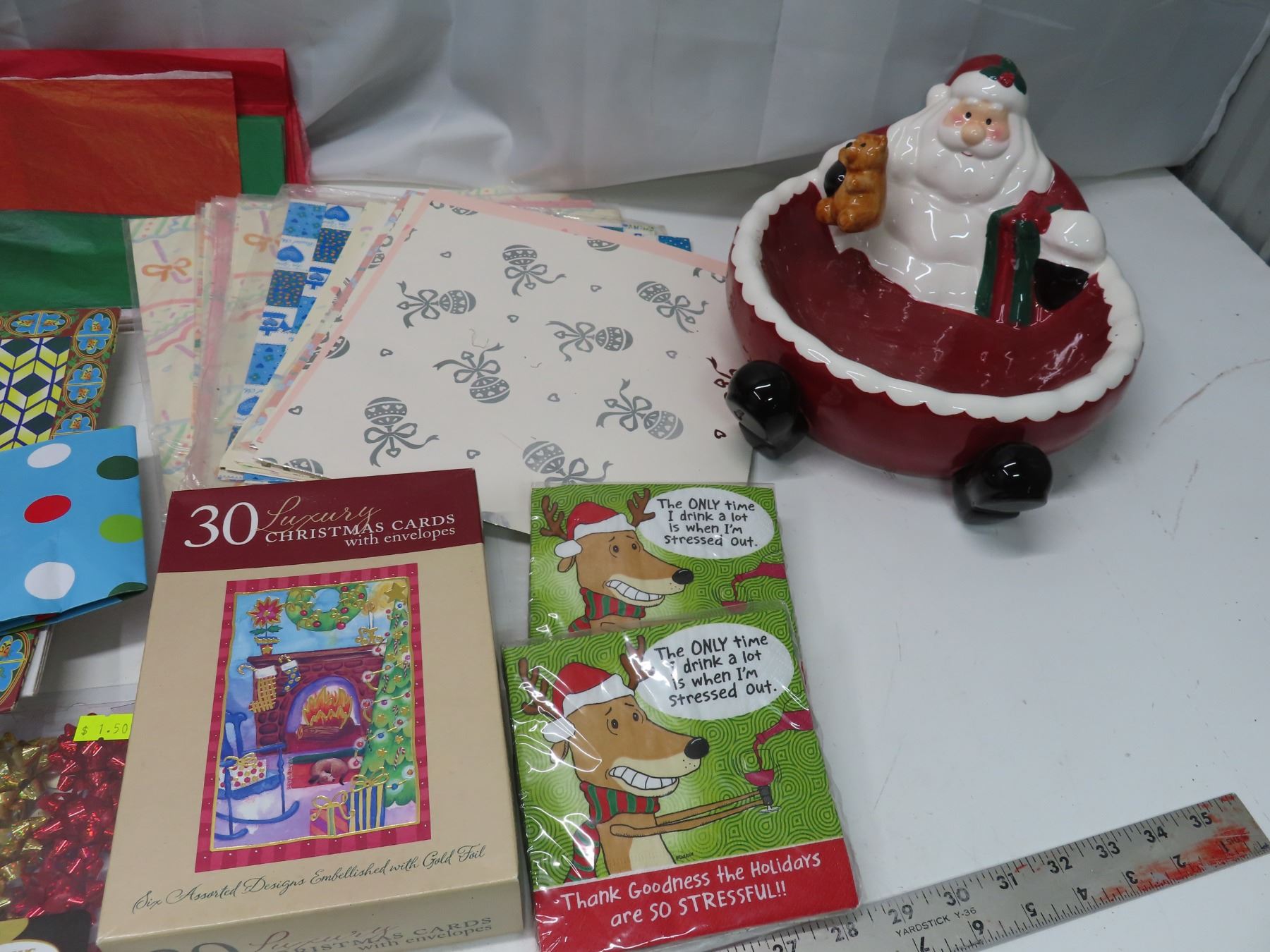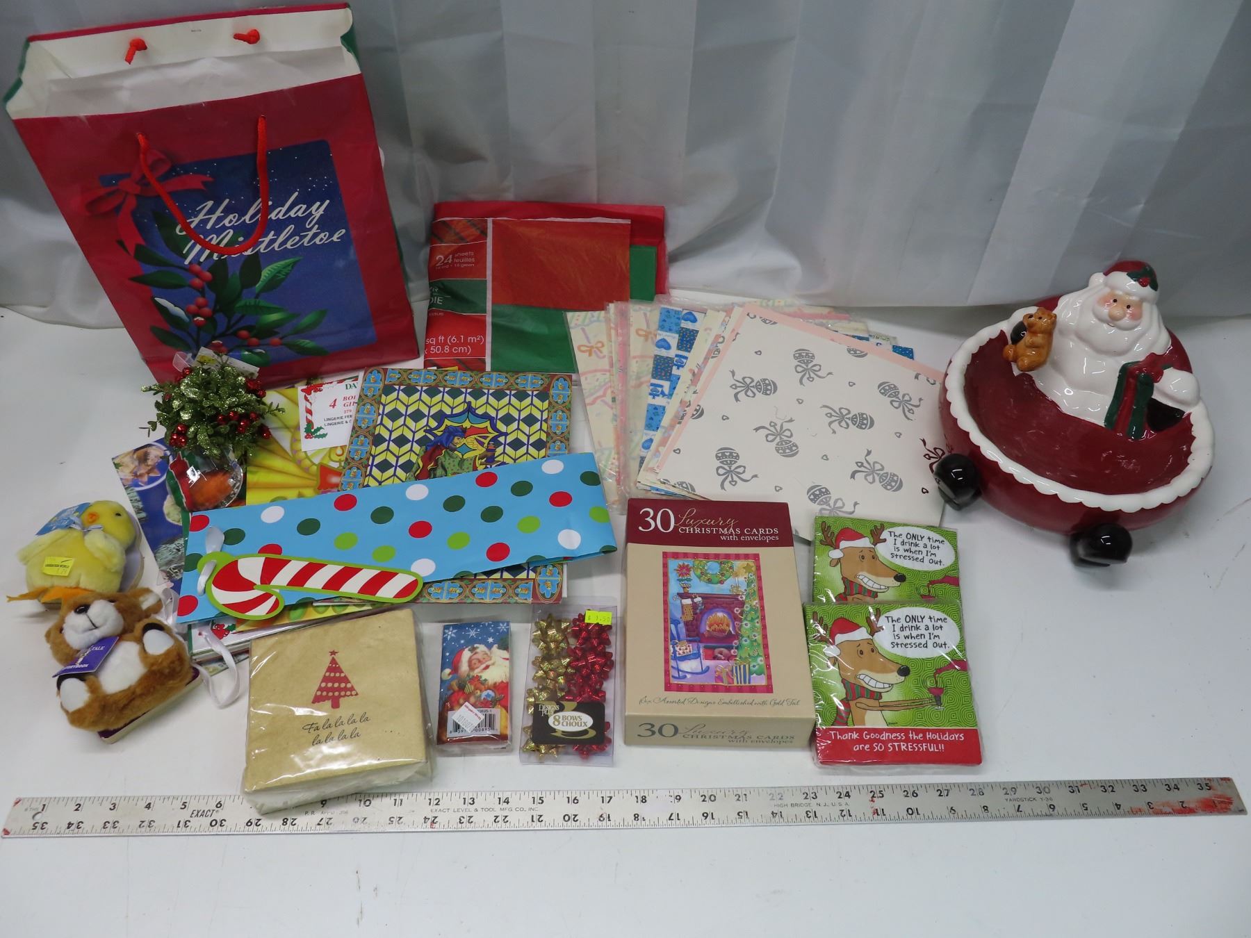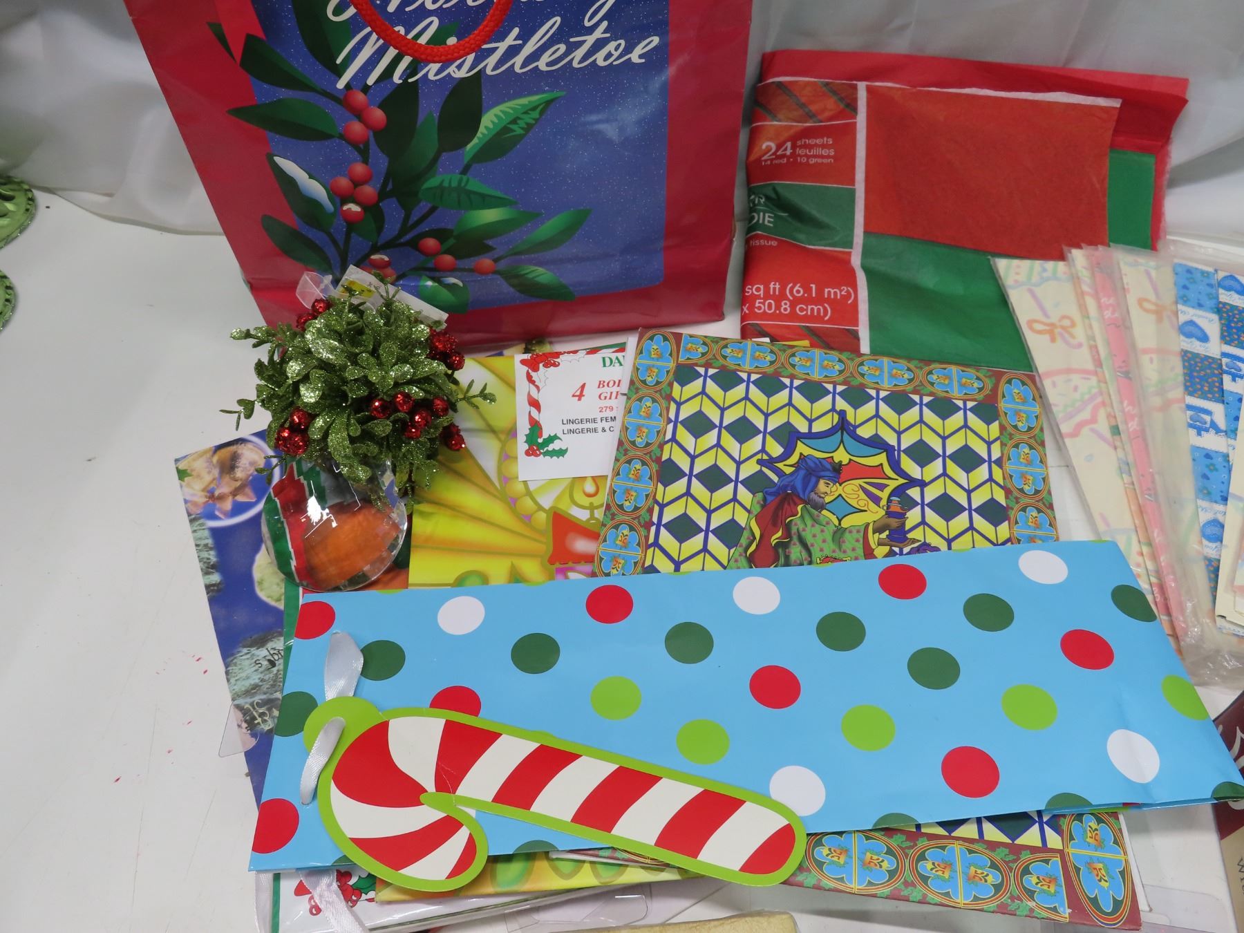 Lot of assorted cute christmas bags and tissue paper and other Christmas party supplies