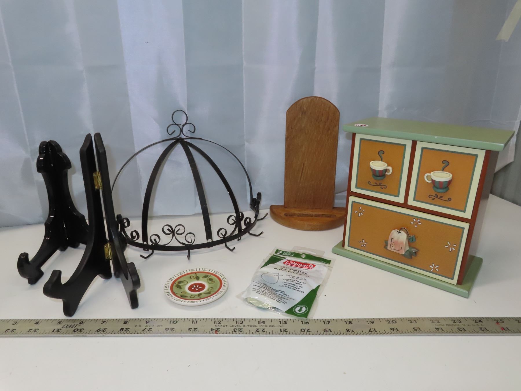 Lot of assorted household items: Decorative metal key holder, Coleman Insta-clip-2 #21 Mantles, wooden plaque, 2 picture frame holders.