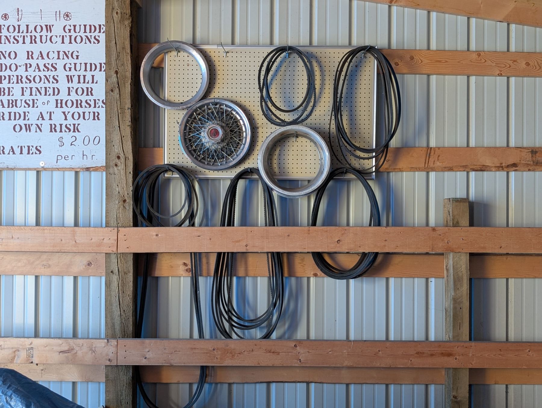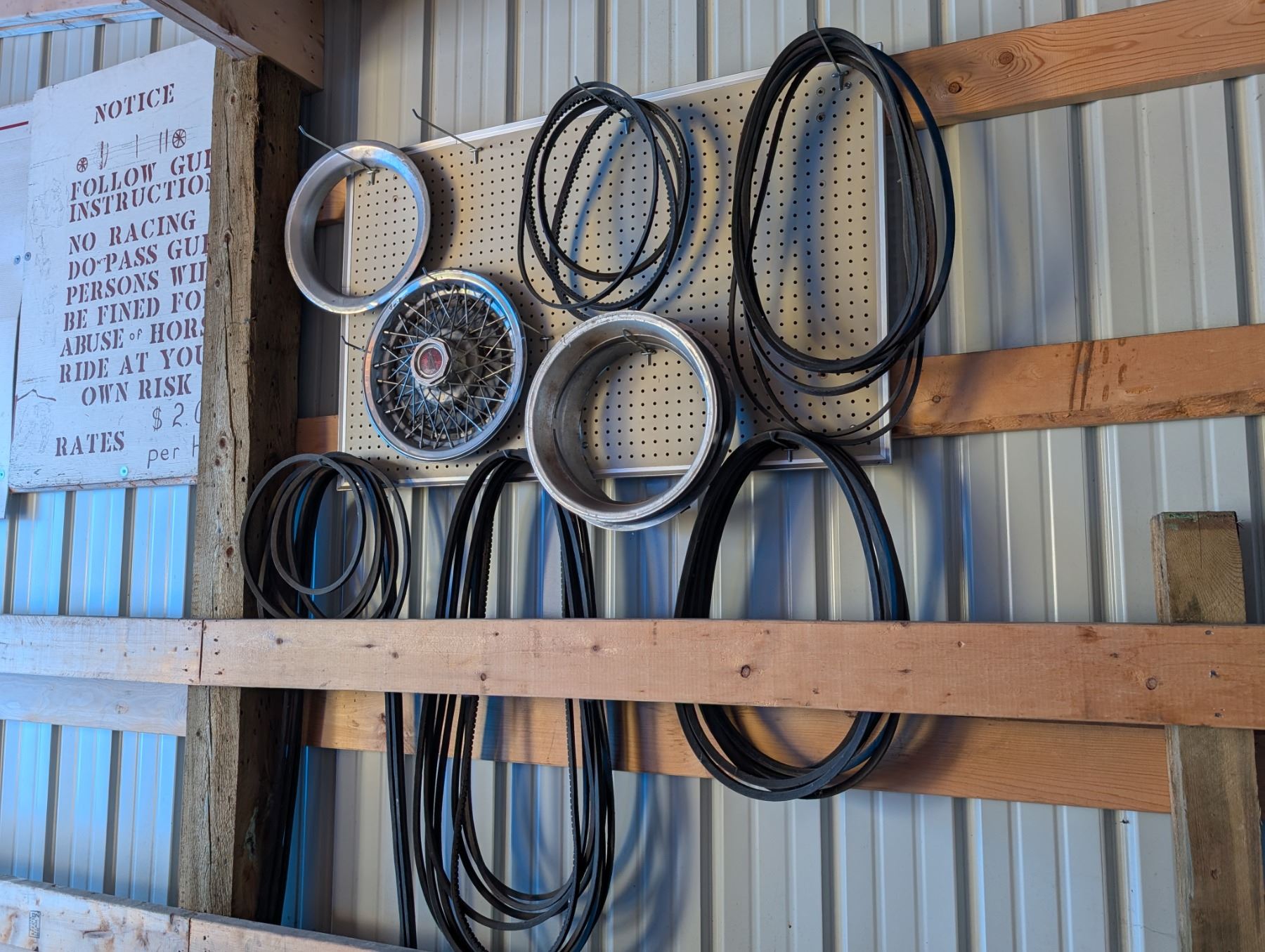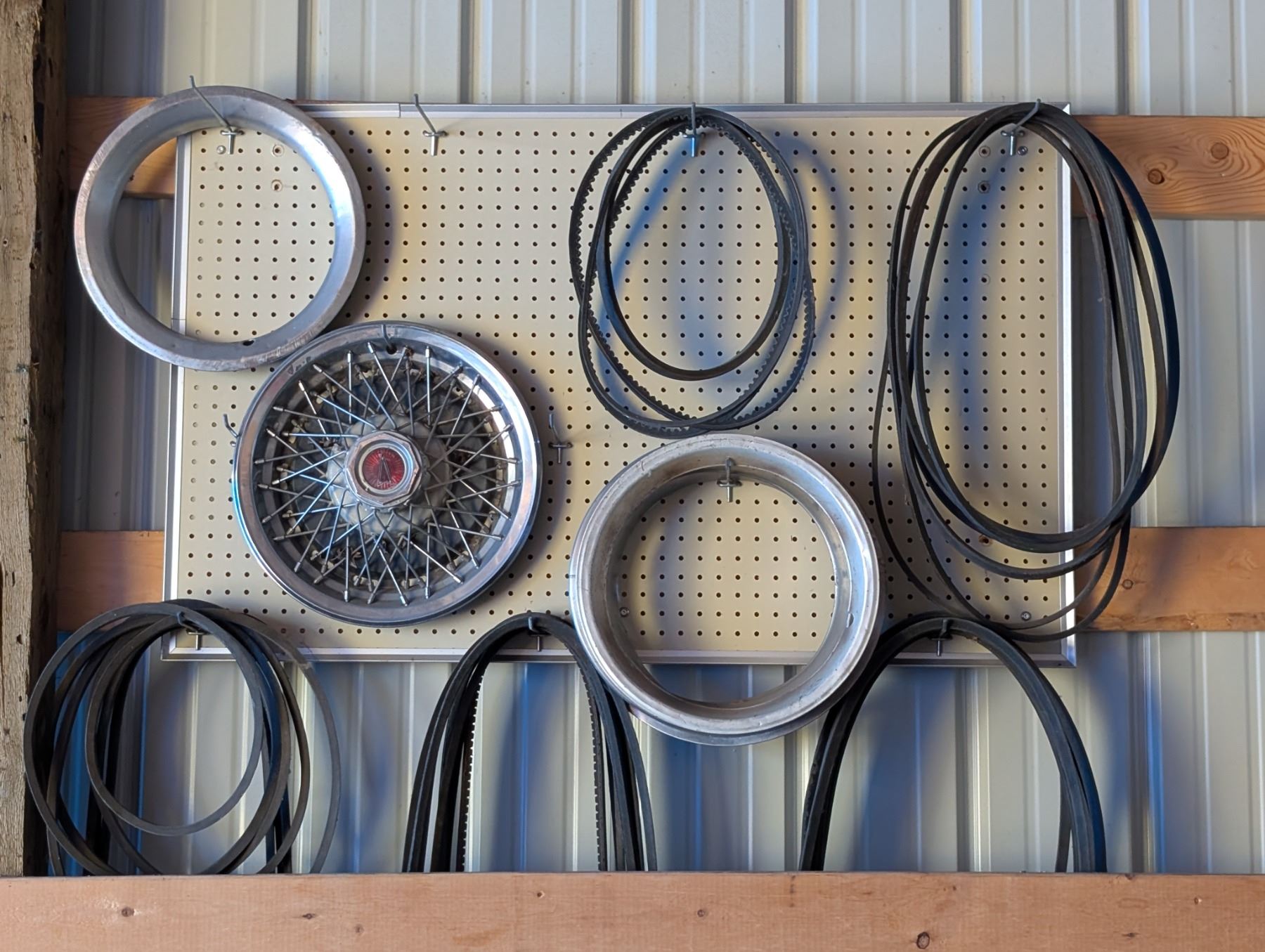 Lot of belts, rims, Wheel Rim Cover, and etc. (Mounted wall not included)