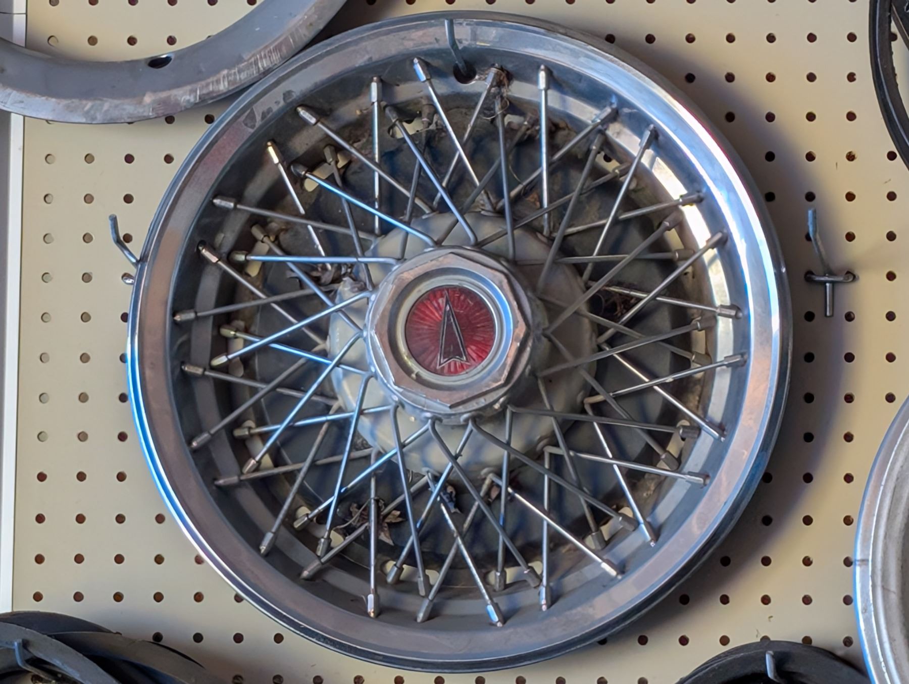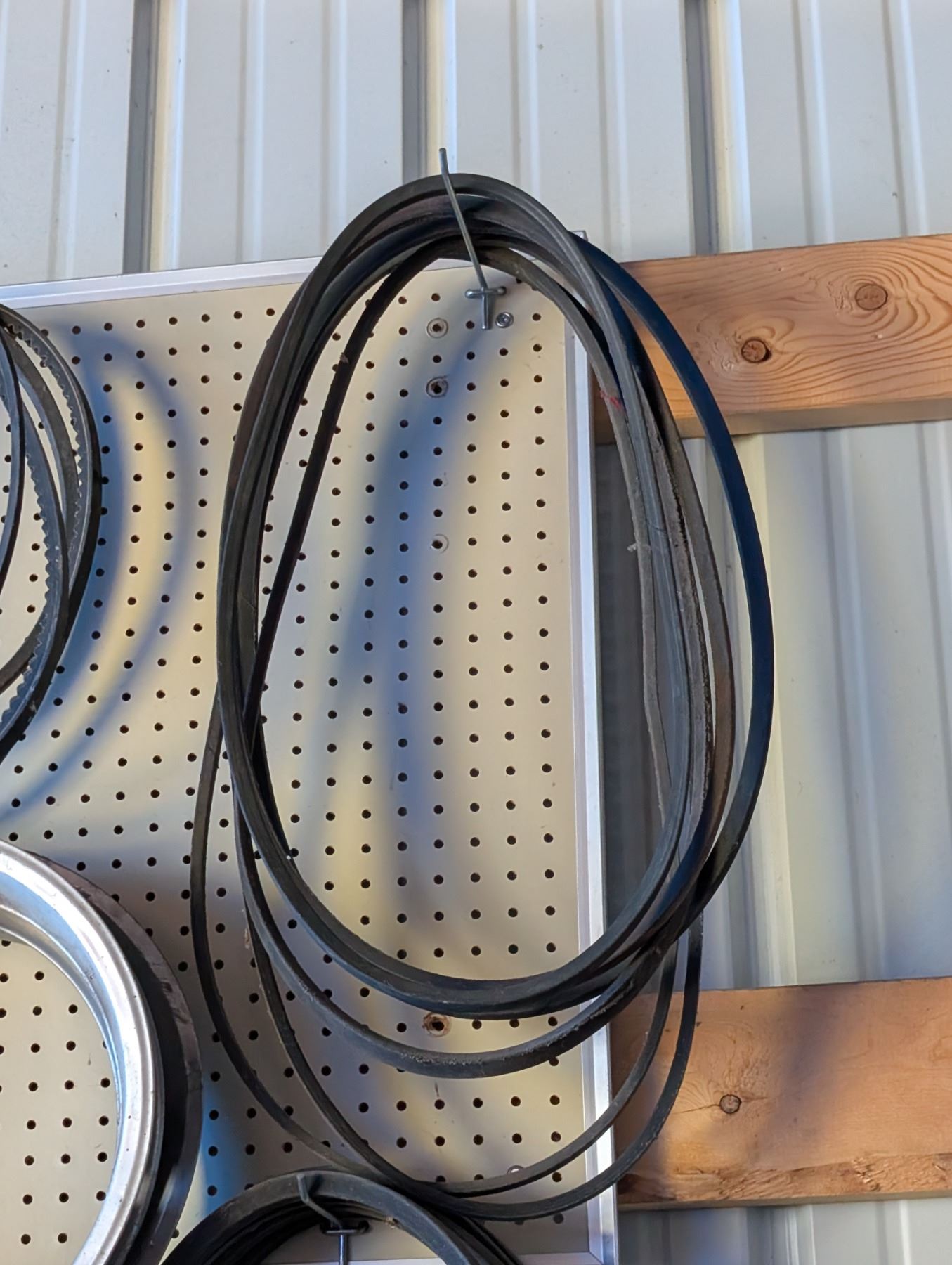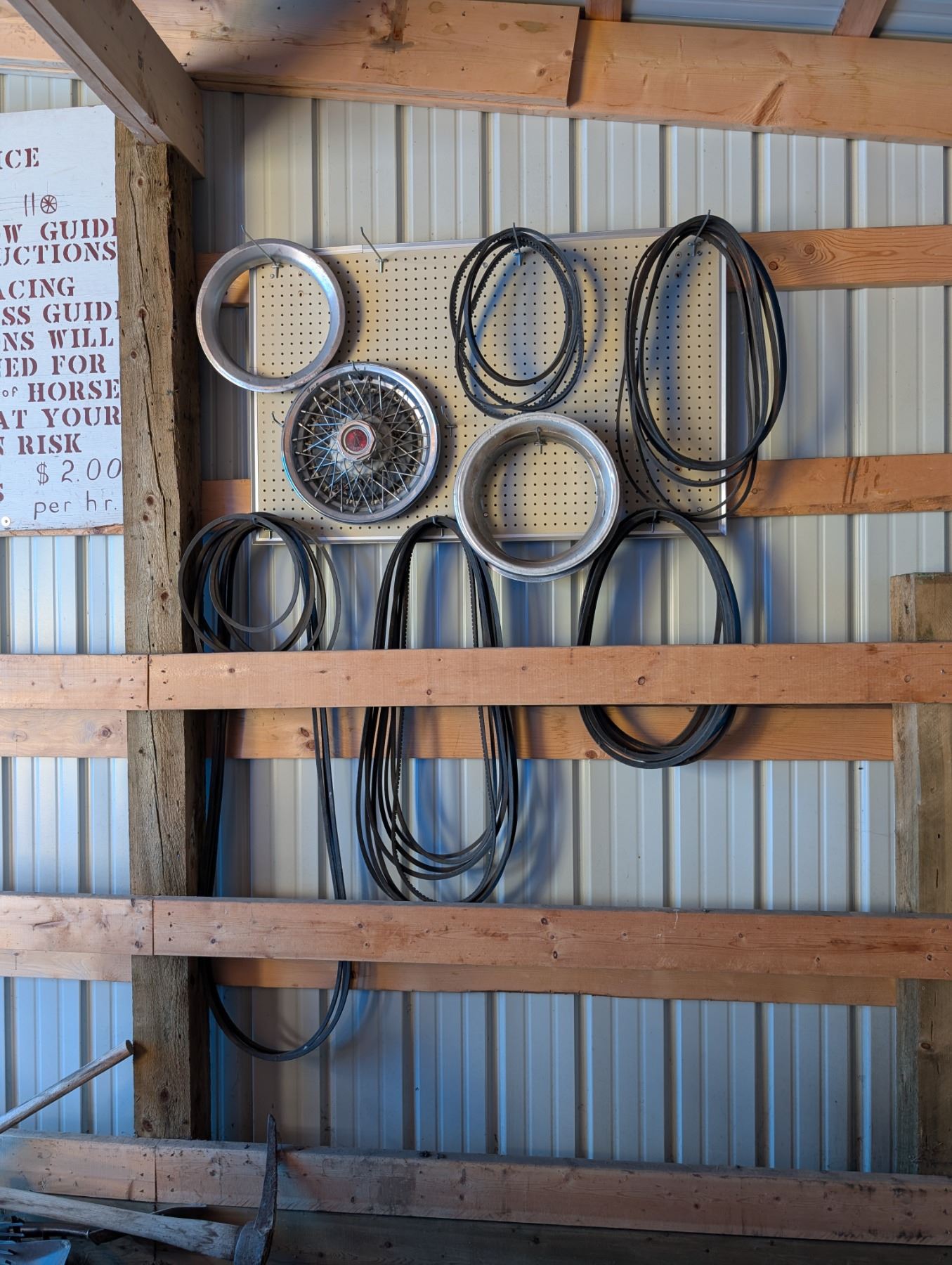 Lot of belts, rims, Wheel Rim Cover, and etc. (Mounted wall not included)