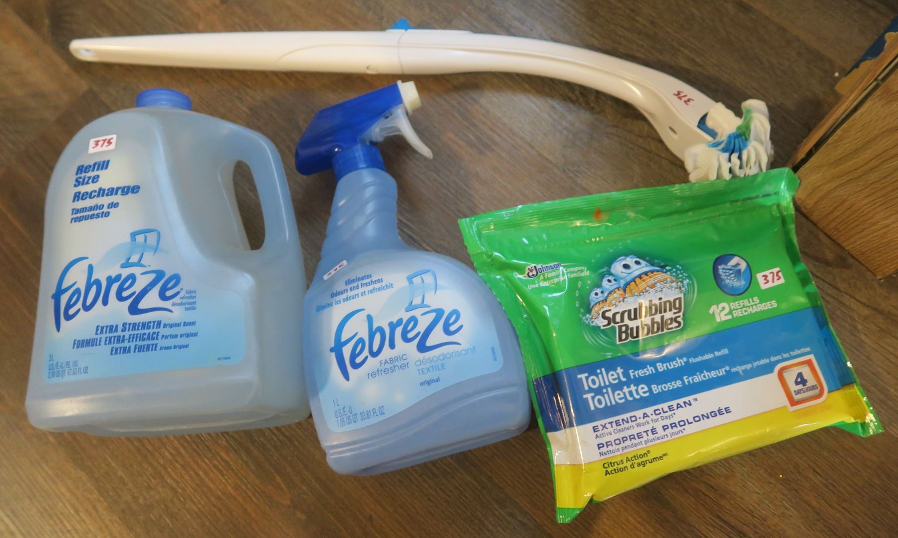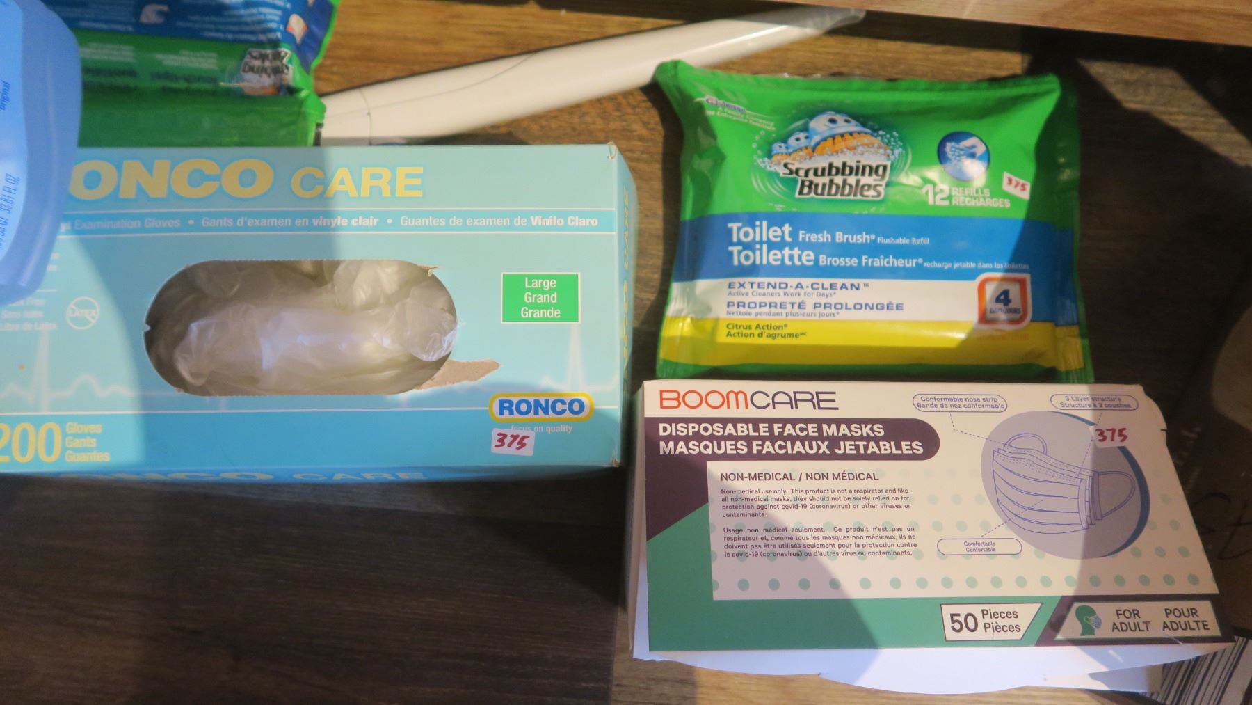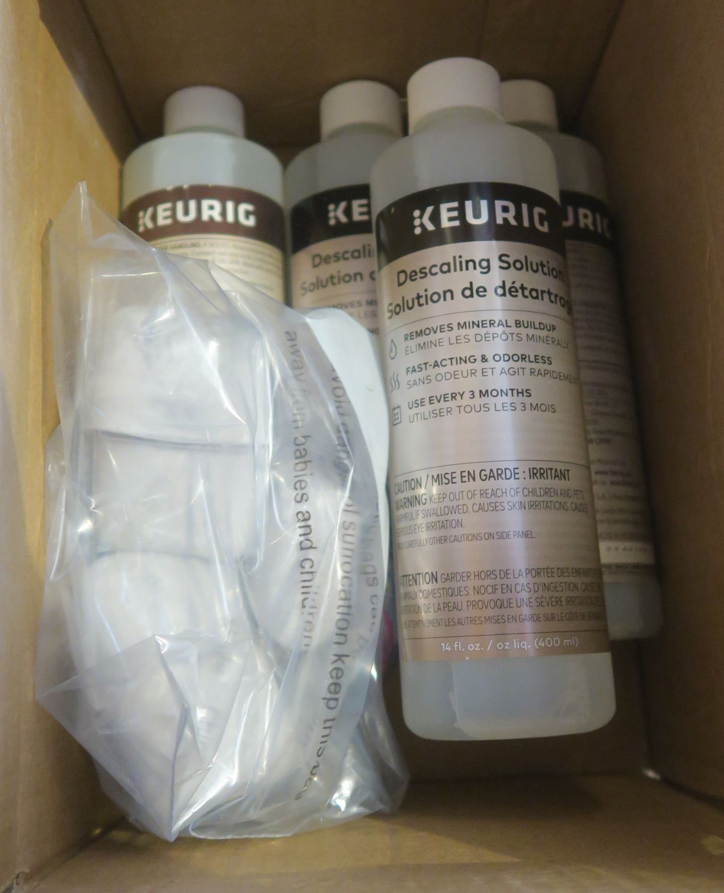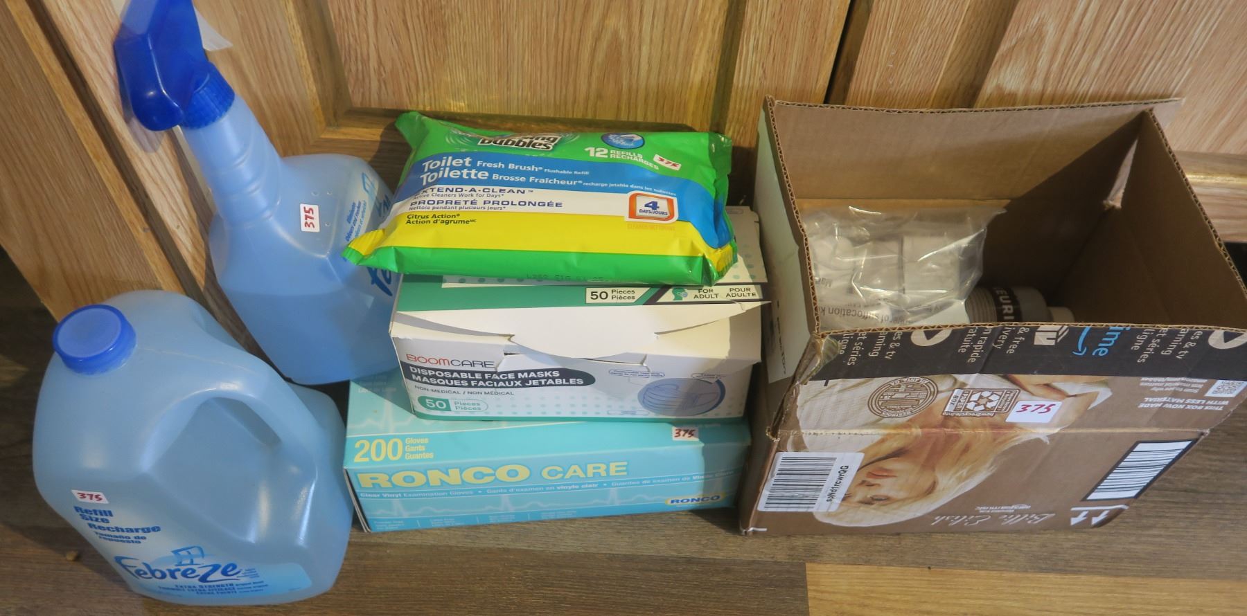 Lot of cleaning supplies (Febreze liquid refill, face masks, Keurig Descaling solution, brush, etc.)