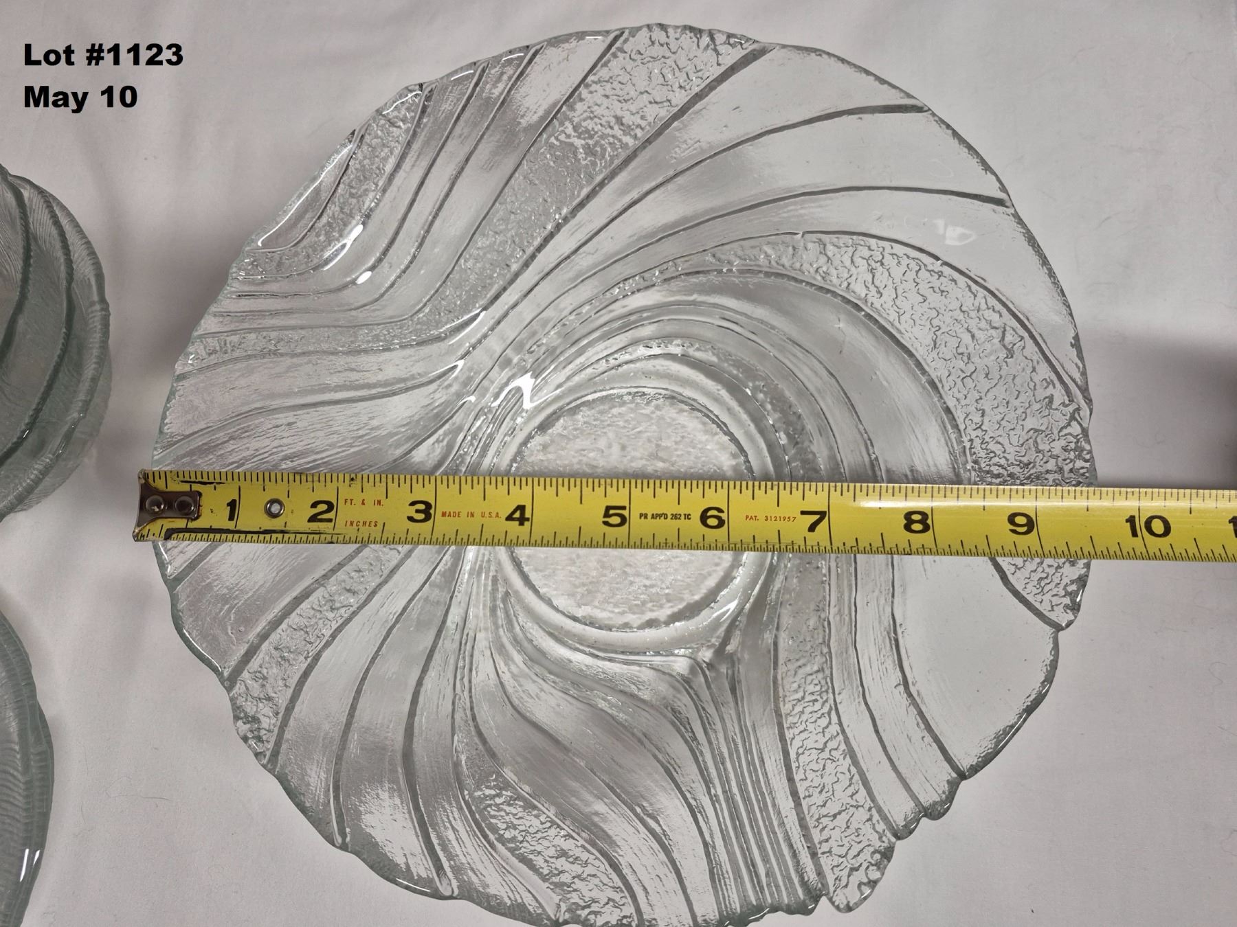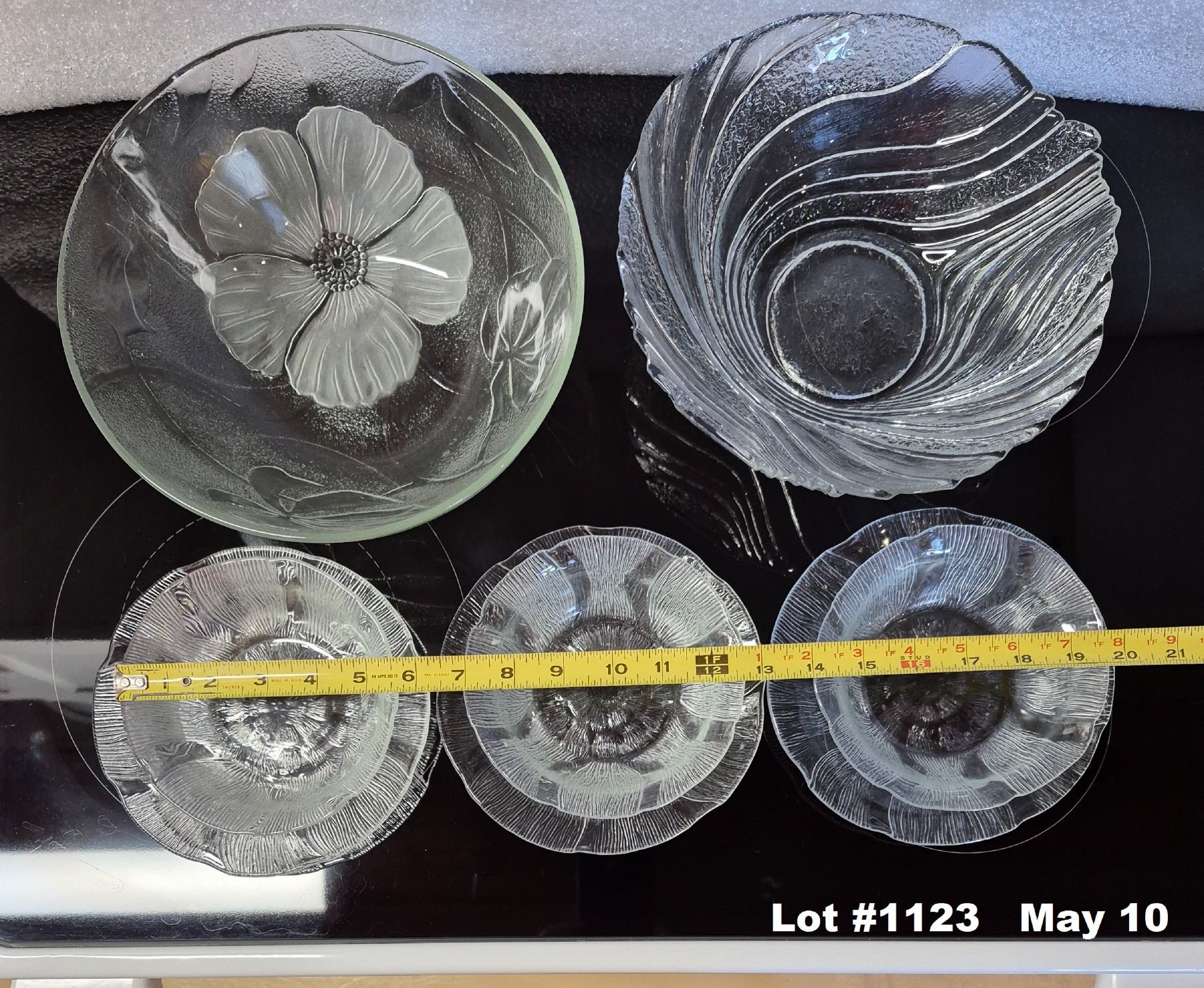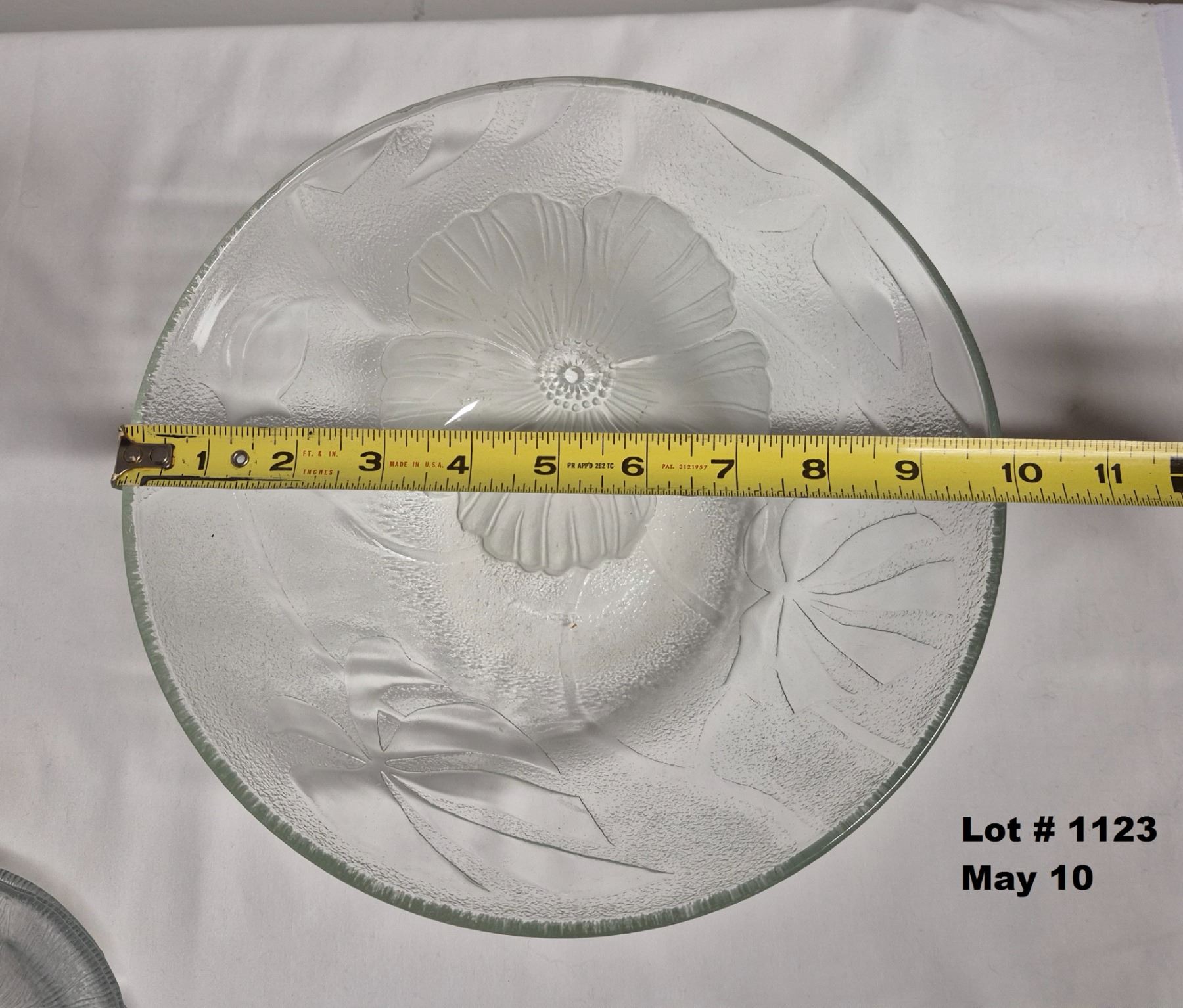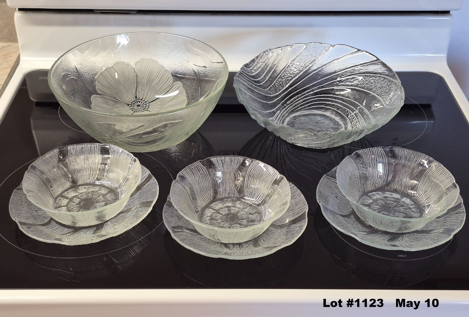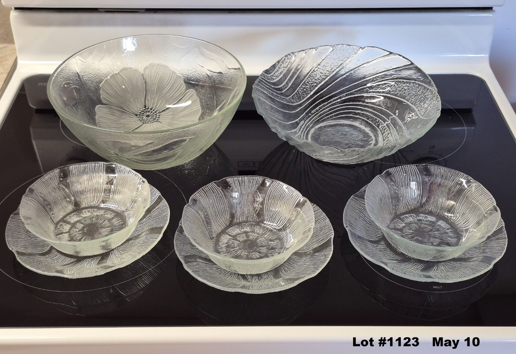 Lot of clear glass bowls and plates. Frosted Hibiscus flowers, Abstract Modern Cracked Ice Swirl.