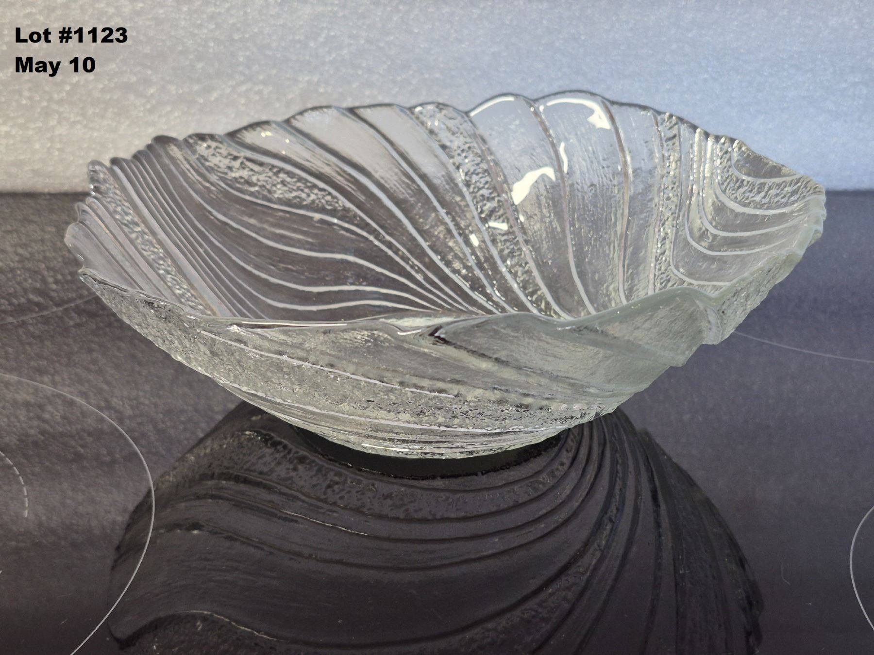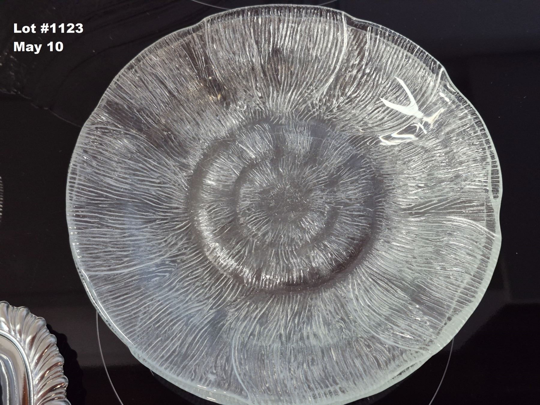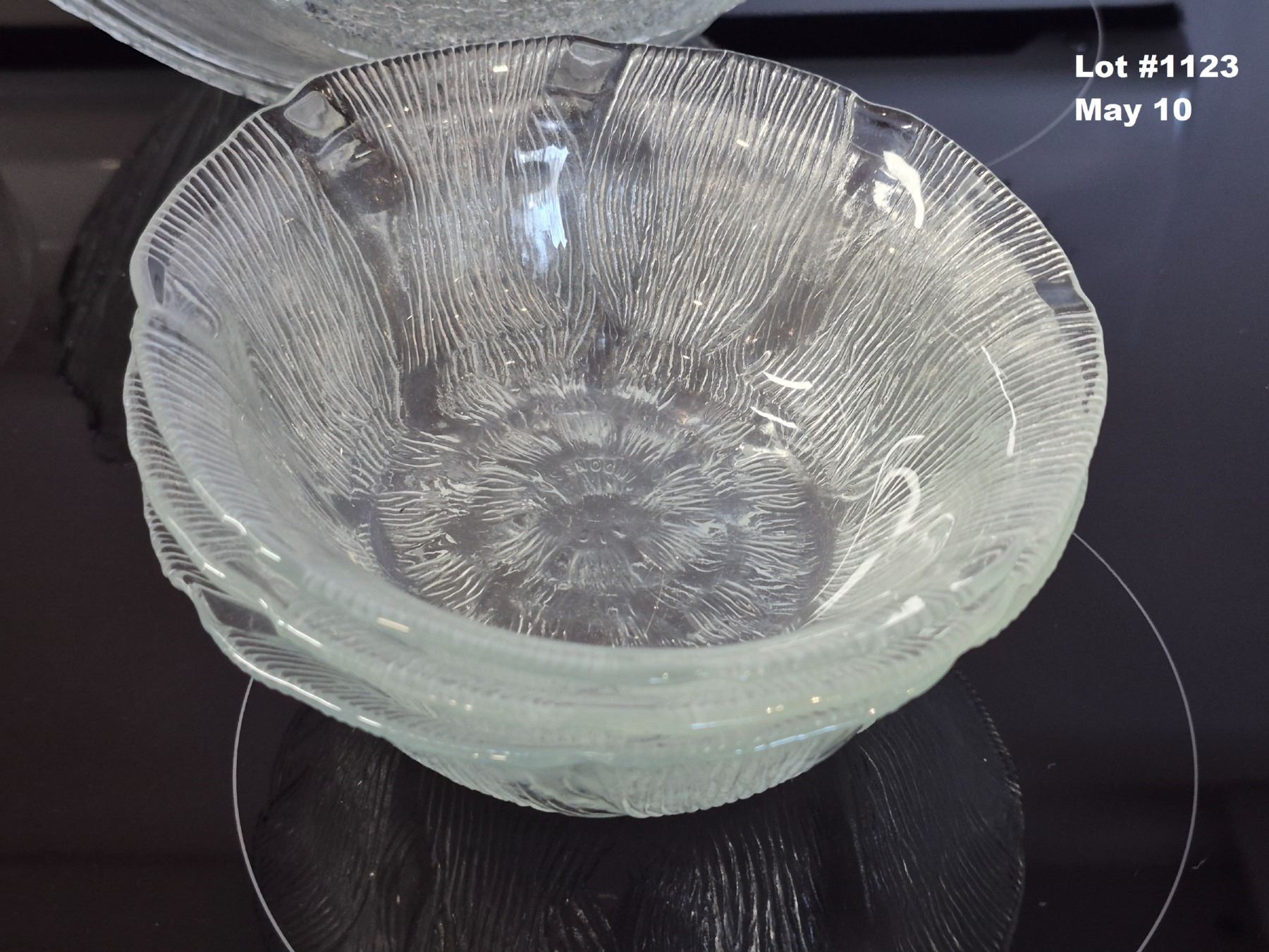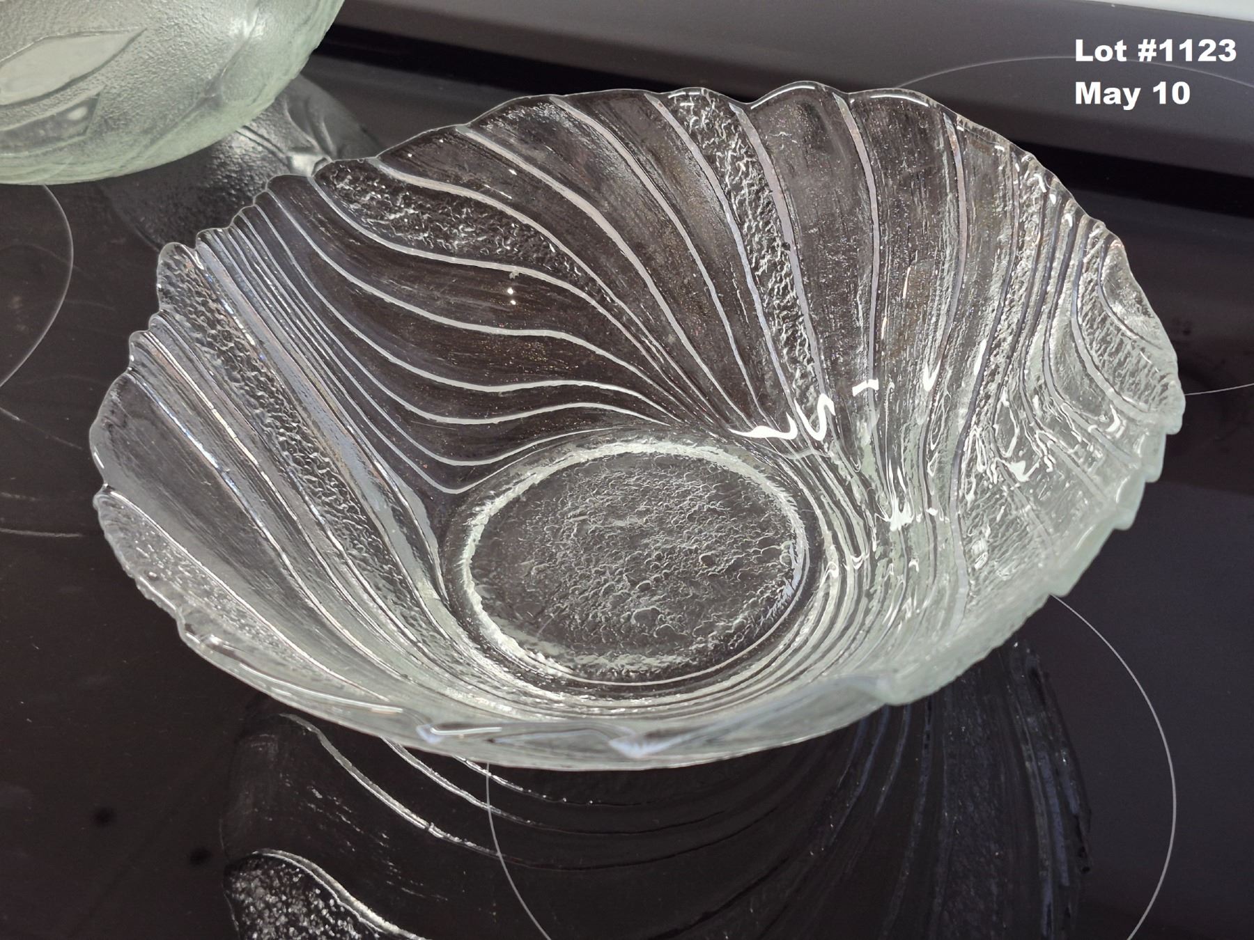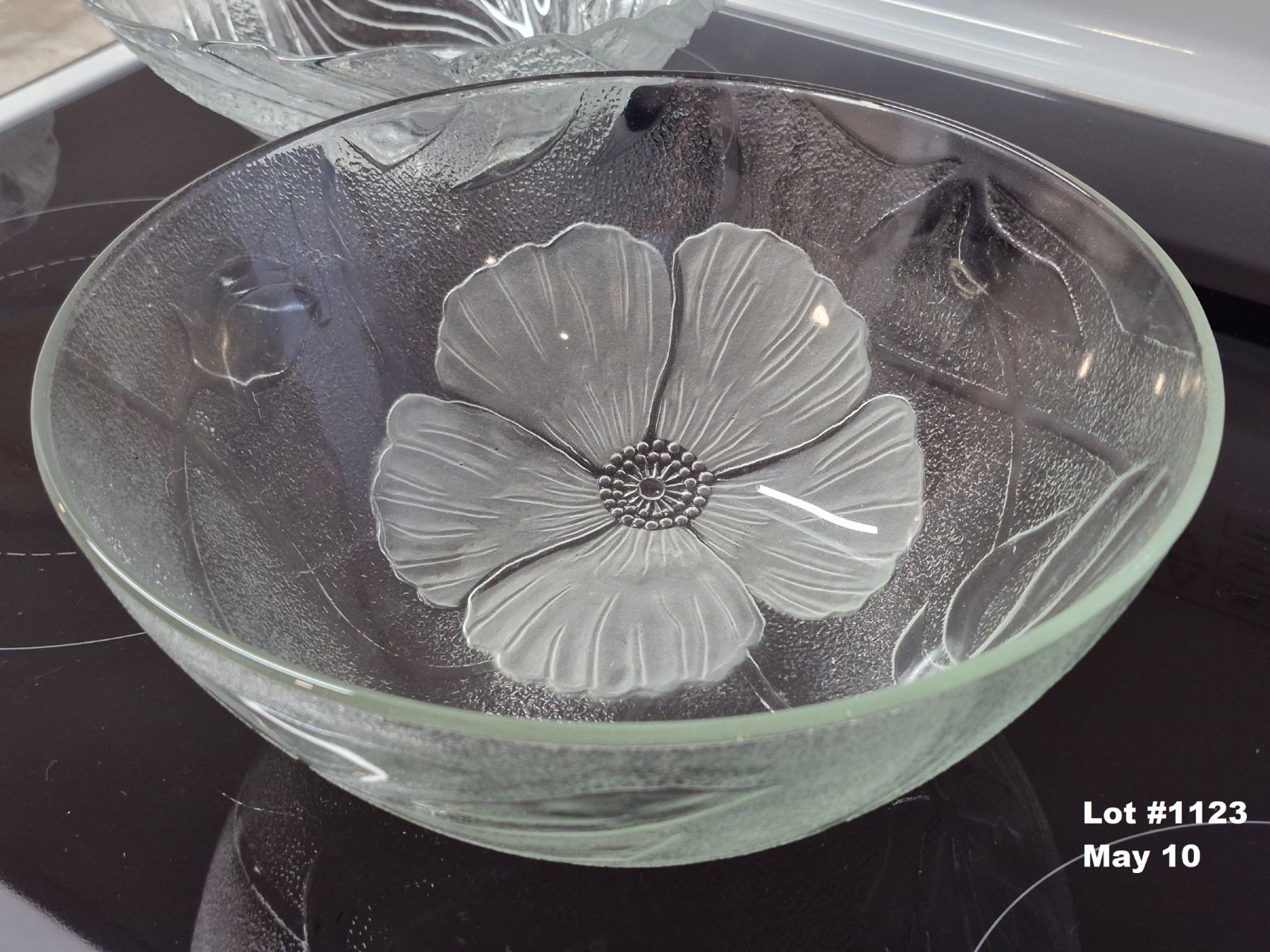 Lot of clear glass bowls and plates. Frosted Hibiscus flowers, Abstract Modern Cracked Ice Swirl.