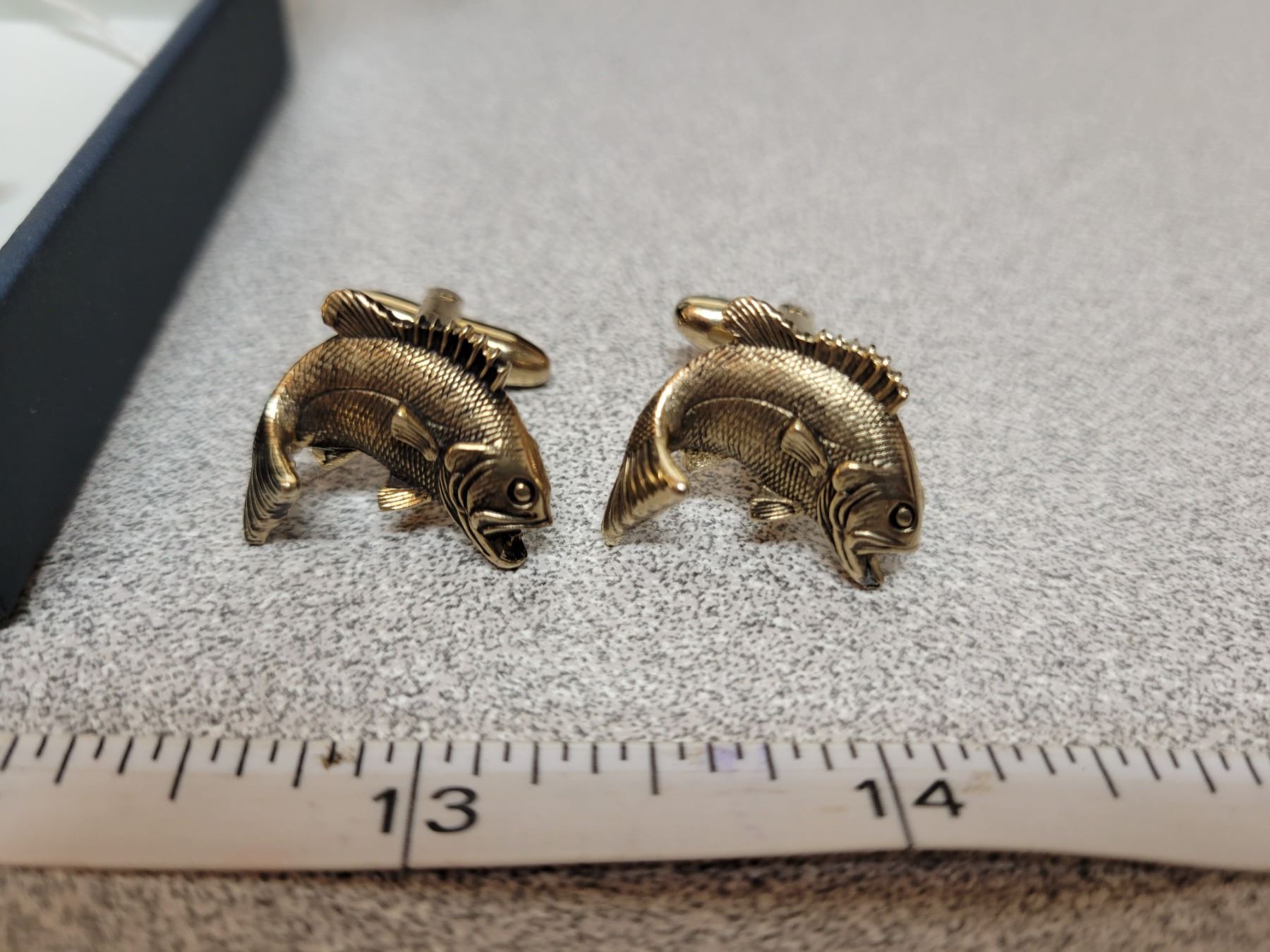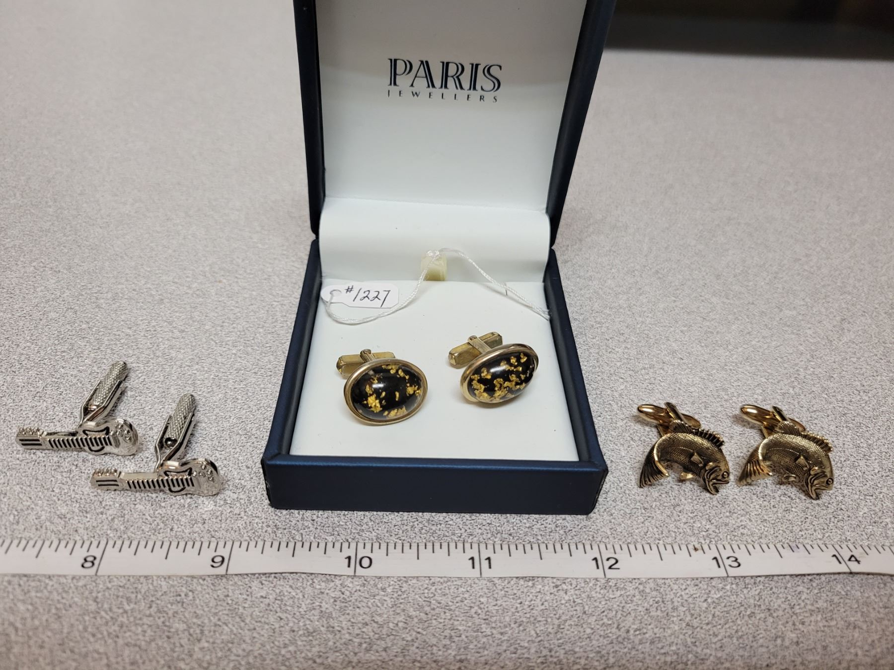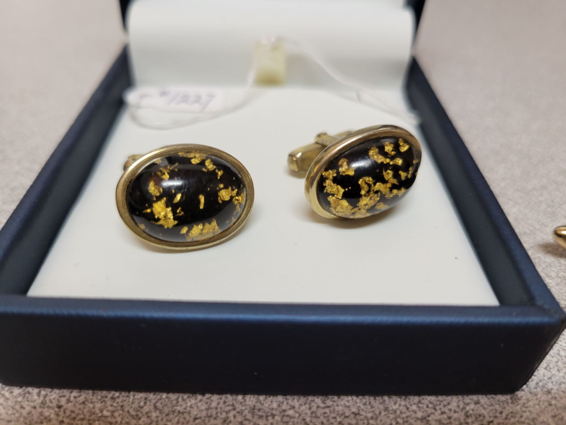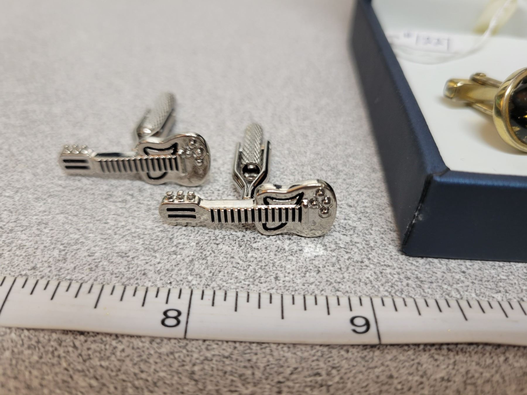 Lot of cufflinks, fish, guitars, gold confetti, marked Anson