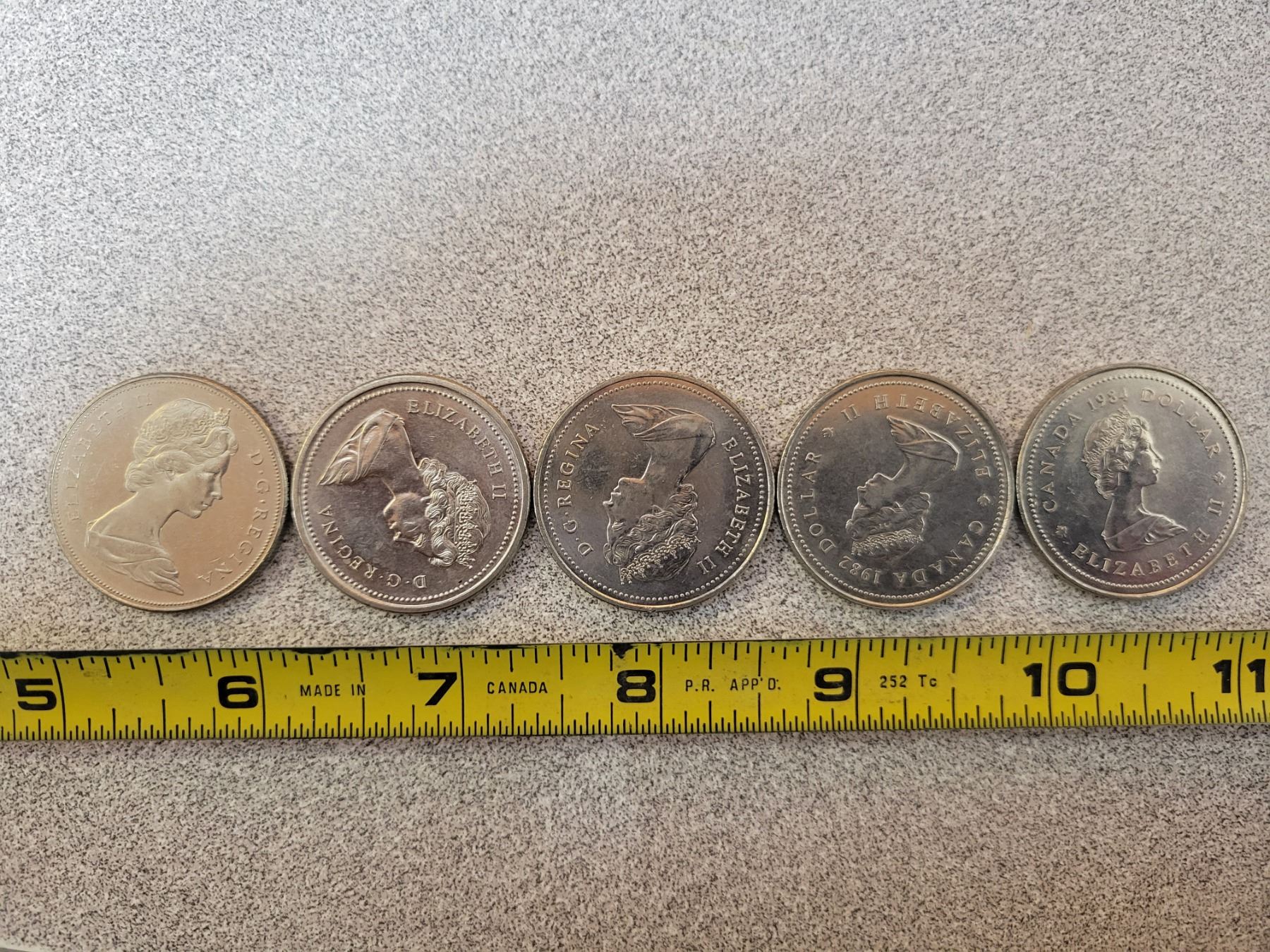 Lot of five Canadian $1.00 nickel dollars - 1970 Manitoba, 1976, 1981, 1982 Confederation, 1984 Jaques Cartier