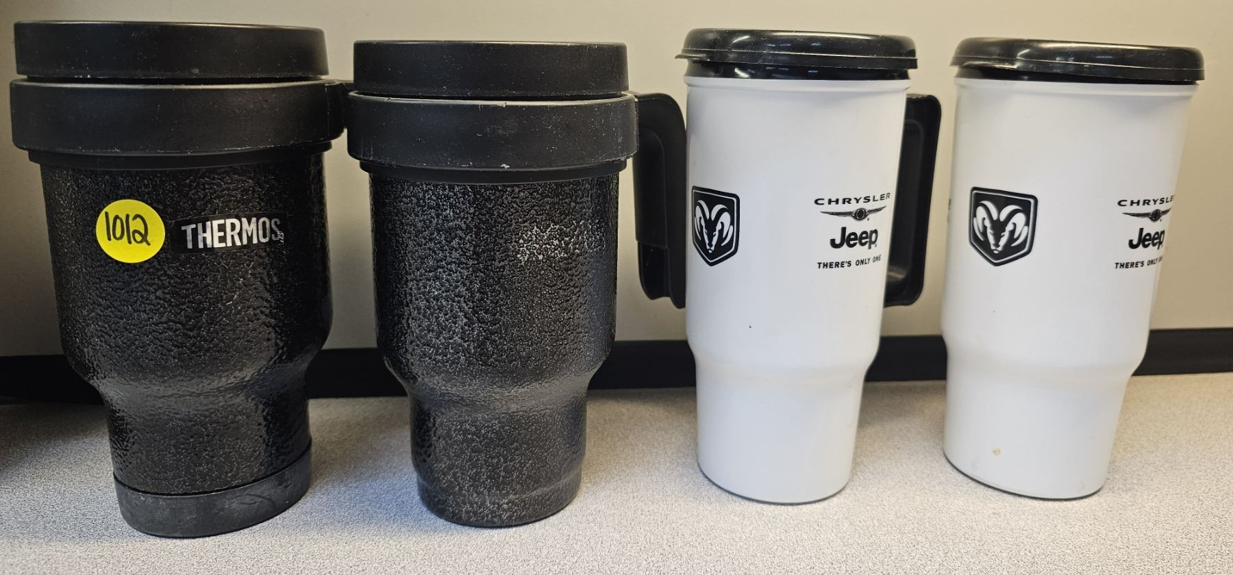 Lot of four travel mugs (2 Thermos) 2 Melfort, SK dealership advertising