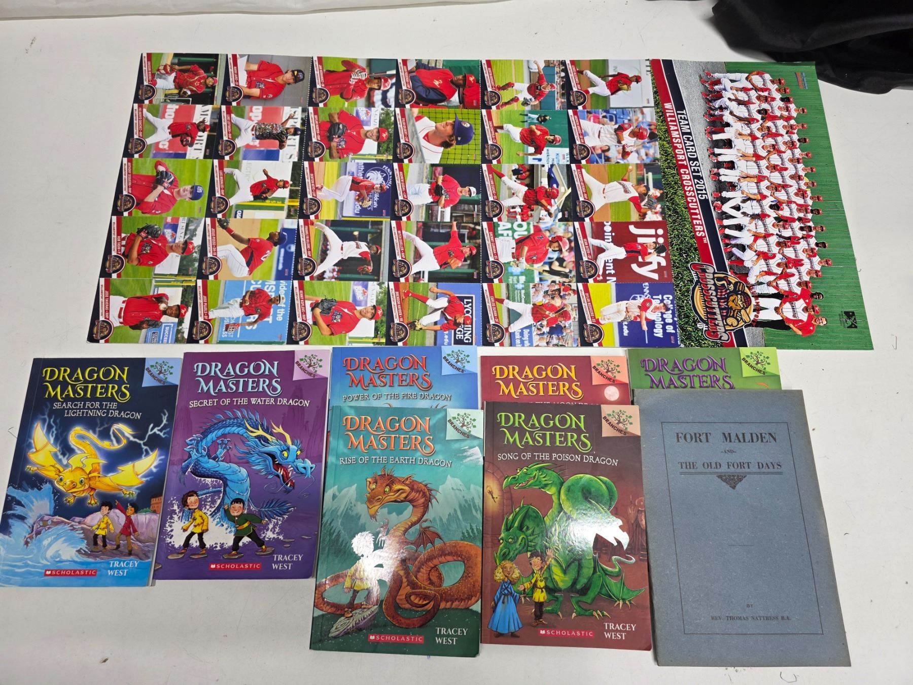 Lot of hockey cards from 2015- uncut and children's books with a copy of fort malden book