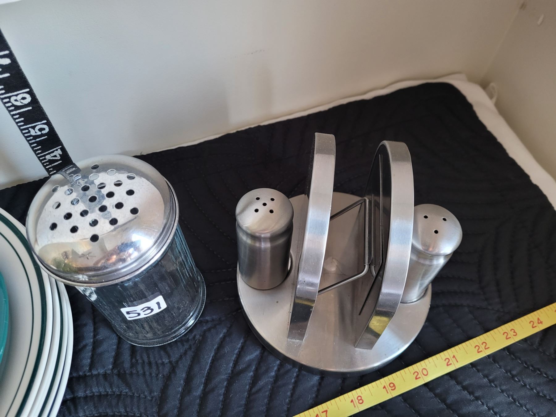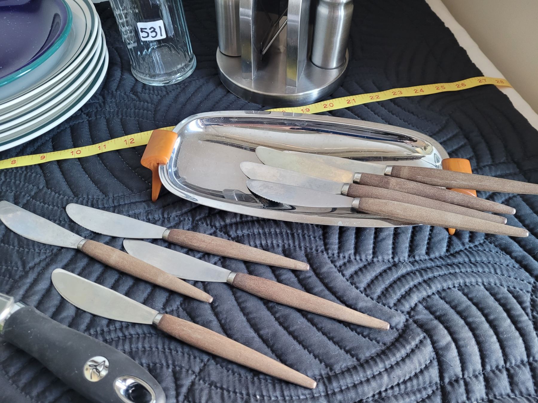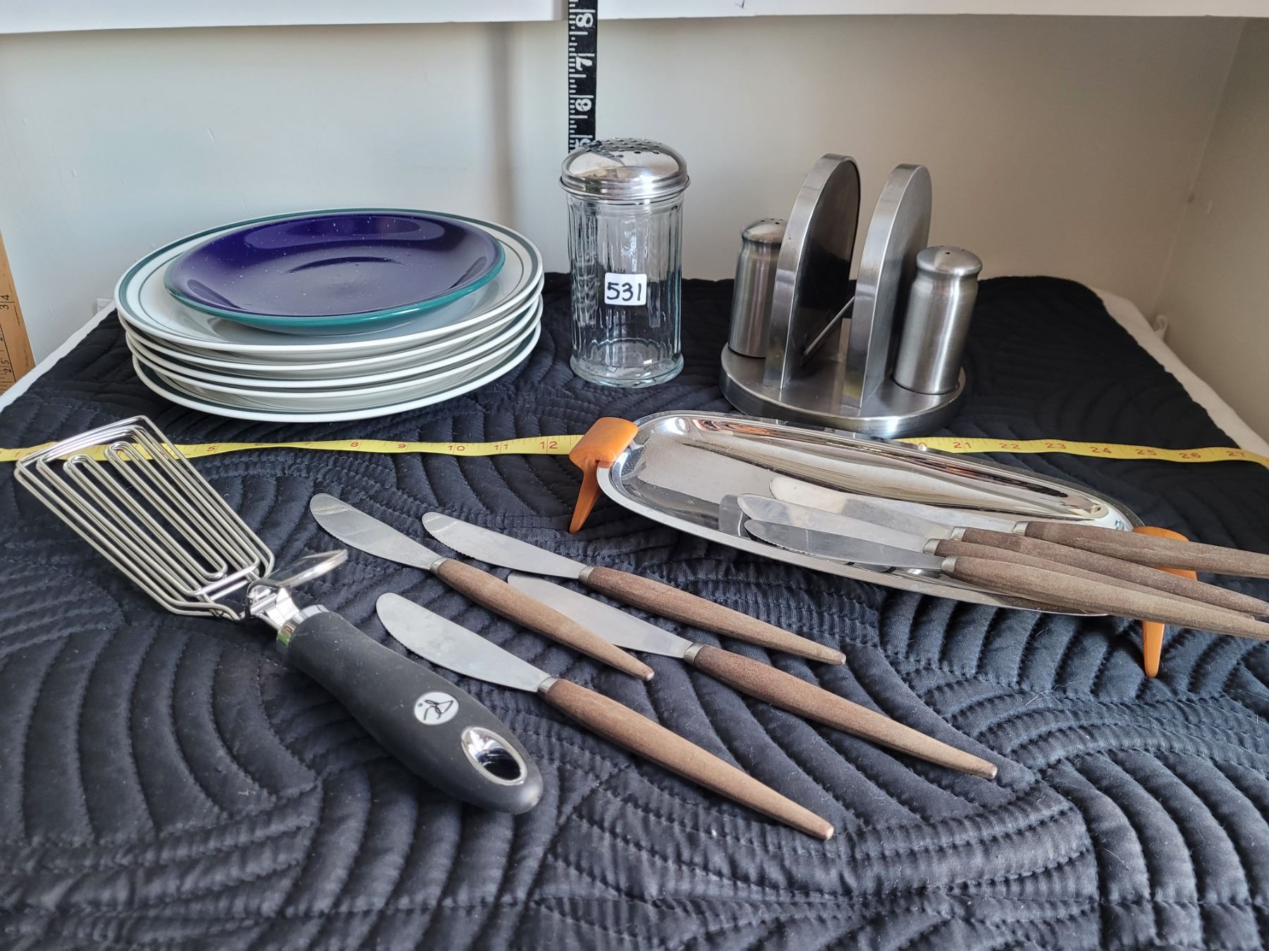 Lot of kitchen essentials. Includes vintage butter knives, stainless salt & pepper, sugar napkin set, knife, plates,flipper & pickle dish.