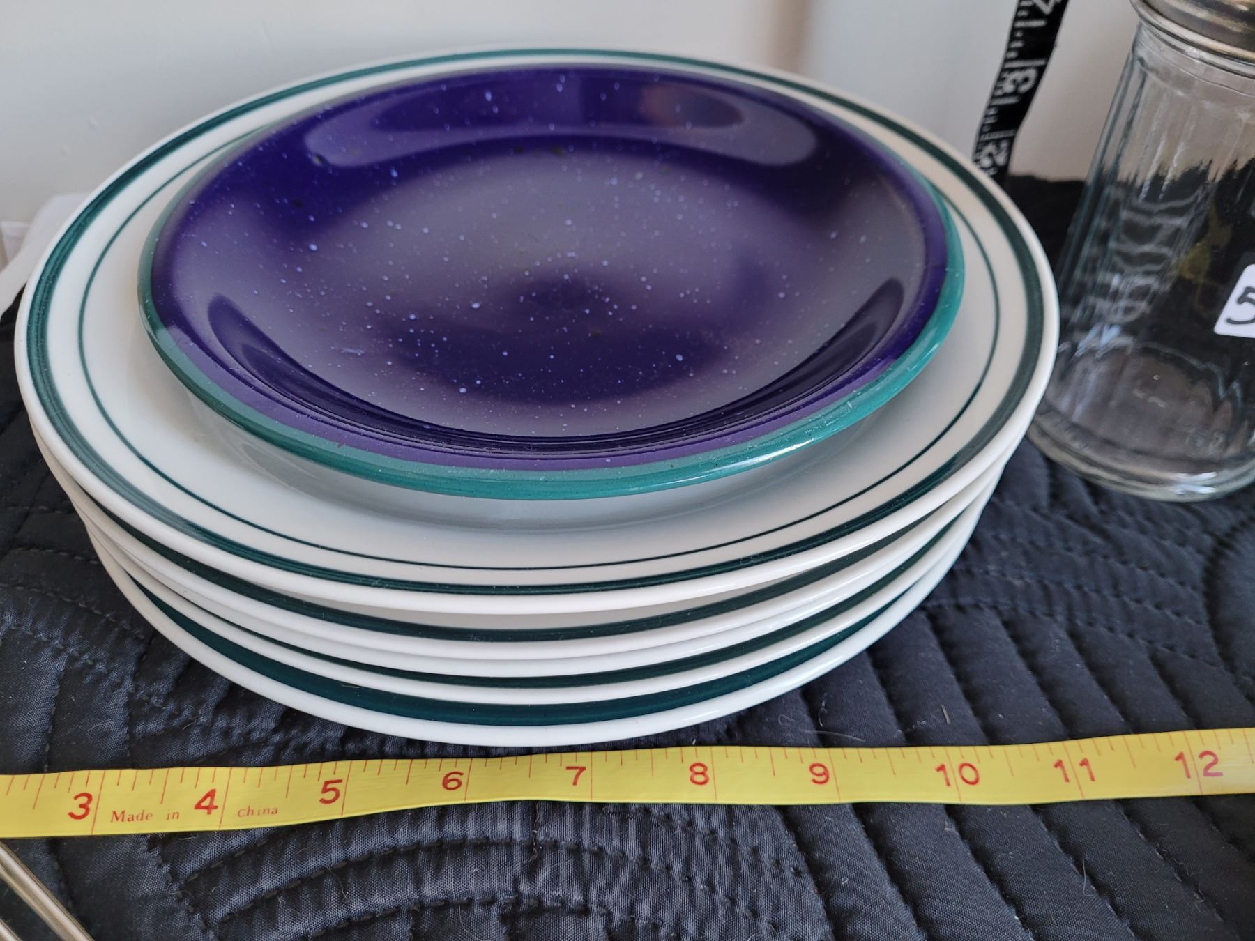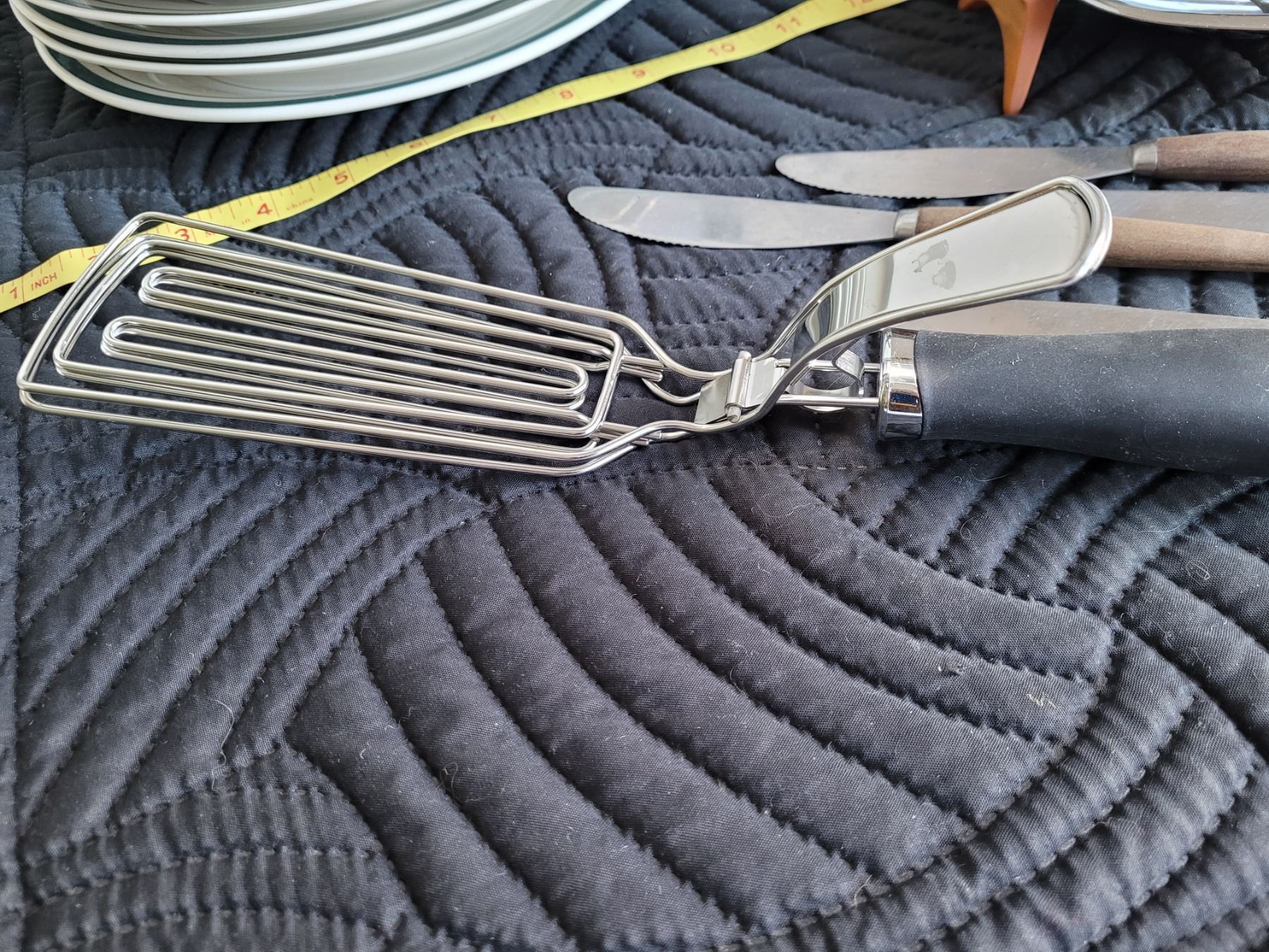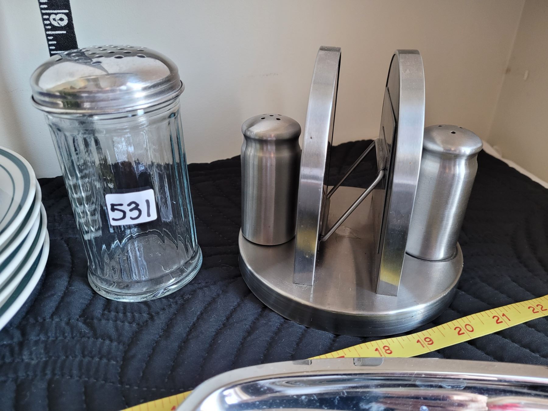 Lot of kitchen essentials. Includes vintage butter knives, stainless salt & pepper, sugar napkin set, knife, plates,flipper & pickle dish.