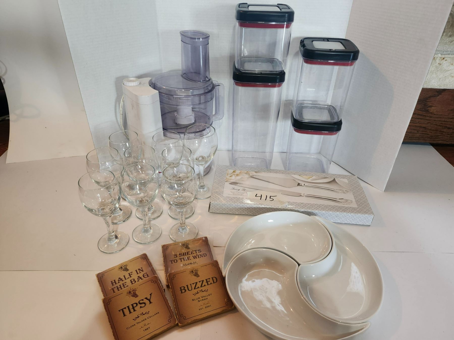 Lot of kitchenware: 9 wine glasses, food processor, T-Fal food storage containers