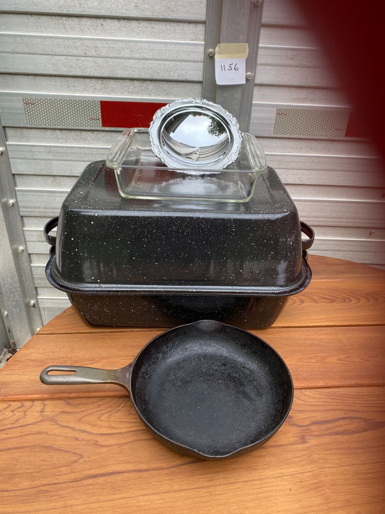 Lot of kitchenware - large roaster, 9" cast iron pan, 8" Pyrex cake pan, silver candy dish