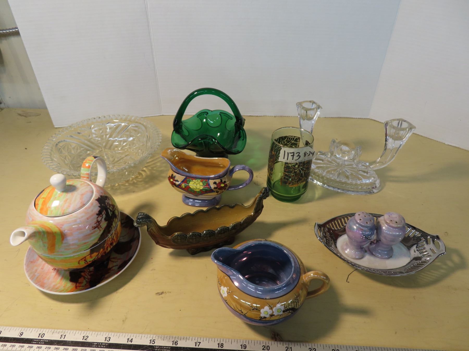 Lot of tea cup, candle holder, green basket and glass bowl