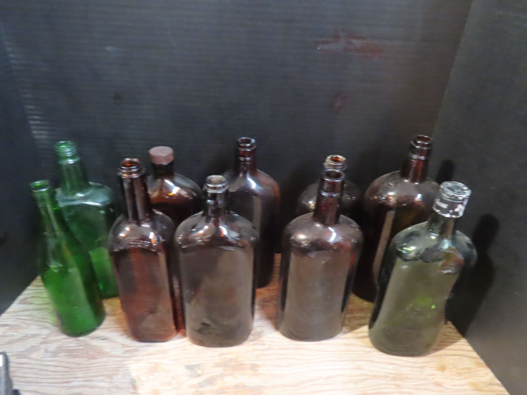 Lot of vintage dark olive green coloured and brwon glass whisky bottles