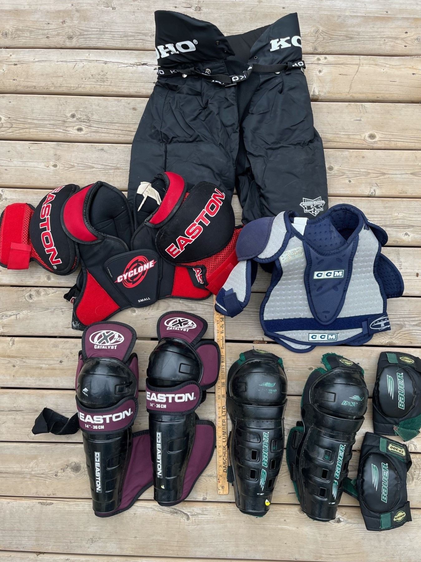 Lot of youth hockey equipment. Koho pants for 30 to 32 inch waist, 2 sets of shin pads (Easton and Bauer), 2 sets of shoulder pads (Easton and CCM) and Bauer elbow pads.