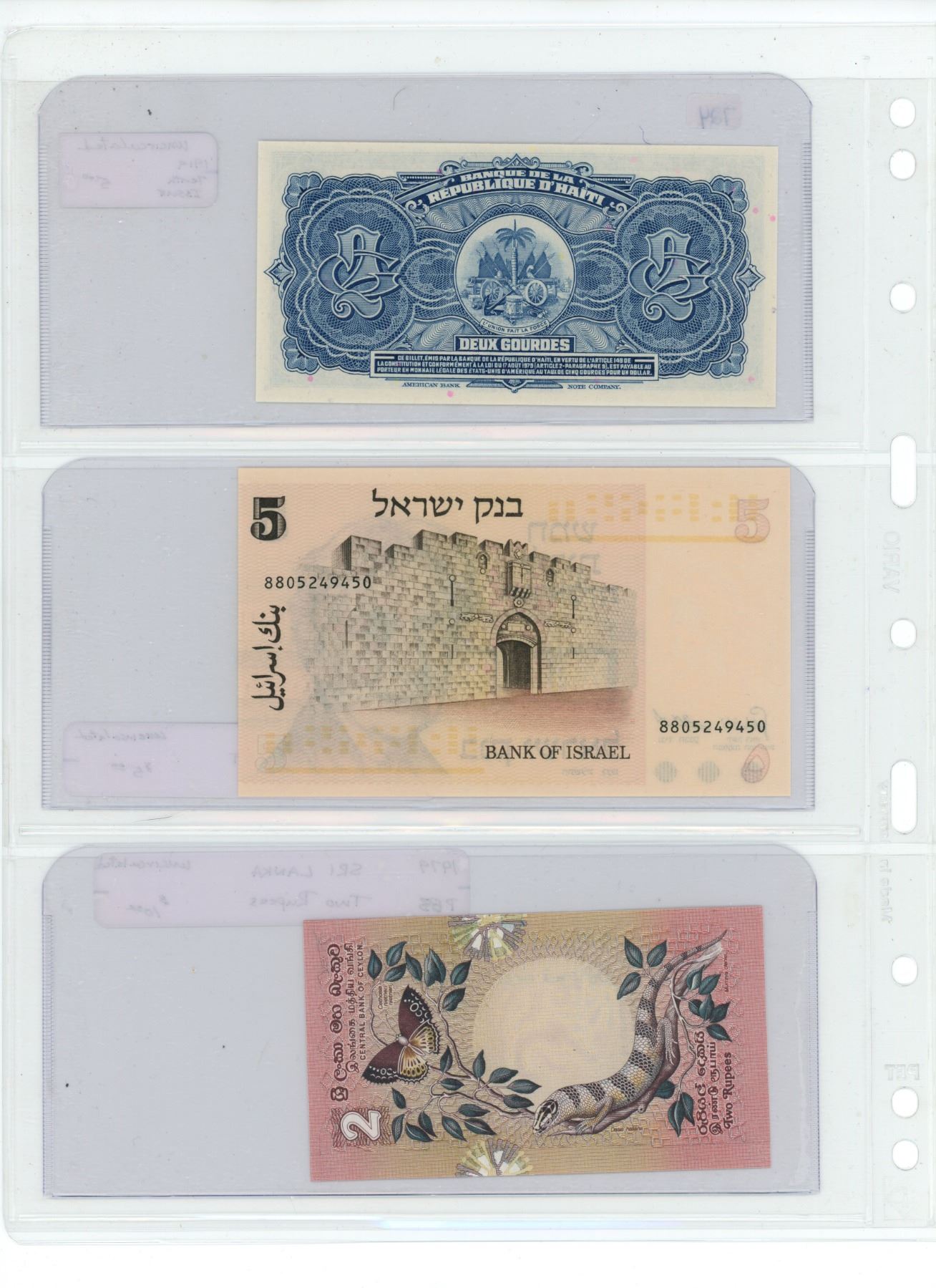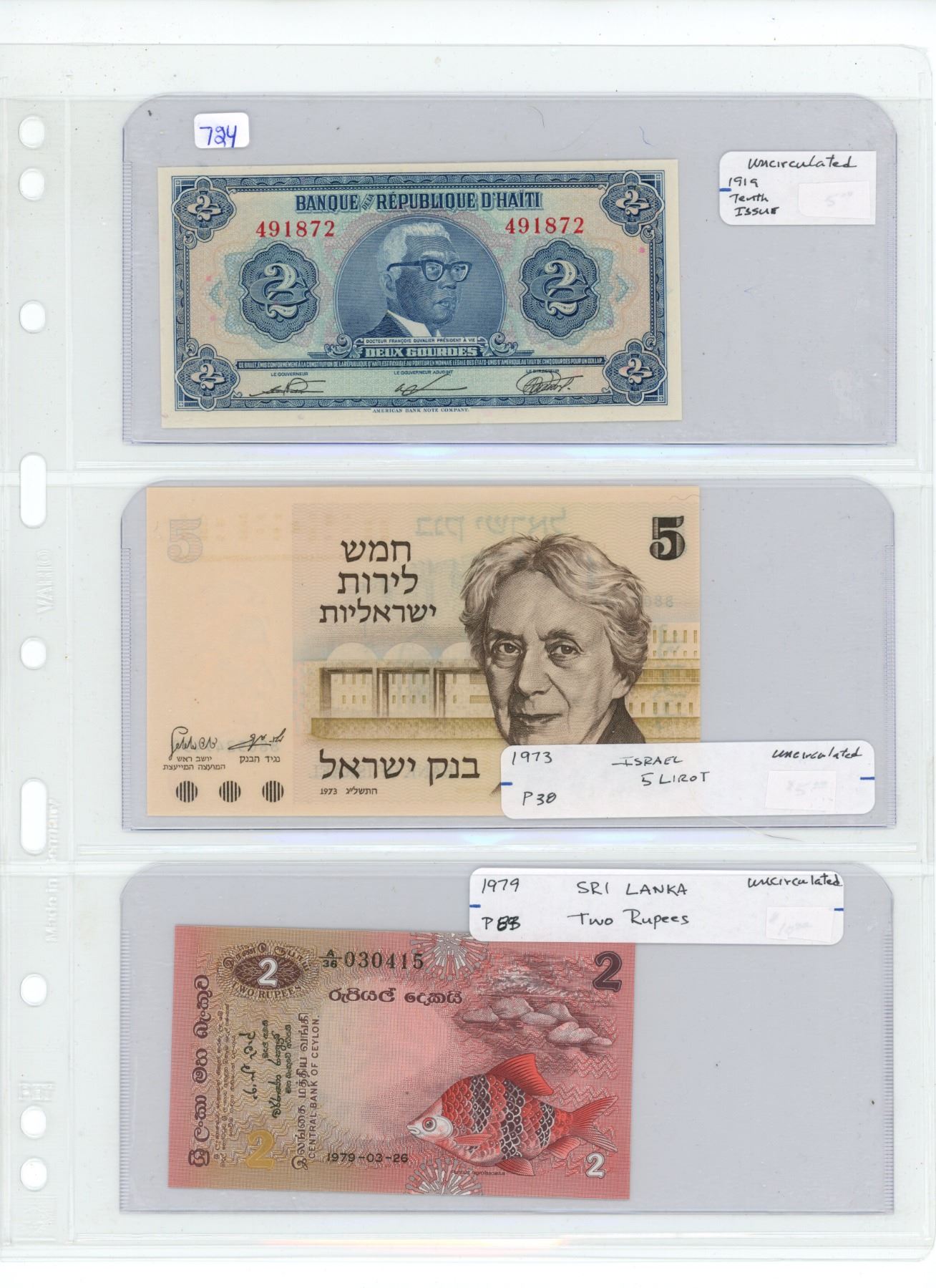 Lotof 3- 1919 haiti 2 gourdes, 1973 isreal 5 lipot and 1979 sri lana two rupee -all uncirculated